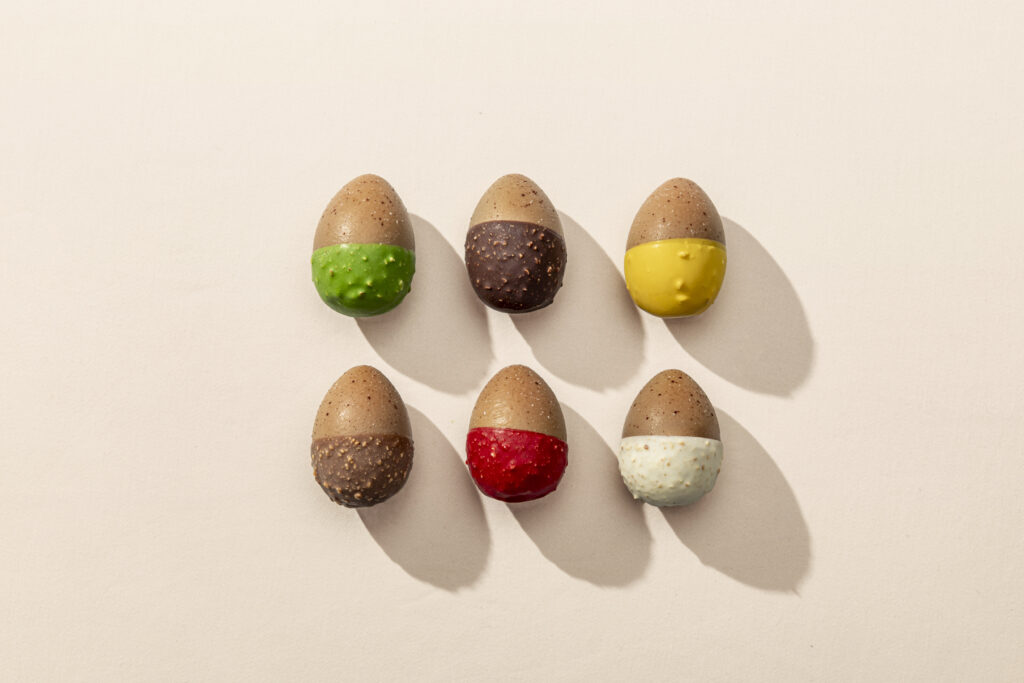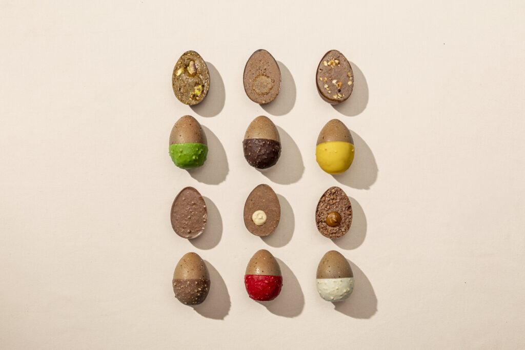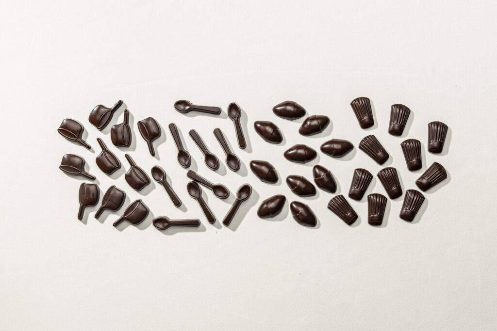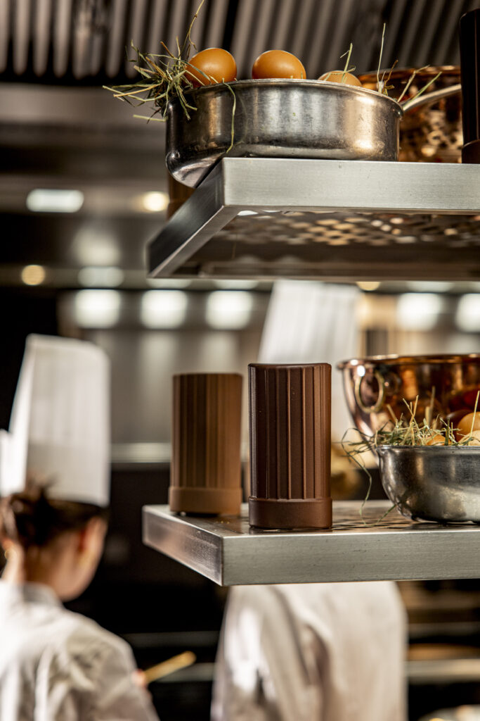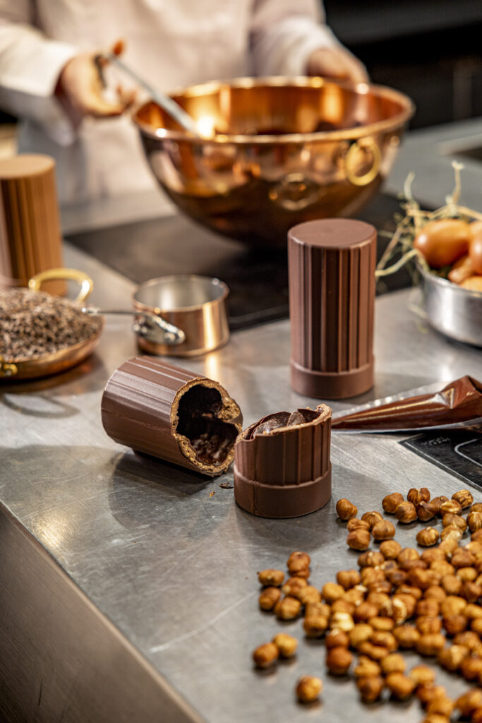 Une seconde proposition, strictement calibrée à 275 grammes, reprend la forme exclusive de cette toque. L’espace intérieur, protégé par la coque de cacao, est utilisé comme contenant pour une série de mignardises, rappelant le service des fins de repas gastronomiques. Enfin, six pièces de 80 grammes aux textures différenciées viennent compléter la sélection.