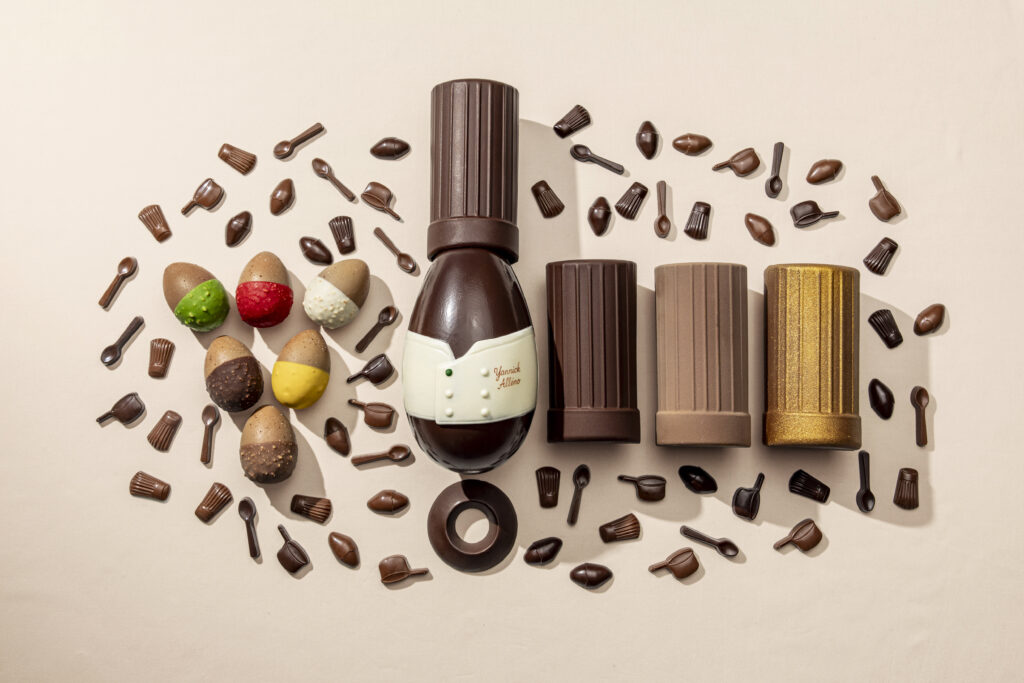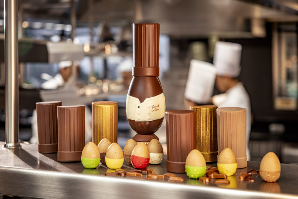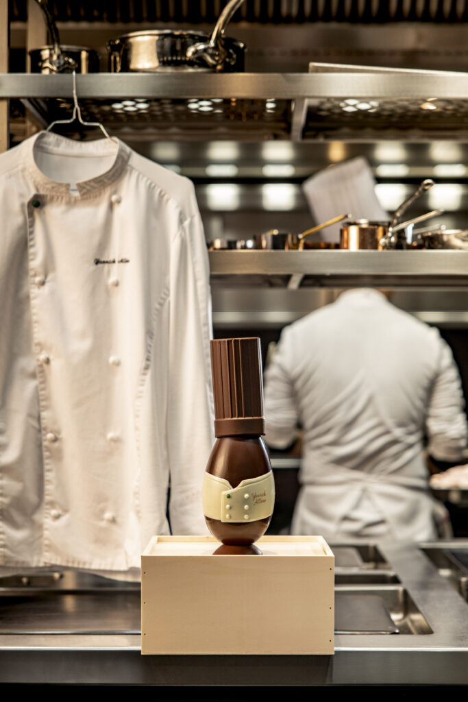 Pour Pâques 2026, les codes vestimentaires et matériels de la Maison Yannick Alléno se muent en objets de dégustation. Une lecture littérale de la gastronomie où l’uniforme devient la structure porteuse du chocolat.