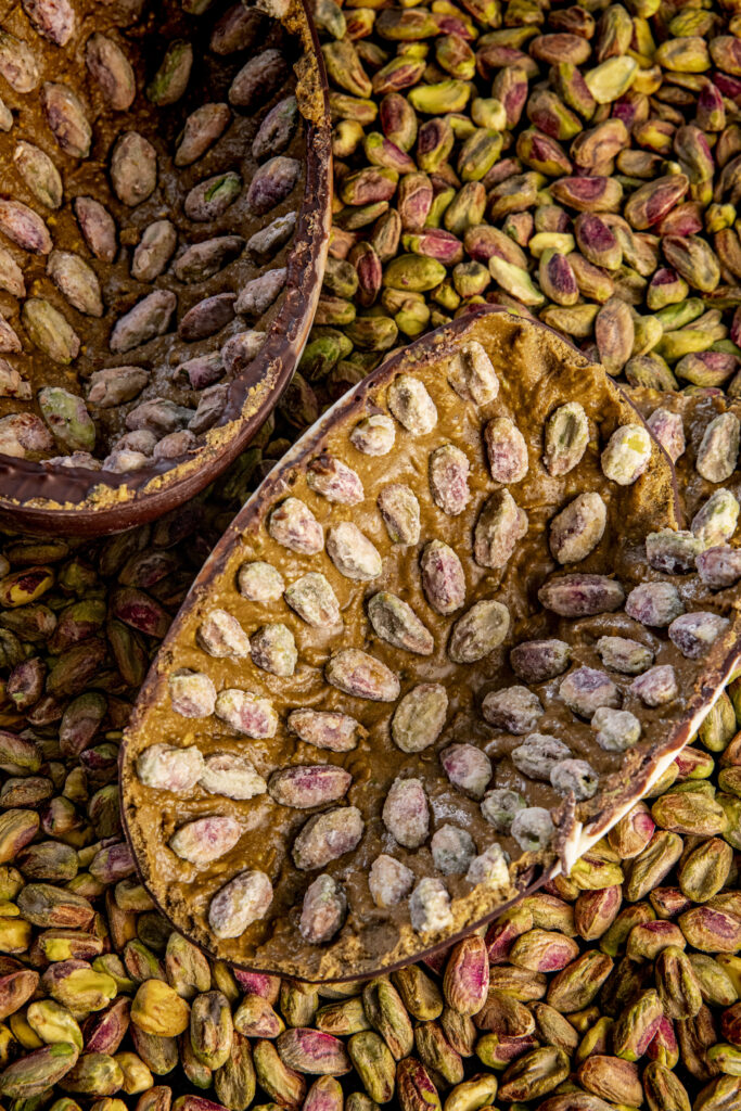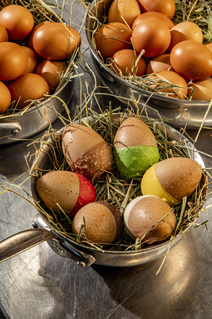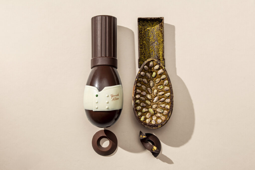 La pièce centrale de cette proposition de 2026, nommée l’Œuf Toqué, repose sur un équilibre de 600 grammes. Le choix de la couverture s’est arrêté sur un chocolat noir à 55 % dont les fèves proviennent d’Équateur. Cette base astringente est architecturée autour d’une double origine de fruits secs : des pistaches importées d’Iran pour leur intensité chromatique et de Sicile pour leur profil aromatique. La partie supérieure de l’objet, une toque amovible, agit comme un couvercle fonctionnel.
