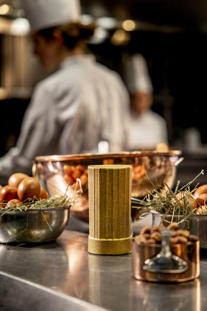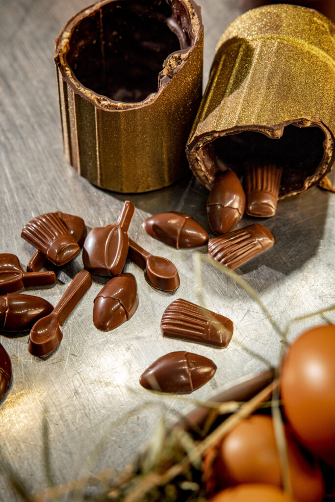 La transition de la haute cuisine vers la chocolaterie exige souvent une redéfinition des volumes. Au sein du Pavillon Ledoyen, l’exercice de Pâques a été pensé non pas comme une déclinaison de motifs printaniers, mais comme une transposition de l’environnement immédiat de la brigade. Les outils de cuisson et les attributs du cuisinier servent ici de matrices de moulage.