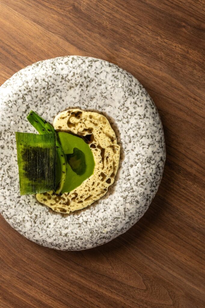 Le curriculum de Tinchant éclaire la vitesse. Dix ans d’apprentissage dans quatre maisons de niveaux croissants : Guillaume Sourrieu à l’ex-Épuisette pour les fondamentaux du produit marin ; Julien Diaz chez Saisons pour la gestuelle instinctive ; Sylvestre Wahid à Courchevel pour la technicité des sauces et les alliances épicées ; Dimitri Droisneau à La Villa Madie — trois étoiles, Cassis — pour ce que la Méditerranée peut atteindre comme niveau d’exigence. Ce n’est pas un parcours construit pour la notoriété rapide : c’est une stratification méthodique des registres techniques.