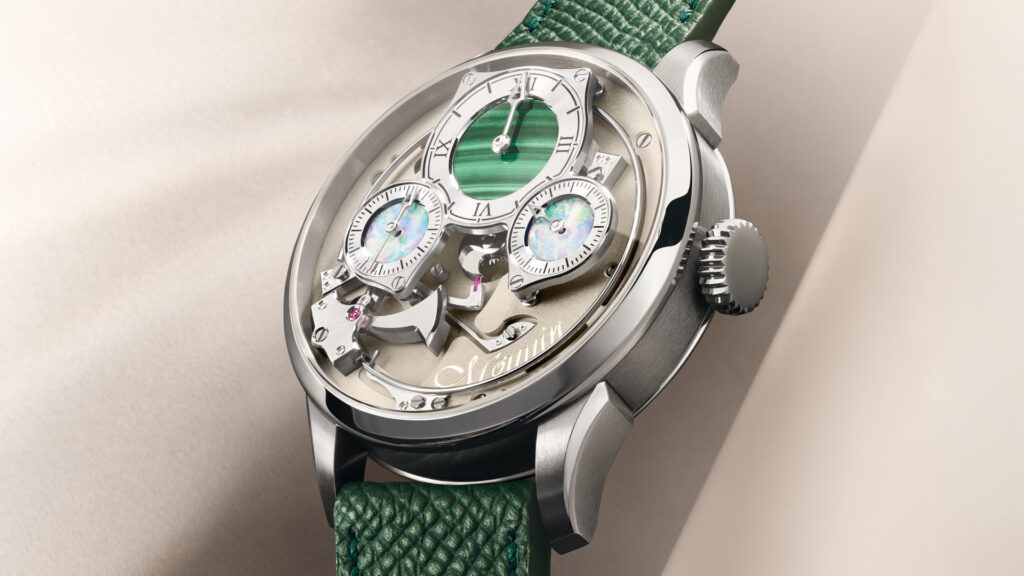 Hazemann le dit sans détour : « Nous voulions que les finitions aient une réelle pertinence, que l’on puisse prendre le temps d’admirer tout le mécanisme. » La phrase vaut pour la sonnerie comme pour le reste. La Montre Ecole se décline en deux interprétations distinctes, chacune construite autour de la sensibilité de l’un des deux fondateurs. La version Hazemann travaille l’expression technique — les touches de bleu caractéristiques des aciers traités thermiquement, une lisibilité du mouvement pensée comme démonstration. La version Monnin choisit la pierre naturelle : malachite, opale. Des matériaux dont la découpe impose des contraintes que le métal ne connaît pas — fragilité à l’usinage, hétérogénéité de la masse, adhérence au support.