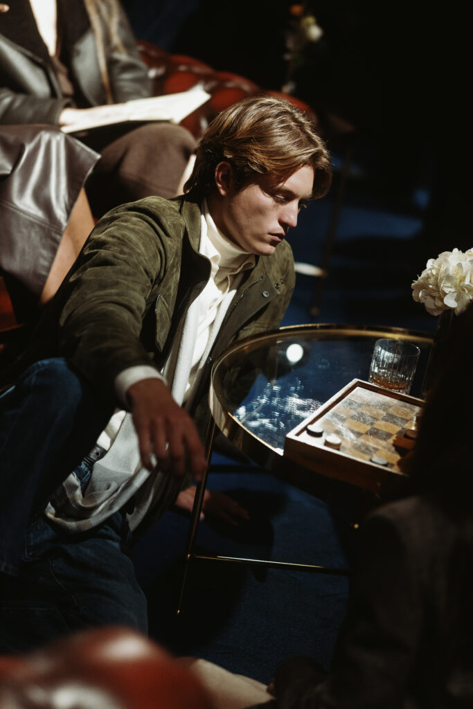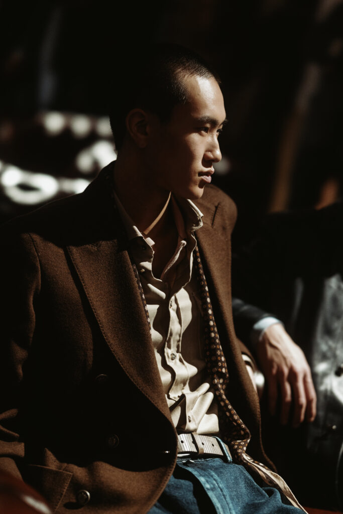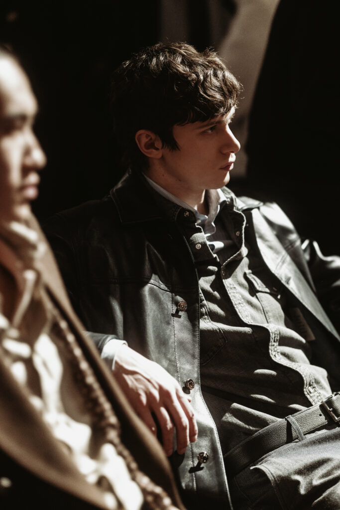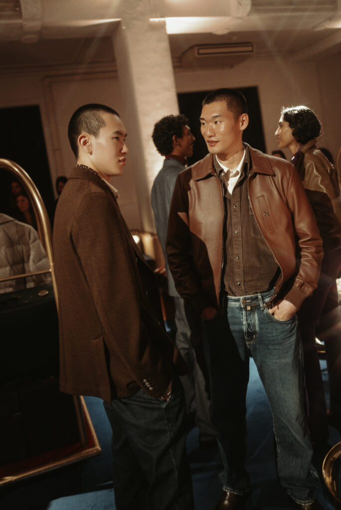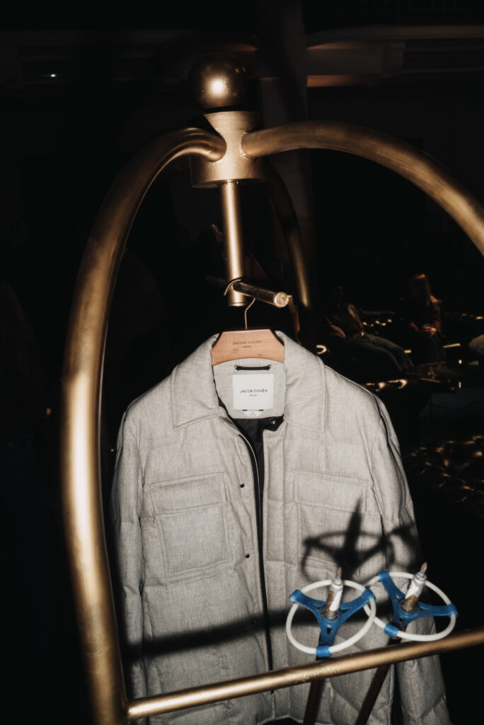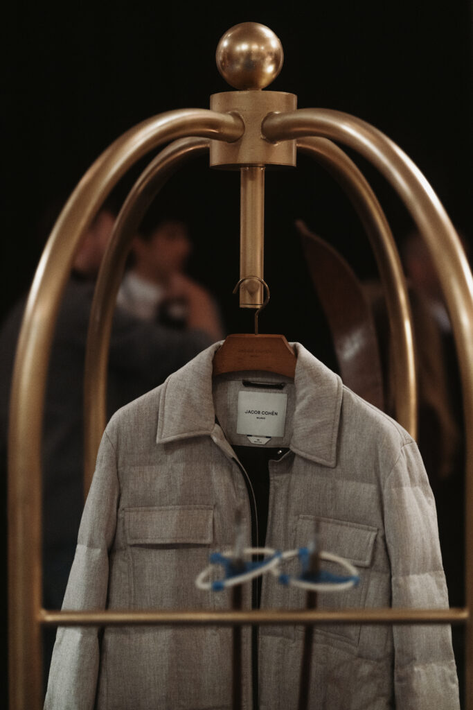 La scénographie de Fabio Chrestich insiste sur un point que la Maison martèle depuis Nicola Bardelle : la cohérence des signes identitaires prime sur la nouveauté formelle. La surpiqûre en trapèze — spécifique au dos de la ceinture des jeans cinq-poches — est reproduite sur les vestes et bombers comme motif structural. Les rivets en demi-sphère évoquent le tréma du Ë, qui différencie graphiquement Jacob Cohën de l’anthroponyme ordinaire et signale une appartenance. Jennifer Tommasi Bardelle déclare dans le communiqué : « Saison après saison, travailler des matières rares et exclusives devient de plus en plus la signature stylistique de Jacob Cohën. Dans son évolution naturelle, la maison reste profondément fidèle à ses racines. » C’est une déclaration de continuité dans un marché qui récompense souvent la rupture. La cohérence est ici un pari stratégique.