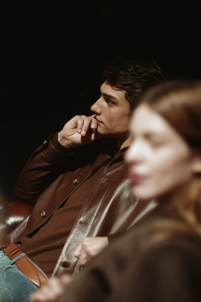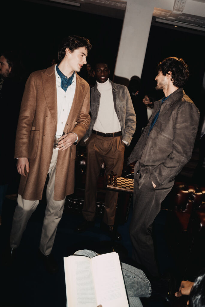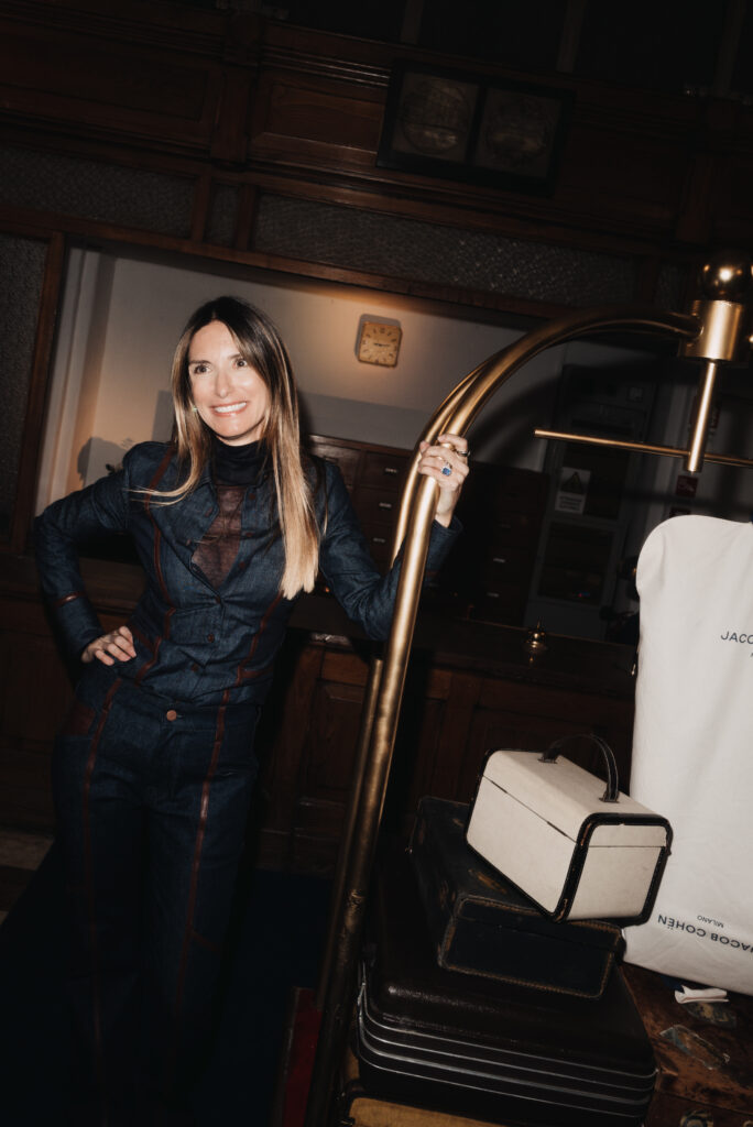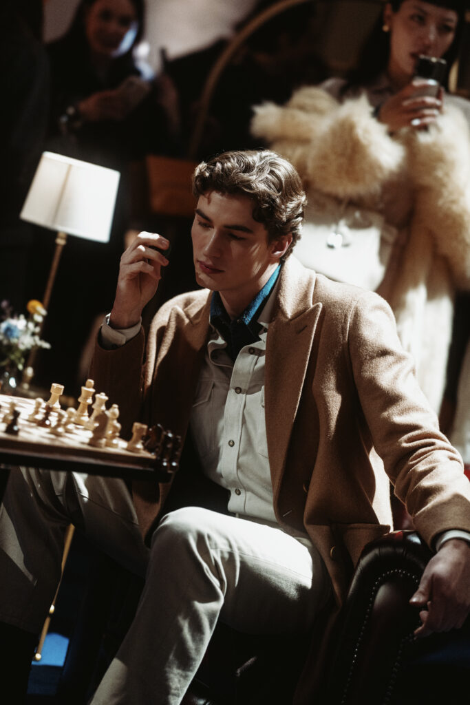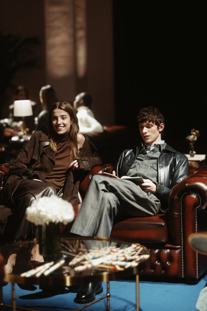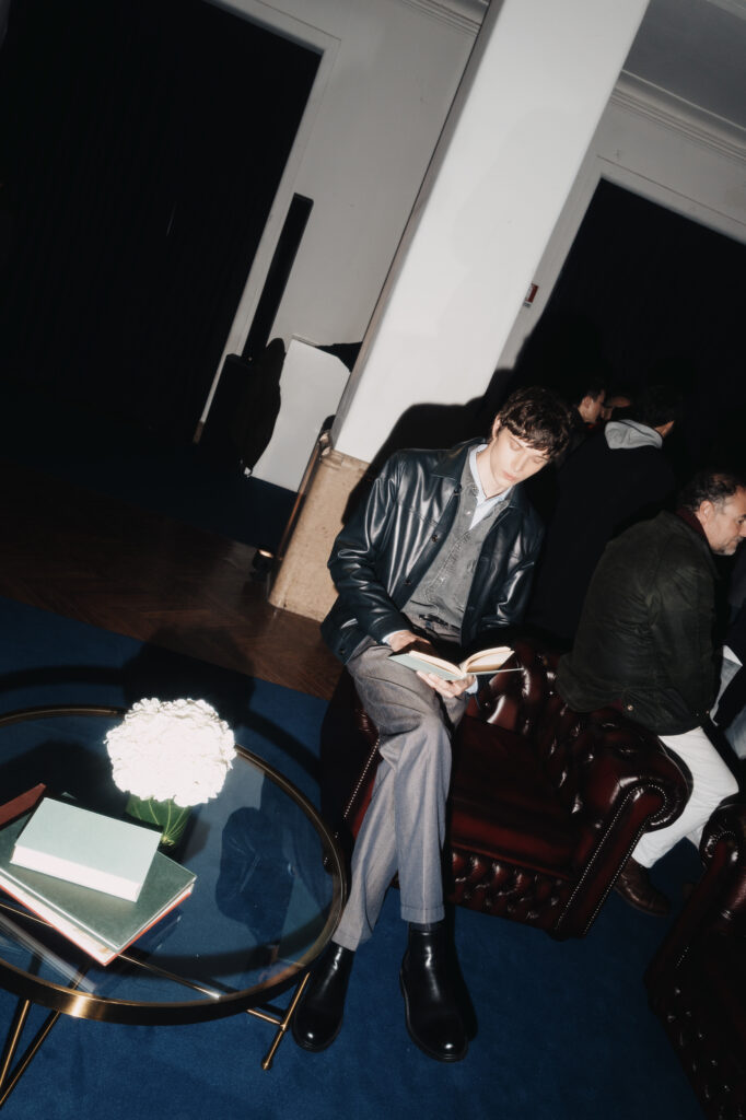 La scénographie de Fabio Chrestich insiste sur un point que la Maison martèle depuis Nicola Bardelle : la cohérence des signes identitaires prime sur la nouveauté formelle. La surpiqûre en trapèze — spécifique au dos de la ceinture des jeans cinq-poches — est reproduite sur les vestes et bombers comme motif structural. Les rivets en demi-sphère évoquent le tréma du Ë, qui différencie graphiquement Jacob Cohën de l’anthroponyme ordinaire et signale une appartenance. Jennifer Tommasi Bardelle déclare dans le communiqué : « Saison après saison, travailler des matières rares et exclusives devient de plus en plus la signature stylistique de Jacob Cohën. Dans son évolution naturelle, la maison reste profondément fidèle à ses racines. » C’est une déclaration de continuité dans un marché qui récompense souvent la rupture. La cohérence est ici un pari stratégique.