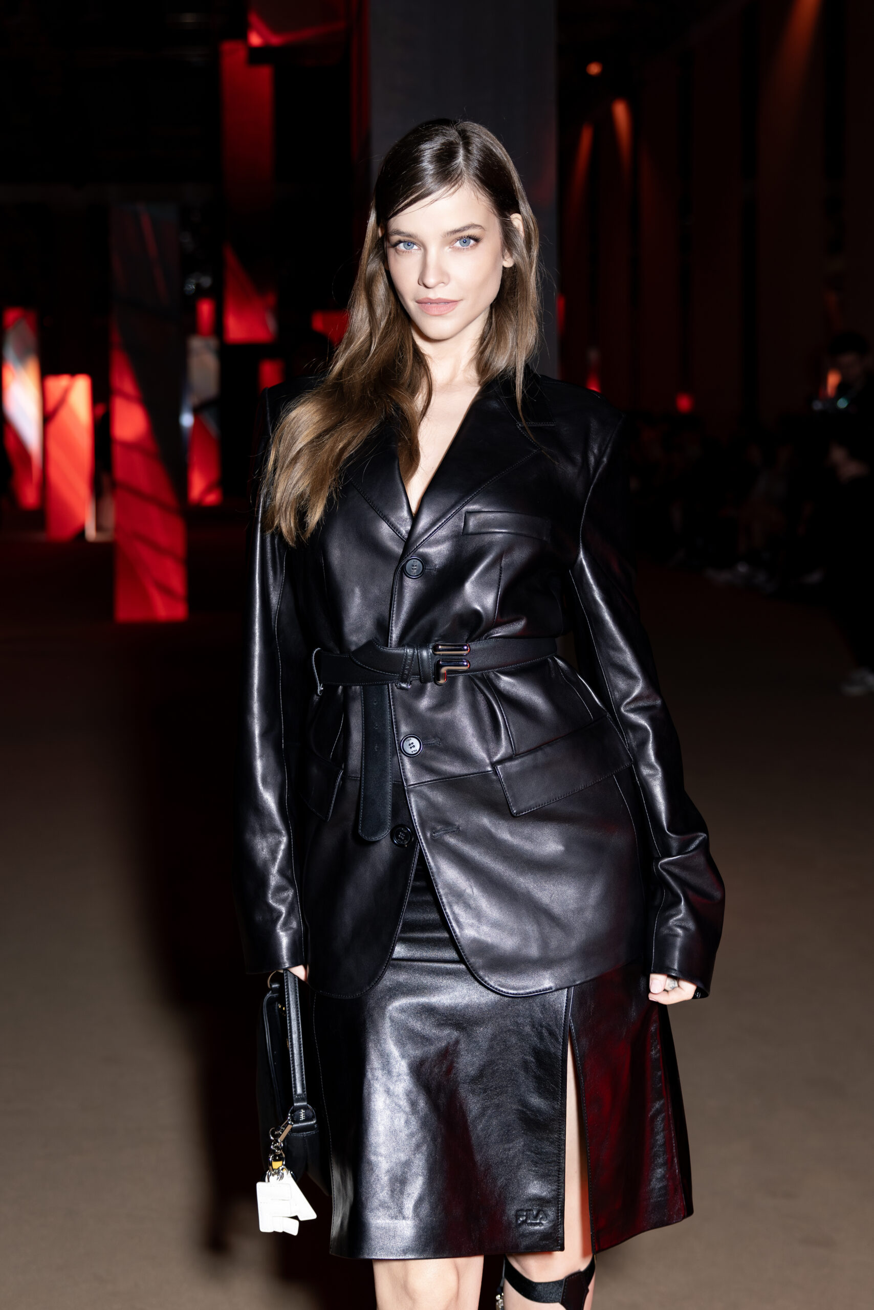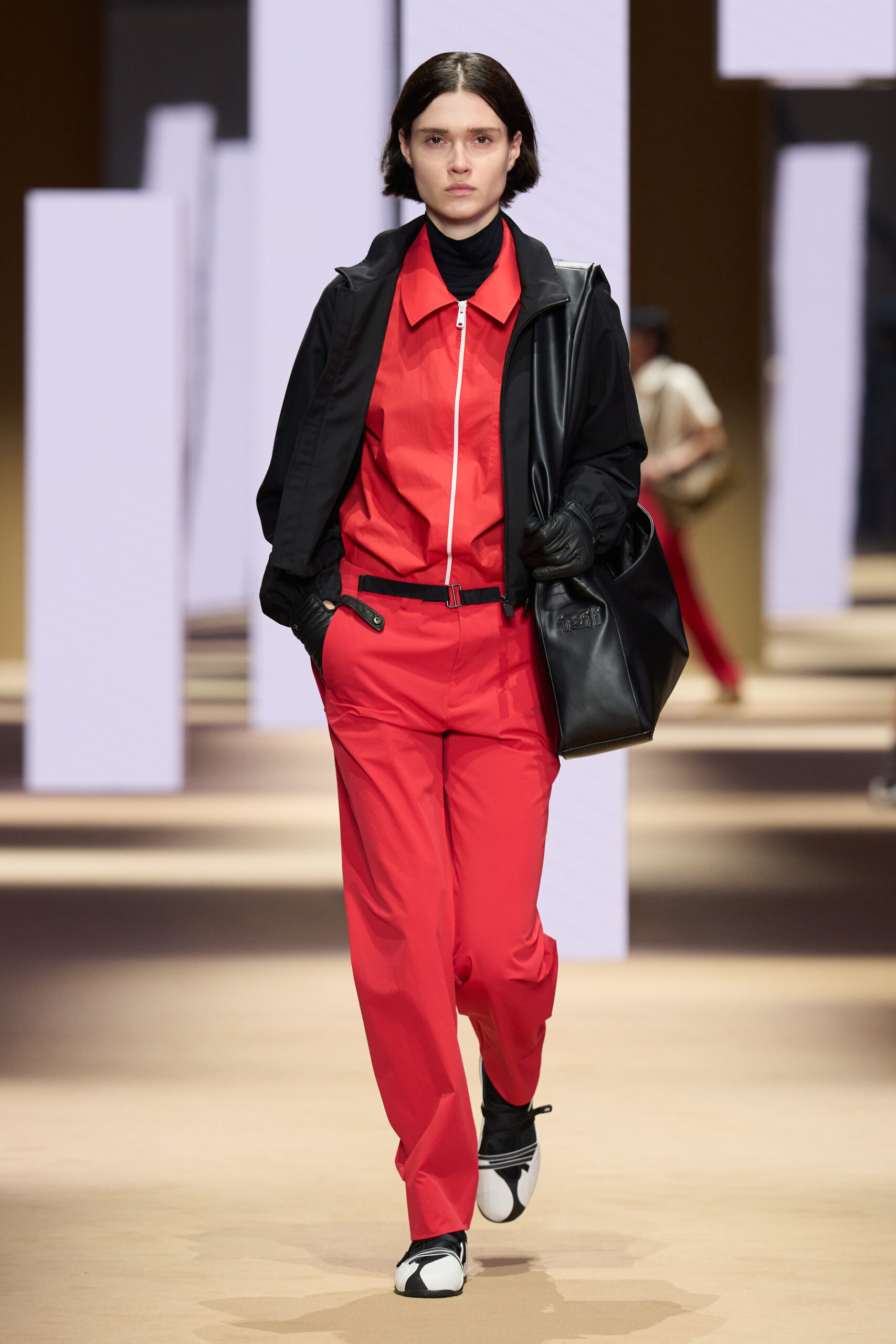 La palette — bleus, noir, vert kaki, gris, crème, camel, accents rouge vif et bleu électrique — reconduit le color-blocking qui a construit la reconnaissance visuelle de la maison dans les années 1980 et 1990. La lecture de Carr n’est pas de le réinventer mais de le calibrer : les accents chromatiques électriques restent présents mais minoritaires, suffisants pour signaler l’appartenance sans dominer la silhouette.