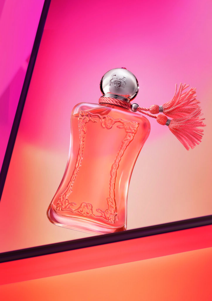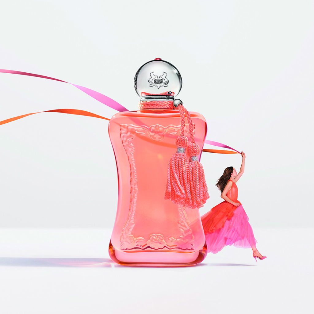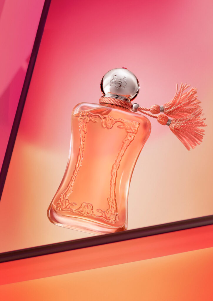La direction artistique de la campagne a été confiée à Sofia Sanchez et Mauro Mongiello, duo de photographes argentins installés à Paris, déjà auteurs de l’univers visuel de Palatine, autre fragrance de la Maison. Le parti pris — dégradé rose-orange, esthétique que Parfums de Marly qualifie de « pop » — marque une inflexion chromatique assumée par rapport aux codes habituels de la parfumerie de niche, souvent enfermée dans le noir et le doré.