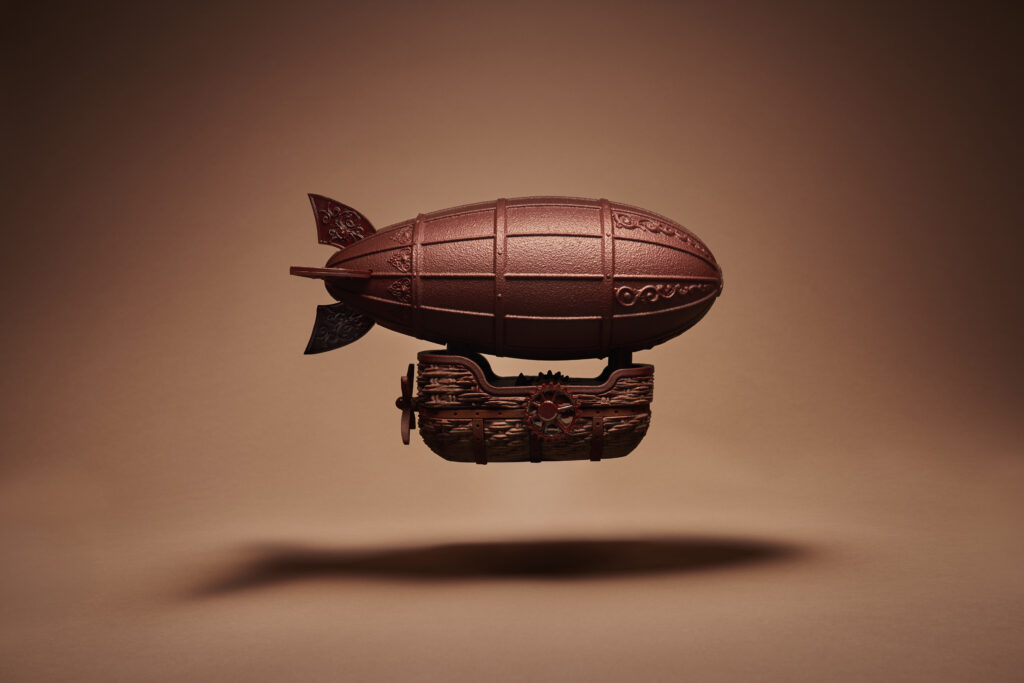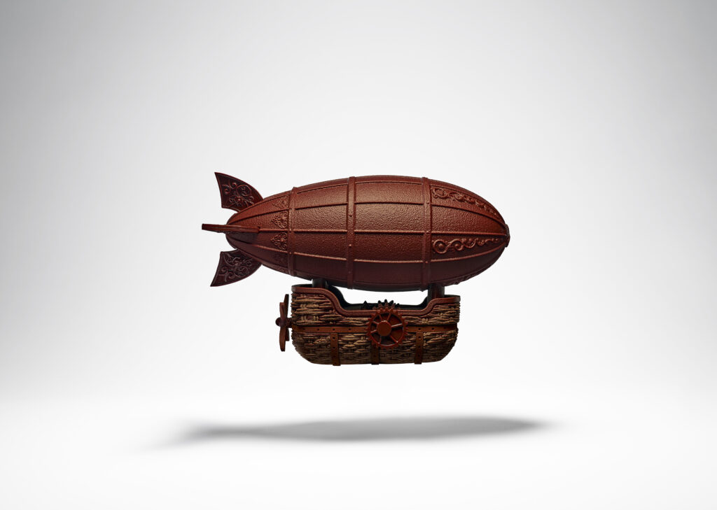 La structure nécessite l’assemblage de 850 grammes de chocolat. L’ingénierie de la pièce repose sur l’équilibre physique permettant de suspendre la coque principale et d’y arrimer une nacelle dont la surface reproduit visuellement la tension d’un osier tressé. À l’arrière, un mécanisme suggère le mouvement de rotation des hélices de ces premiers aéronefs. Le contraste des matériaux internes obéit à une répartition précise : le cœur du ballon renferme un praliné à l’amande marié à une vanille torréfiée, tandis que la nacelle abrite un caramel à la vanille de Tahiti couplé à un praliné biscuité.