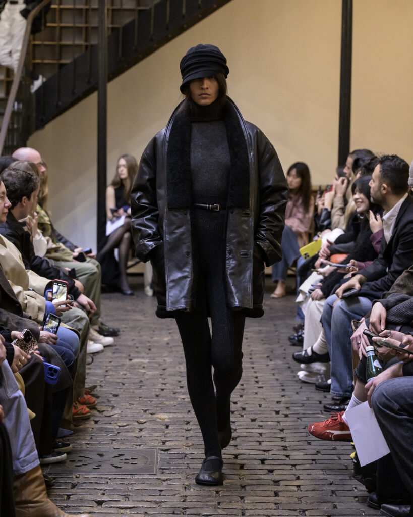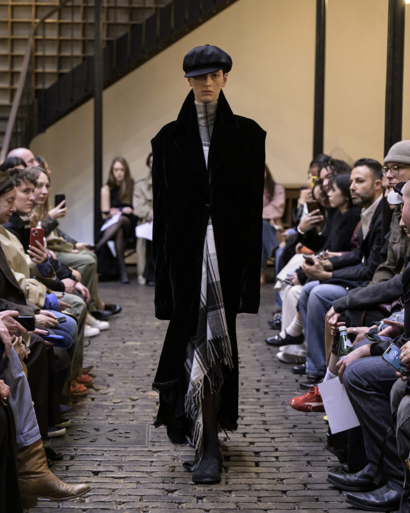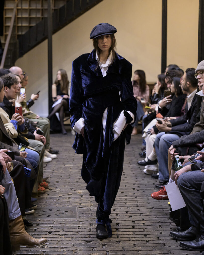 La collection s’ancre strictement dans les archives du vestiaire masculin et du tailoring lourd. Dévoilées au cœur de l’architecture industrielle du Bastille Design Center sur une composition du projet musical Anadol, les pièces d’outerwear sont historiquement pensées pour l’endurance. Ici, le vêtement ne cherche pas l’attention : la fonction dicte systématiquement la forme. Les silhouettes se déploient avec un volume délibéré et maîtrisé. Les épaules maintiennent une structure sans verser dans l’agressivité, tandis que les superpositions s’accumulent pour agir comme une véritable isolation thermique plutôt que comme une simple proposition décorative.