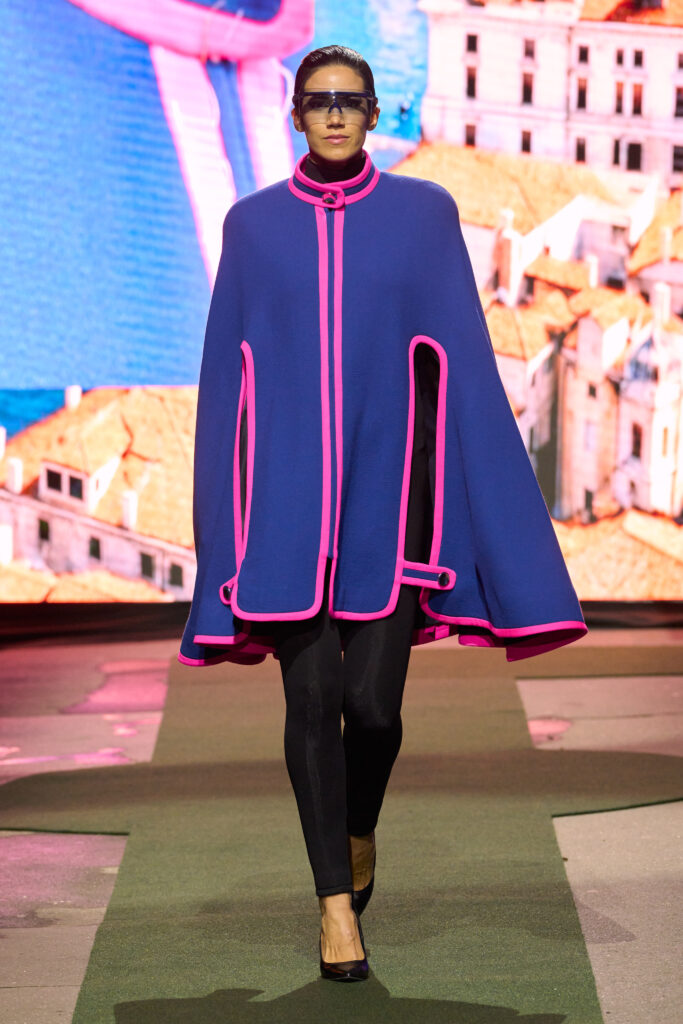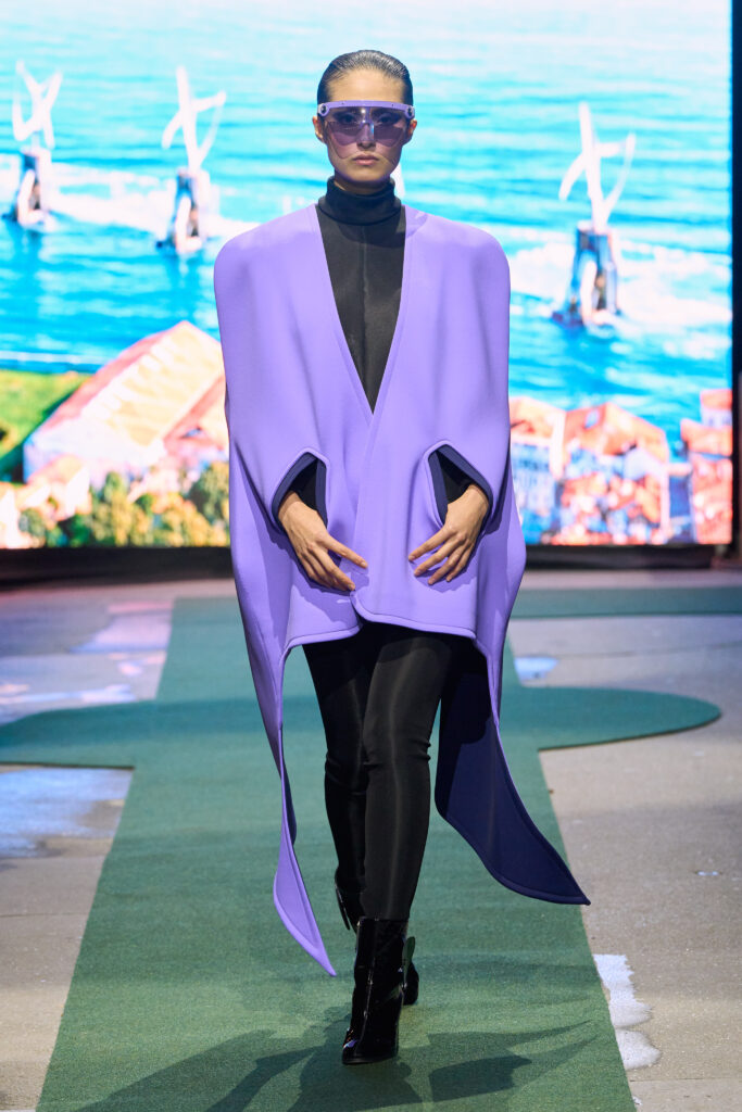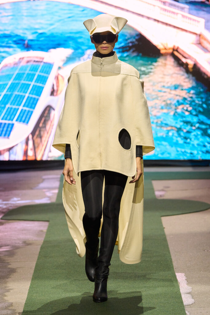 Les silhouettes convoquent les archétypes vénitiens — masques, capes, volumes flottants — tout en les déplaçant vers une fonction. Ce ne sont plus des signes culturels, mais des formes adaptées à un milieu humide, mouvant, imprévisible. La cape, par exemple, cesse d’être un geste théâtral pour devenir une protection modulable.