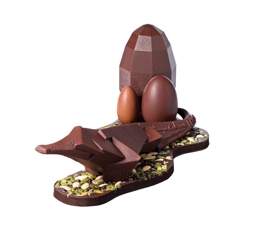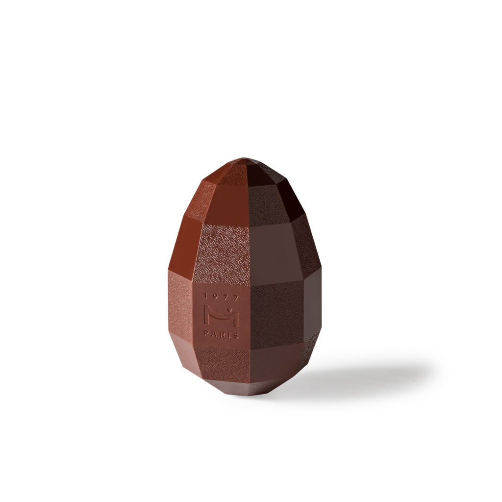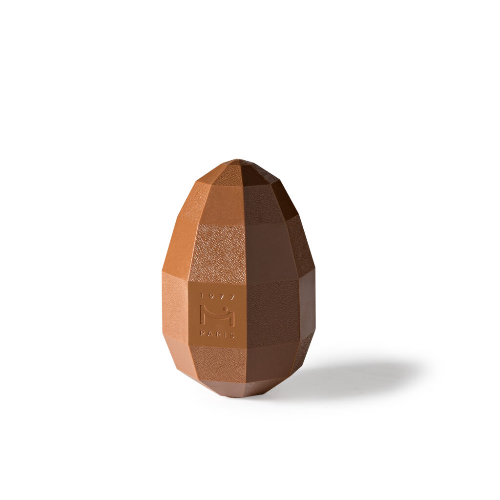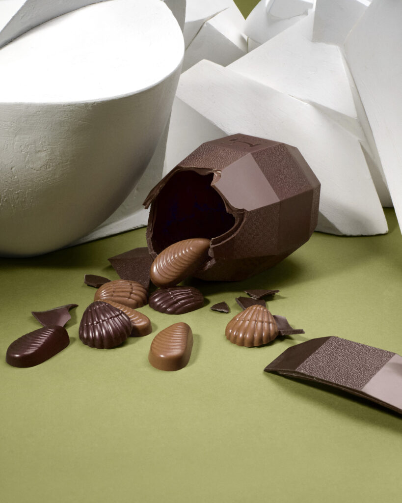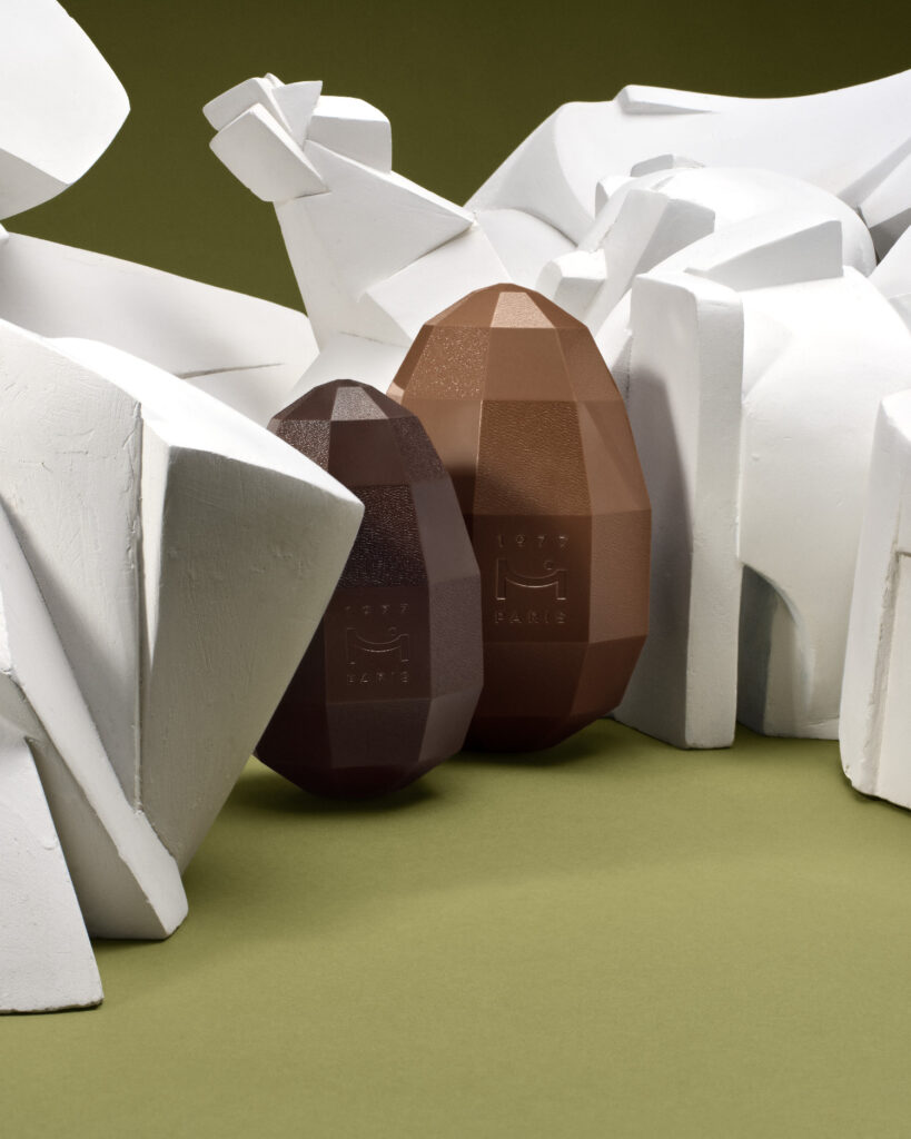 L’œuf, forme lisse par tradition, devient ici un objet angulaire. Le chocolat cesse d’être une enveloppe pour devenir une structure à lire.
