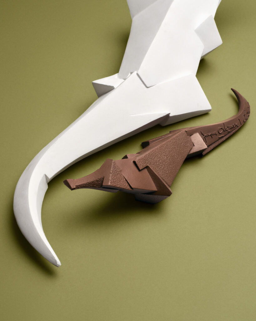 La pièce, nommée Tanakio, repose sur un moule sur mesure dérivé d’un original en bronze. Le passage d’un matériau à l’autre impose une contrainte : là où le métal supporte la masse, le chocolat exige une architecture interne précise.