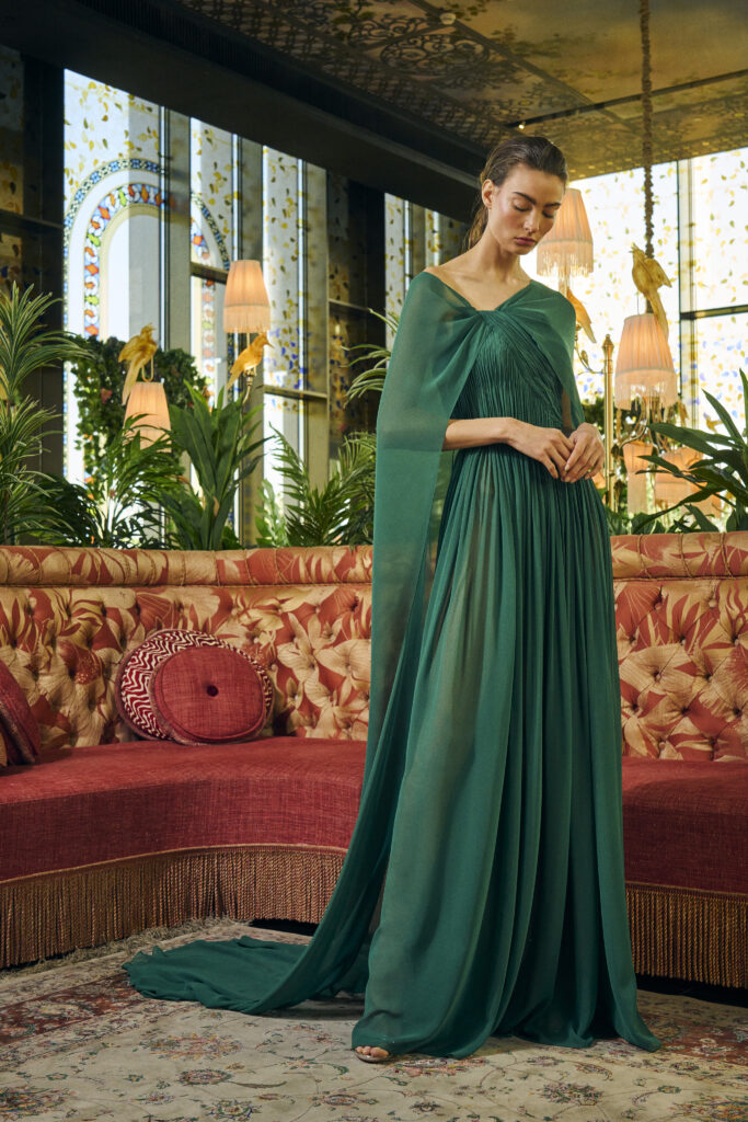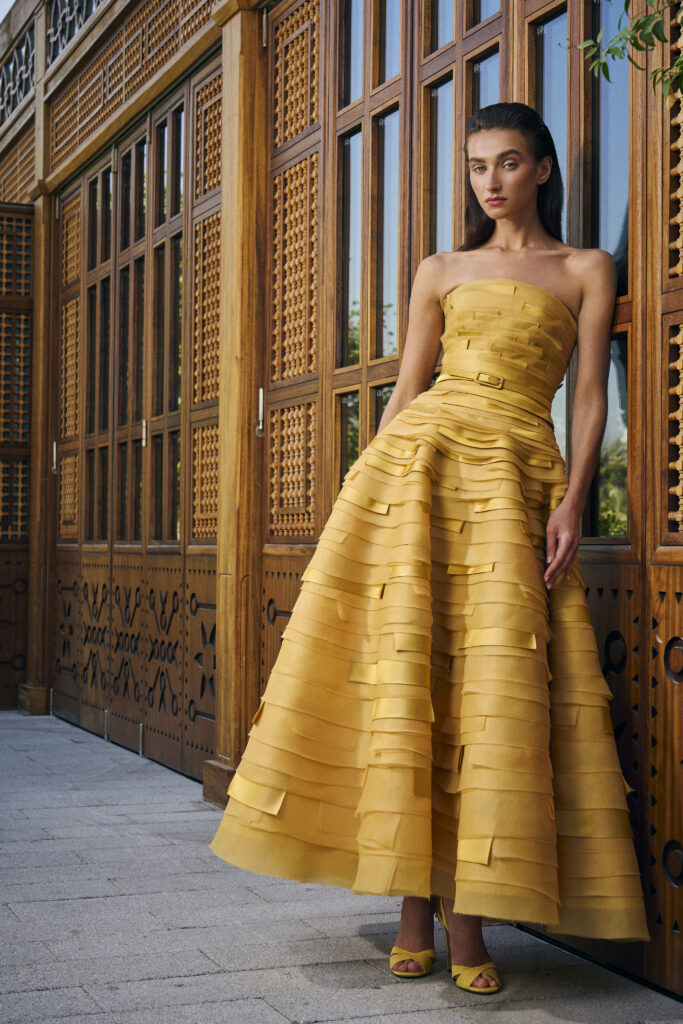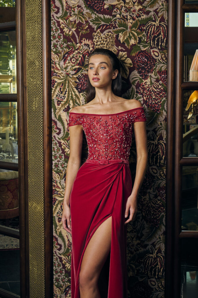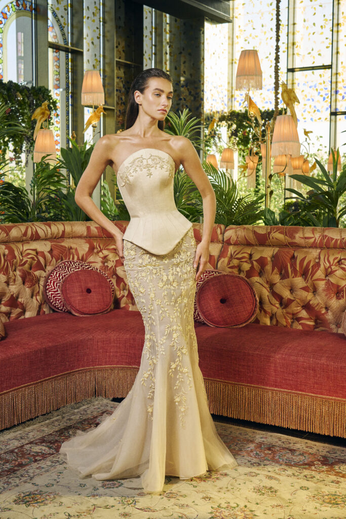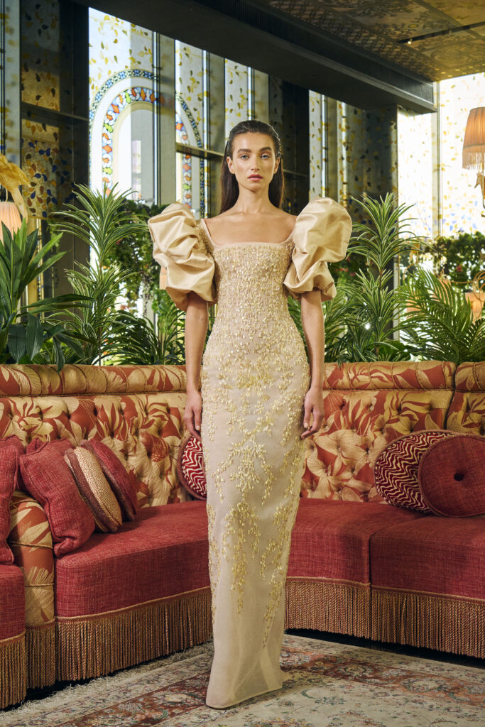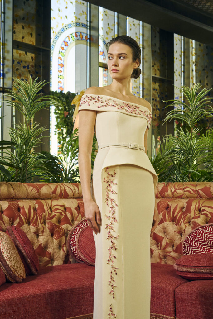 Rami Al Ali travaille ici une figure précise : une femme immobile, consciente de sa présence, mais jamais démonstrative. Les décolletés — épaules dégagées, bustiers, asymétries — ne relèvent pas d’un registre séducteur immédiat. Ils structurent la ligne du haut du corps, créant des points d’ancrage visuels. De même, les basques sculptées, les capes ou les sur-jupes asymétriques introduisent des variations de volume qui prolongent la silhouette sans la fragmenter.