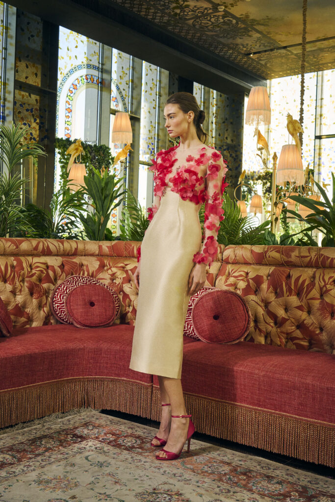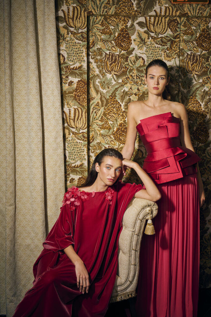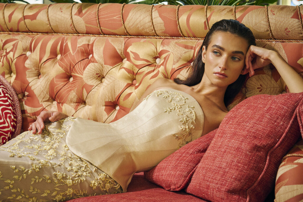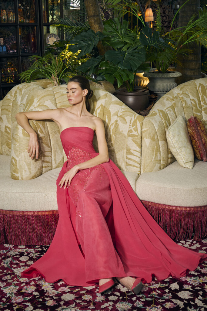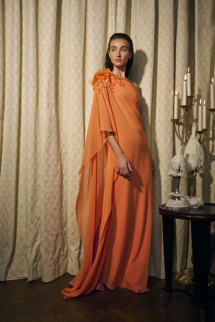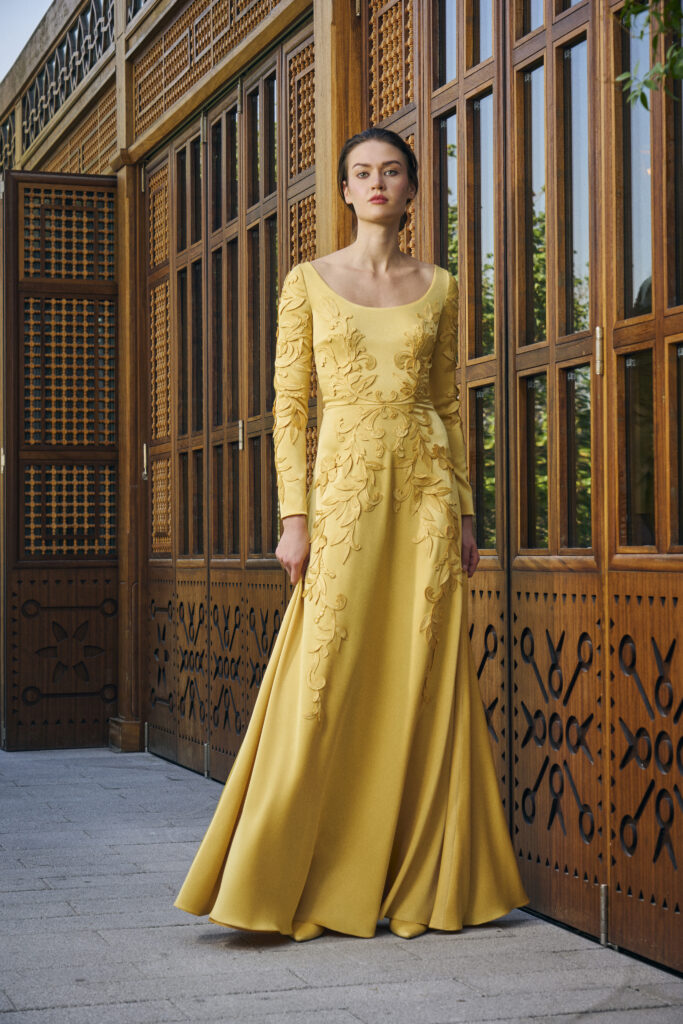 Rami Al Ali travaille ici une figure précise : une femme immobile, consciente de sa présence, mais jamais démonstrative. Les décolletés — épaules dégagées, bustiers, asymétries — ne relèvent pas d’un registre séducteur immédiat. Ils structurent la ligne du haut du corps, créant des points d’ancrage visuels. De même, les basques sculptées, les capes ou les sur-jupes asymétriques introduisent des variations de volume qui prolongent la silhouette sans la fragmenter.