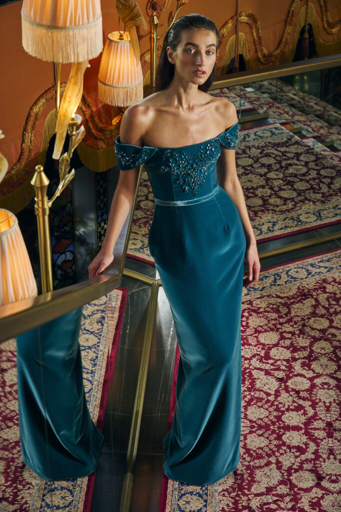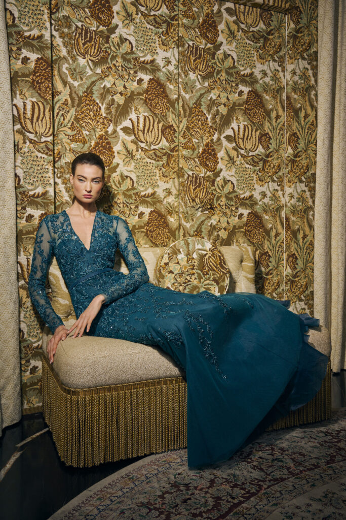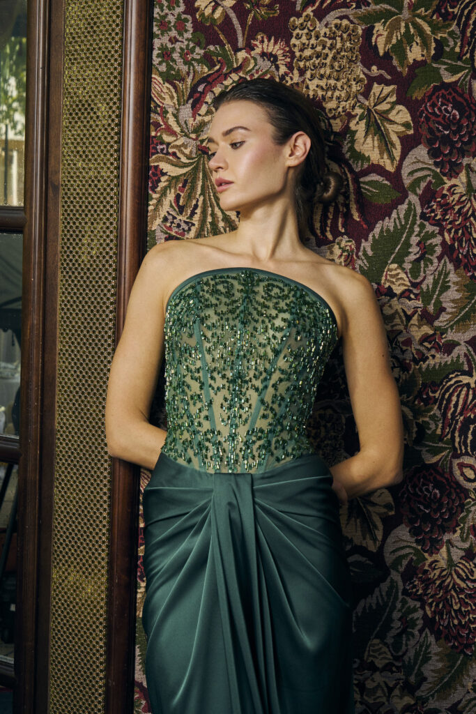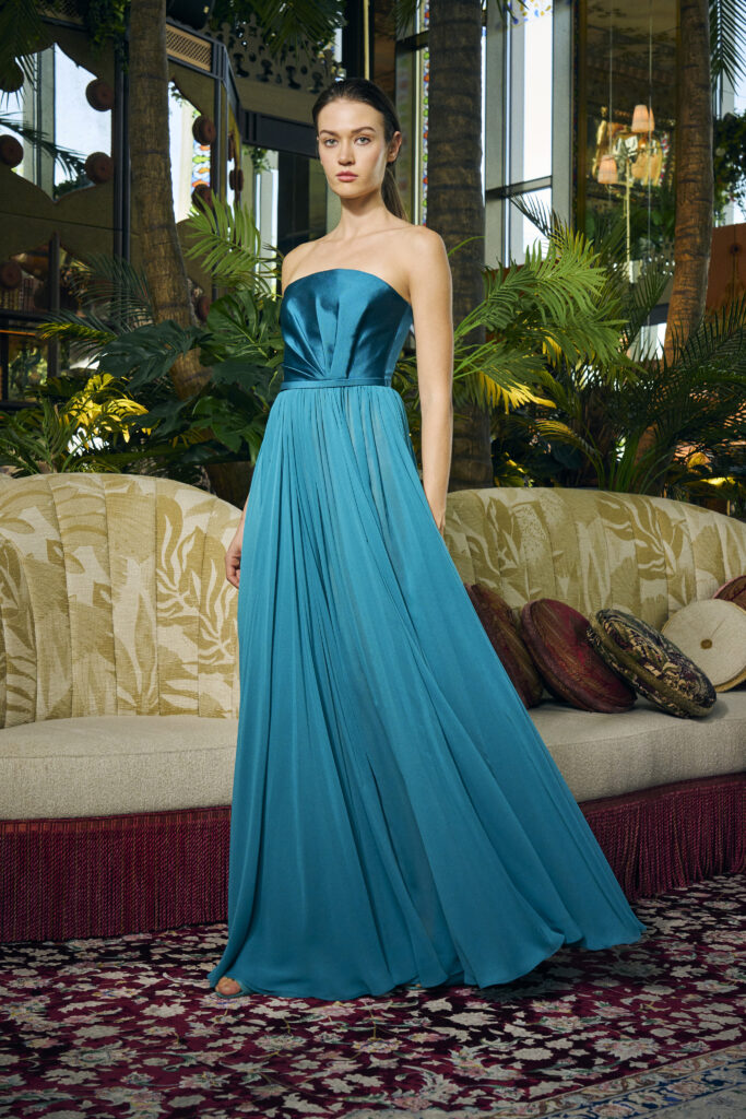 Le travail de construction se lit dans les éléments techniques : corseterie intégrée, panneaux géométriques, drapés contrôlés. Rien n’est laissé au hasard du mouvement. Une robe bustier moutarde s’organise autour d’une architecture interne précise ; une silhouette bleu sarcelle joue sur un drapé sculptural qui encadre le buste sans le contraindre totalement. La tension entre rigidité et fluidité devient le véritable sujet de la collection.