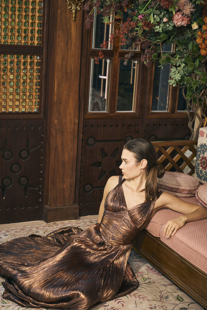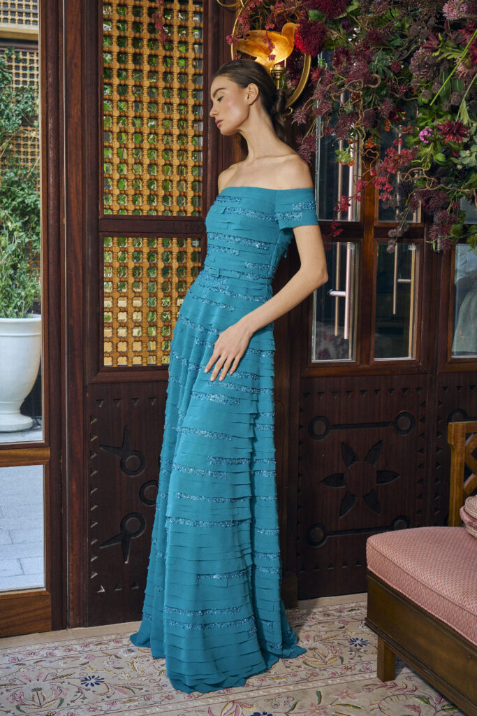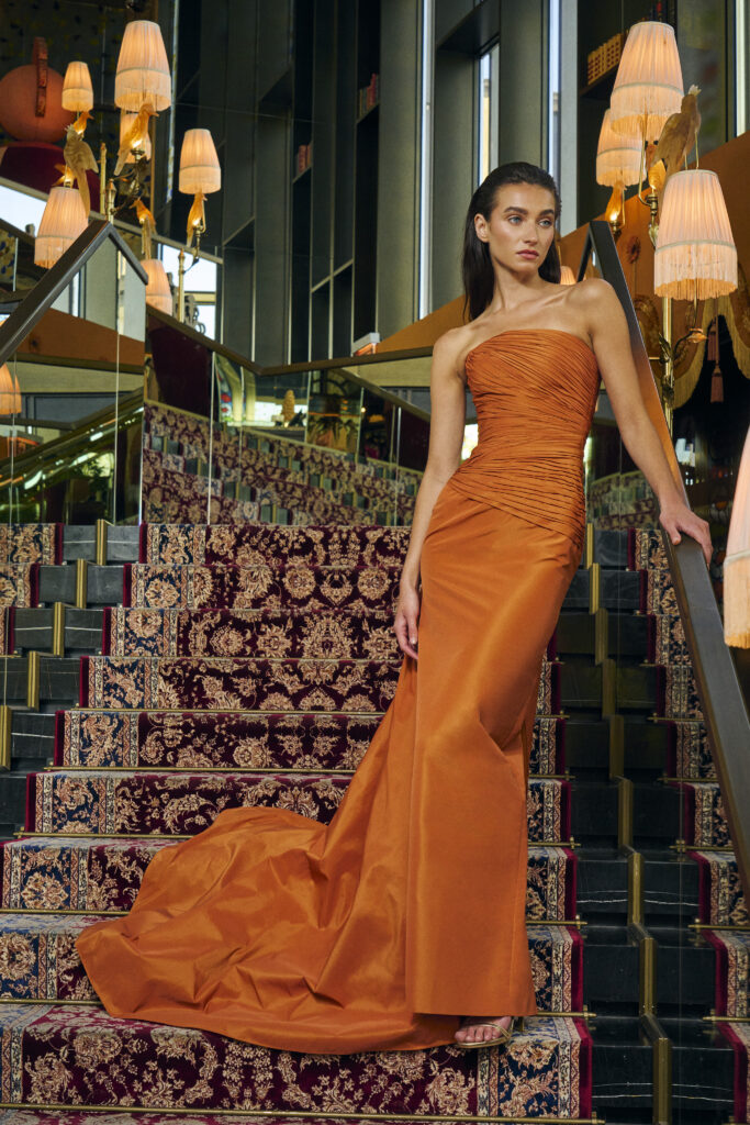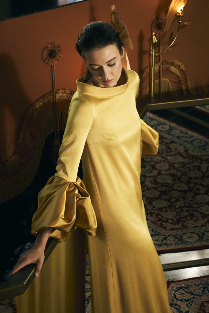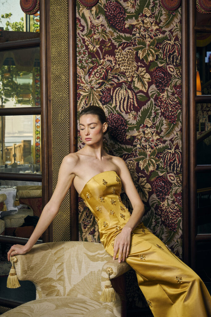 Le travail de construction se lit dans les éléments techniques : corseterie intégrée, panneaux géométriques, drapés contrôlés. Rien n’est laissé au hasard du mouvement. Une robe bustier moutarde s’organise autour d’une architecture interne précise ; une silhouette bleu sarcelle joue sur un drapé sculptural qui encadre le buste sans le contraindre totalement. La tension entre rigidité et fluidité devient le véritable sujet de la collection.