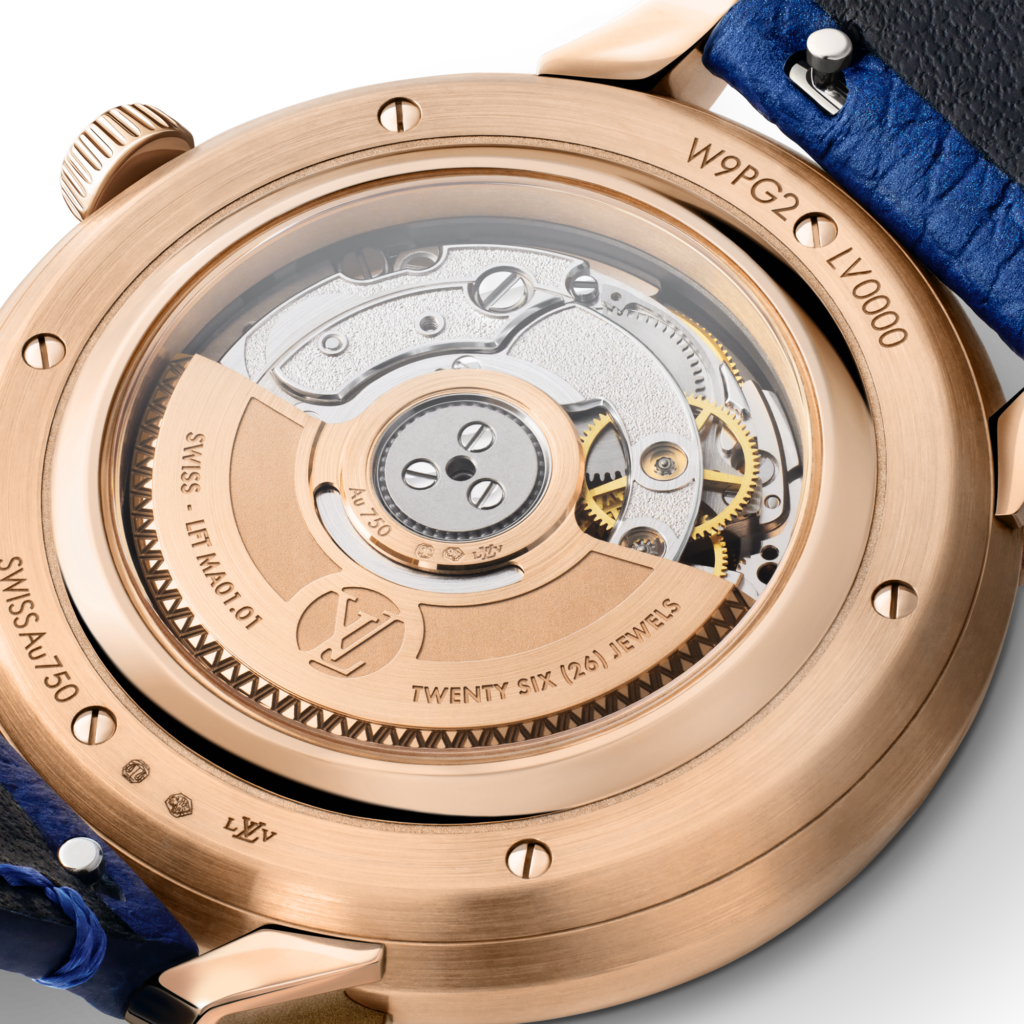 À l’intérieur, le calibre LFT MA01.01 — mouvement automatique de manufacture — oscille à quatre hertz, avec une réserve de marche de quarante-cinq heures. Un rotor en or rose assure le remontage. Le mouvement lui-même adopte une esthétique cohérente, avec des saphirs transparents remplaçant les rubis rouges traditionnels, signe d’une volonté d’inscrire une signature contemporaine jusque dans les détails invisibles .
