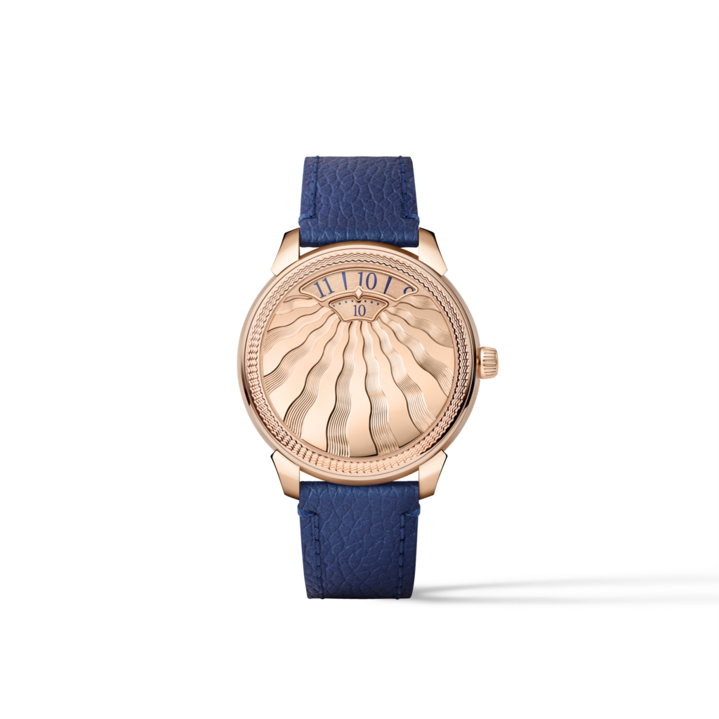Le boîtier en or rose, trente-sept millimètres de diamètre pour huit millimètres d’épaisseur, encadre ce travail sans le contraindre. Les cornes, redessinées, creusées puis microbillées, prolongent le jeu de lumière initié par le cadran. Rien n’est laissé neutre .