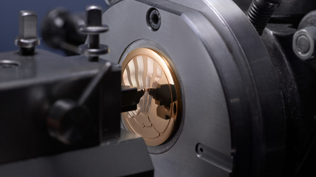 Deux techniques distinctes coexistent. En périphérie, des vagues concentriques, obtenues à l’aide d’un tour à guillocher ancien. Au centre, des rayons linéaires, réalisés sur une machine dite « ligne droite » datant de 1935. Entre les deux, des mois d’essais, une vingtaine d’ajustements, et une came développée spécifiquement pour obtenir ce relief ondulant .