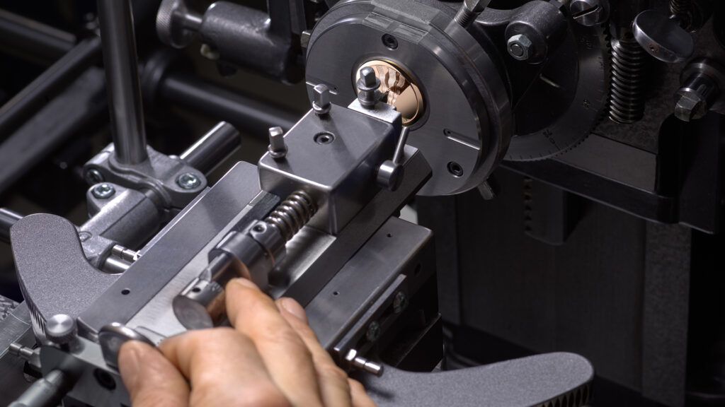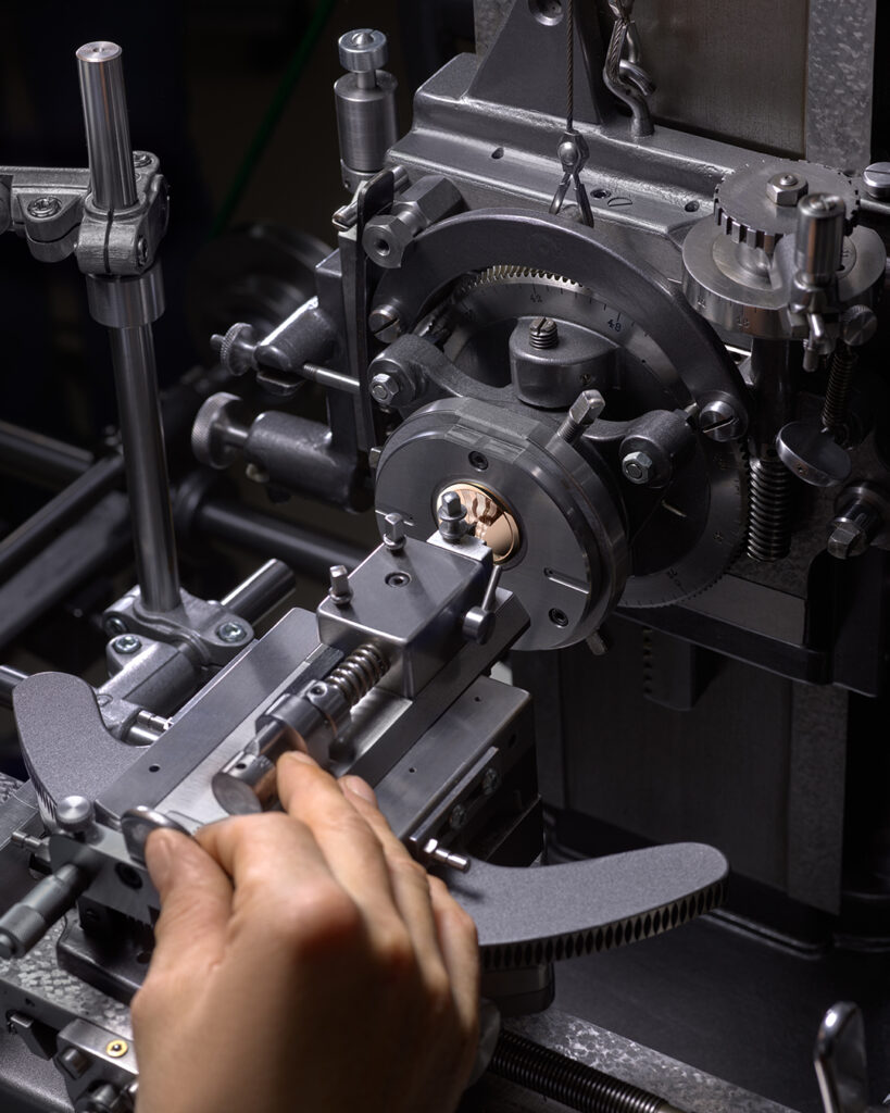 Réalisé à la main, il mobilise des machines anciennes — certaines datant du milieu du XIXe siècle — restaurées spécialement pour cet usage . Le geste n’est pas automatisé. Il repose sur une coordination fine entre la vue et le toucher. L’artisan ne suit pas uniquement un tracé : il ressent la vibration du métal sous le burin, ajuste la pression, corrige la trajectoire.
