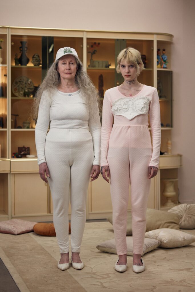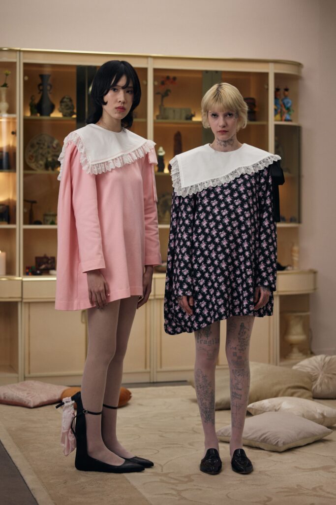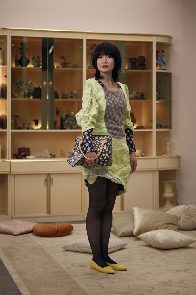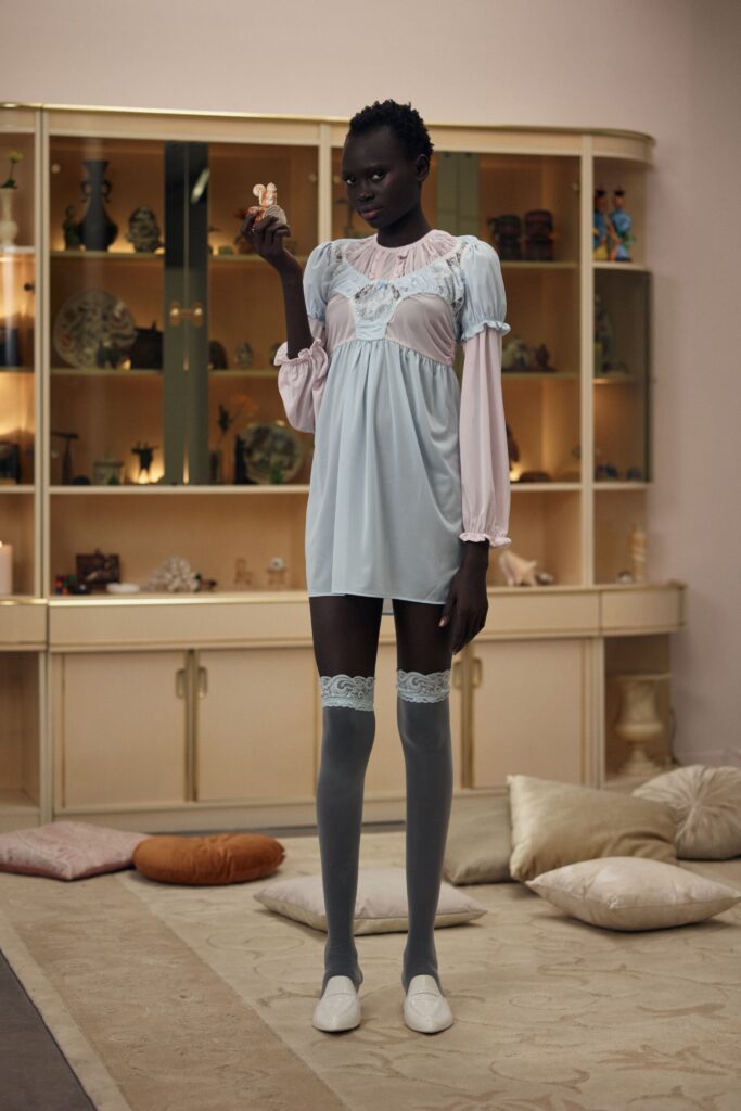 La scénographie de la Family Issue refuse la rupture entre le défilé et le foyer. Là où beaucoup de maisons construisent des sets conçus pour le plan large et l’image sociale, JENNYFAX installe un objet du quotidien — une pièce de mobilier non identifiée mais immédiatement lisible — comme seul décor. L’effet n’est pas nostalgique : il est désorientation contrôlée. Le spectateur cherche la référence, ne la trouve pas précisément, et c’est exactement le point.