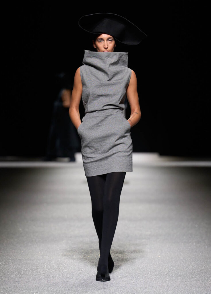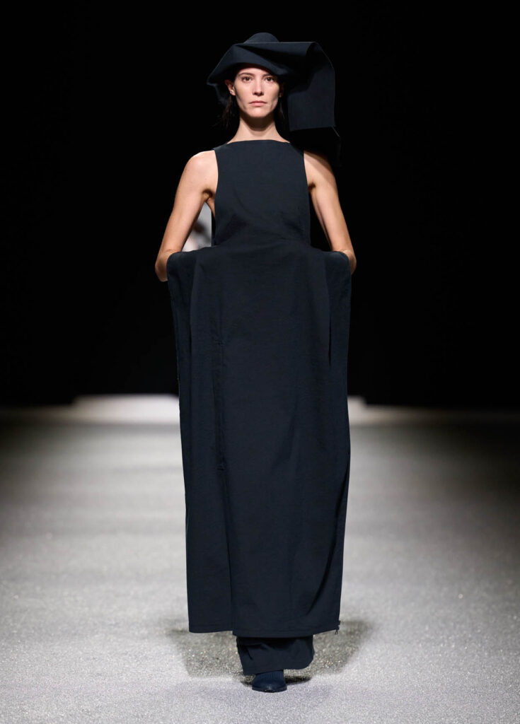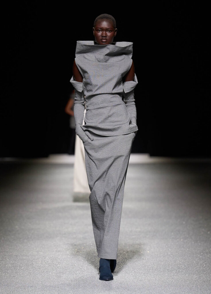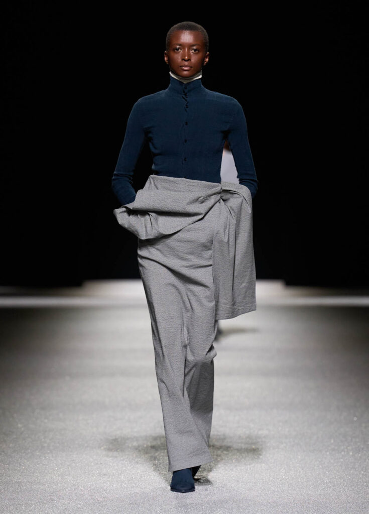 Dans chaque cas, la collection tient sa promesse conceptuelle par la matière, pas par le discours. Le « laisser advenir » dont parle le titre n’est pas une métaphore : c’est un déséquilibre de trame calculé, c’est une étoffe maintenue brute, c’est un zip comme seule intervention sur un tube de tissu qui se drapera seul au contact du corps.