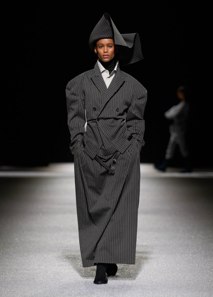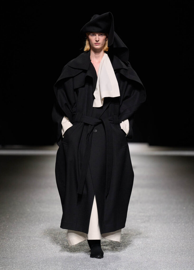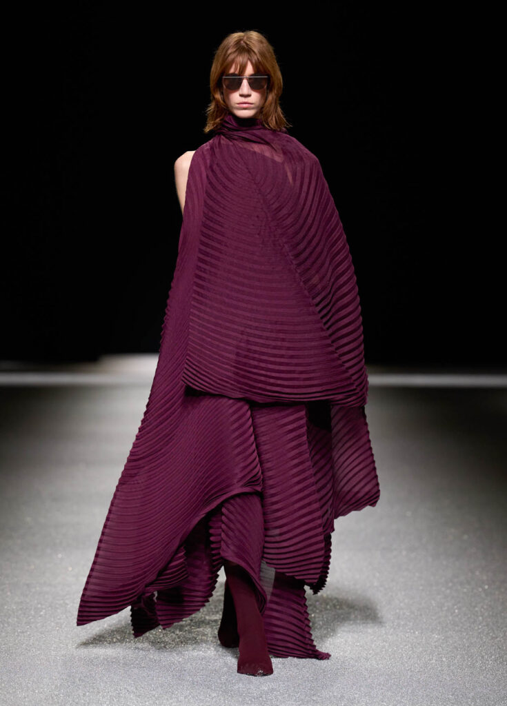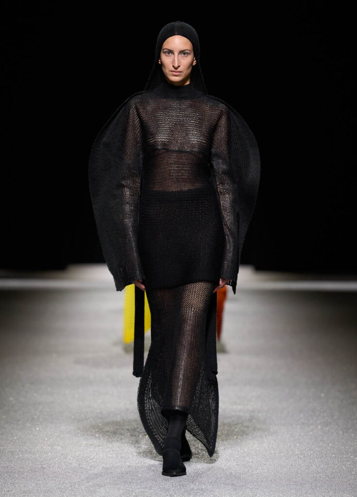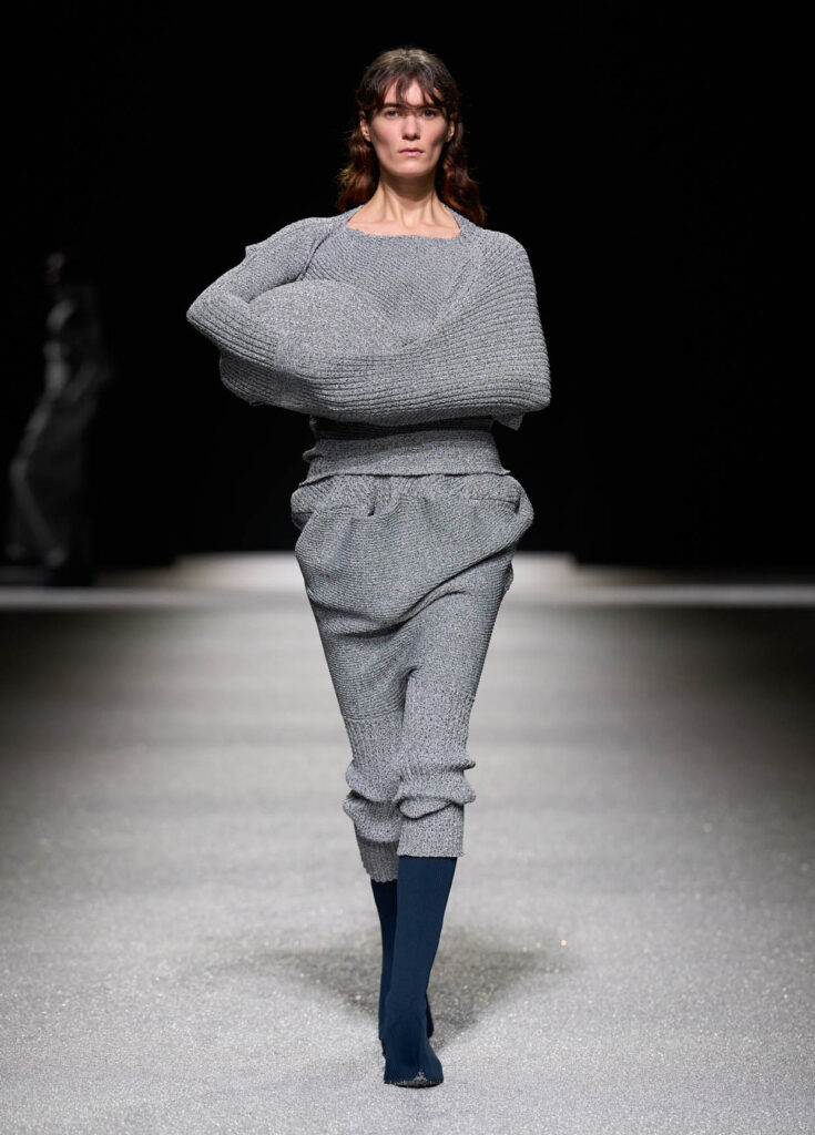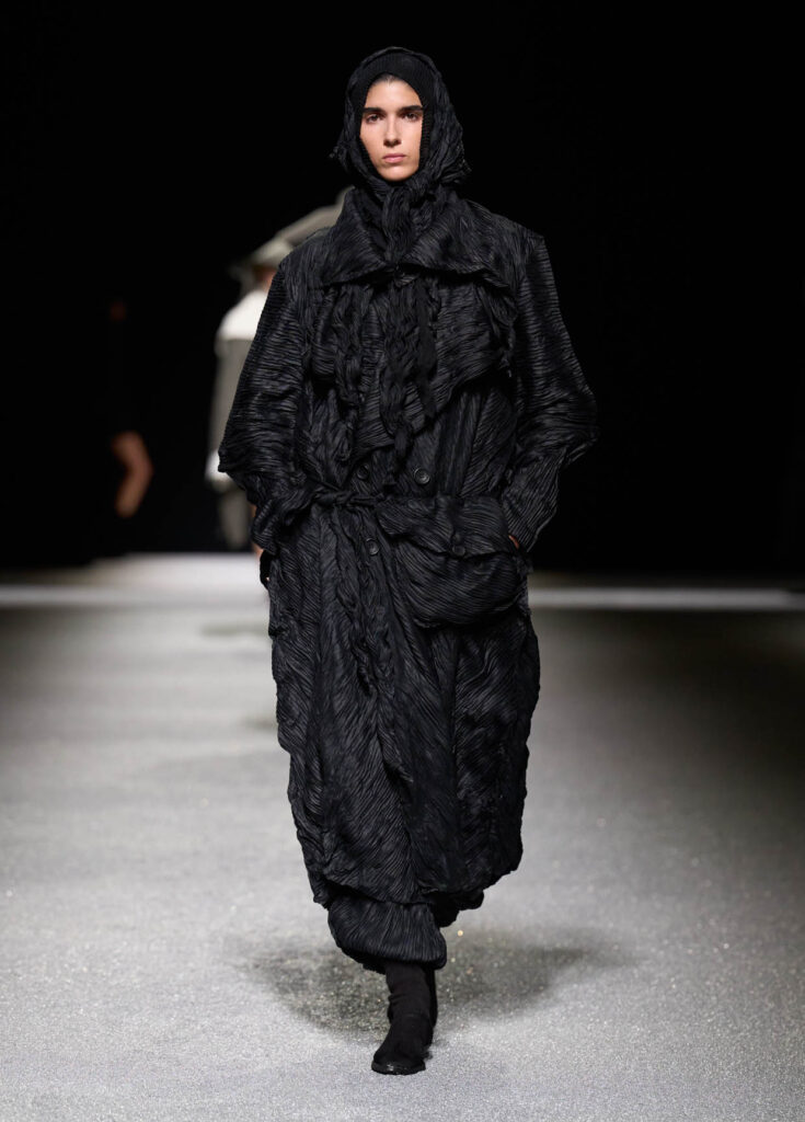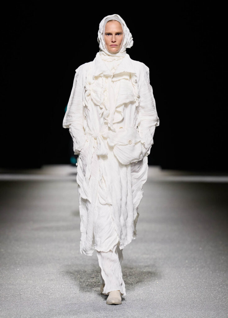 Le 6 mars, au Carrousel du Louvre, Maison Issey Miyake déversait au sol une couche de fines lamelles d’aluminium. Le sol devenait acteur : chaque passage de mannequin y laissait une trace scintillante, irréversible. La matière se transformait sous les corps, pas sous les intentions du designer. C’était le résumé visuel d’une collection entière.