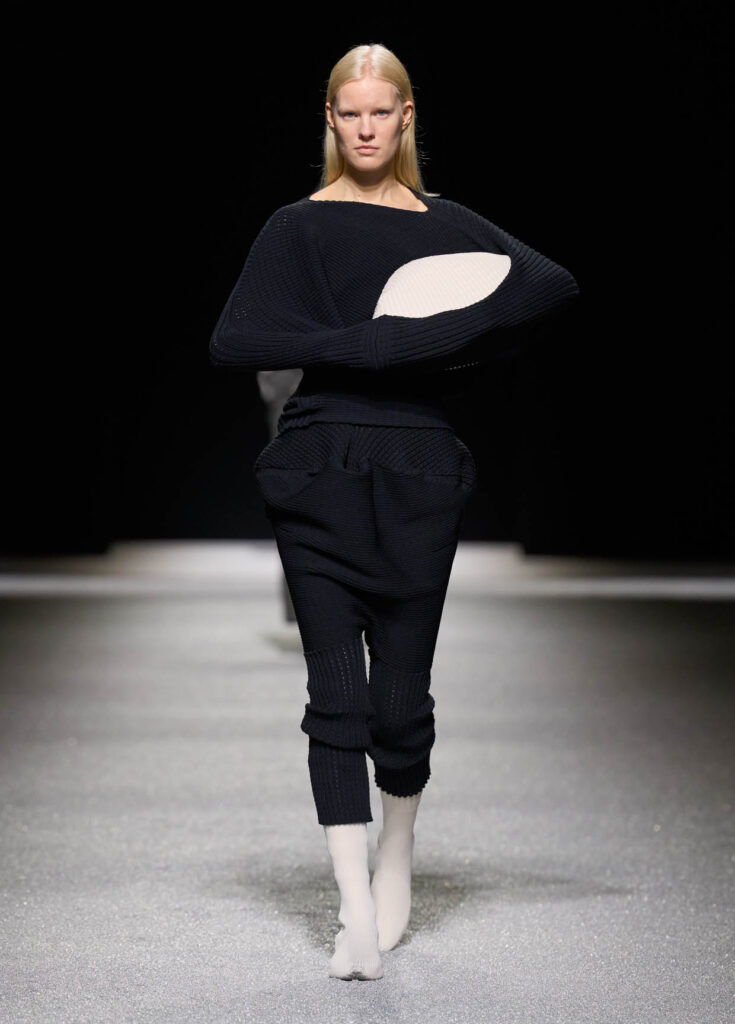 En marge des séries textiles, la maison présente Anna, troisième pièce issue de la collaboration avec CAMPER, après Peu Form (slip-on) et Karst Finch (sneaker). La tige en maille stretch intègre des fibres TENCEL™ — cellulose issue de bois sourcé durablement — sur la semelle fine du modèle Anita de Camper. Disponible en version basse (noir, beige) et botte (noir, bleu, bleu nuit profond), c’est le premier modèle à talon de la collaboration. L’exercice est cohérent : la maille y joue le même rôle qu’ailleurs dans la collection — une matière qui s’adapte au corps plutôt qu’elle ne le contraint.