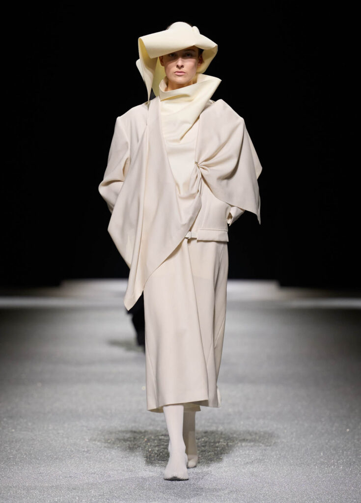 Le résultat est une coque portée sur le corps. Une architecture, disent les notes de presse. Ce qui est juste, à condition de préciser que l’architecture en question est issue de fibres végétales déchirées à la main et d’une résine organique séchée à Kyoto.