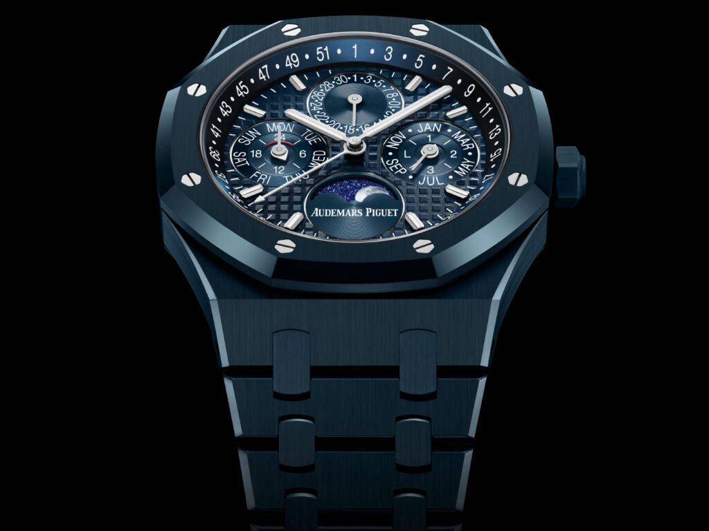 Cinquante ans après que Gérald Genta a dessiné un boîtier qui allait redéfinir le rapport entre la montre sportive et la haute complication, Audemars Piguet franchit un nouveau seuil. En février 2026, la Manufacture du Brassus présente une Royal Oak Quantième Perpétuel Automatique de 41 mm entièrement habillée de céramique « Bleu Nuit, Nuage 50 » et animée par le Calibre 7138 — un mouvement qui rend, pour la première fois dans l’histoire de la maison, le réglage du calendrier perpétuel accessible à la seule couronne.