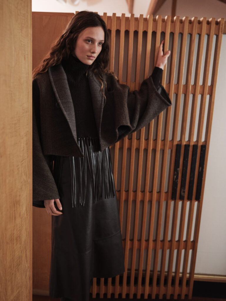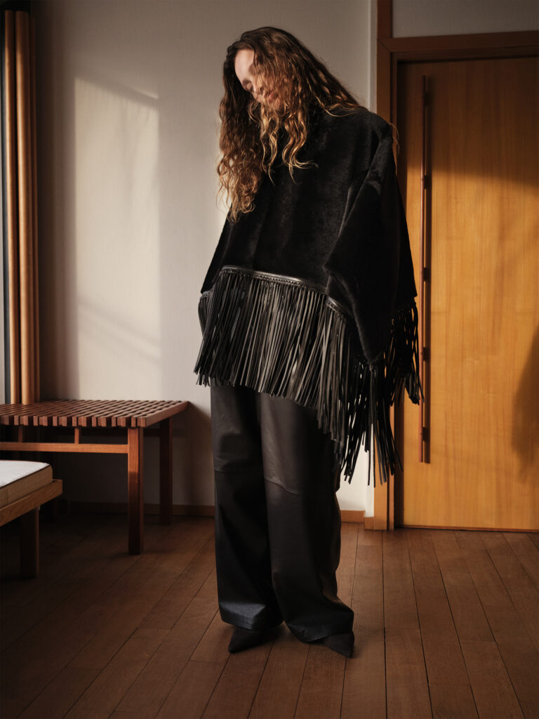 Le layering — terme que la charte Luxsure conduit à formuler autrement : l’architecture du volume — est ici un langage en soi. Une cape-veste posée sur un plastron frangé. Des cols-gilets glissés sous un manteau. Un plastron-camionneur en vison superposé sur un pull. Ce n’est pas de la superposition pour sa propre cause ; c’est une réponse à la question de savoir comment le vison, matière enveloppante par définition, peut devenir modulable — quelque chose qu’on enlève, repose, recompose.
