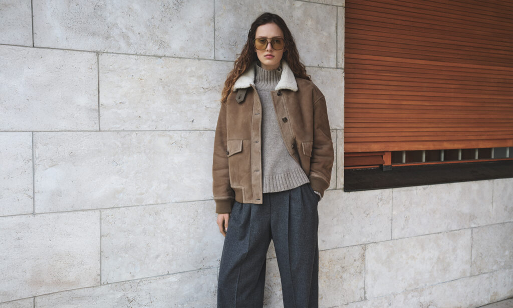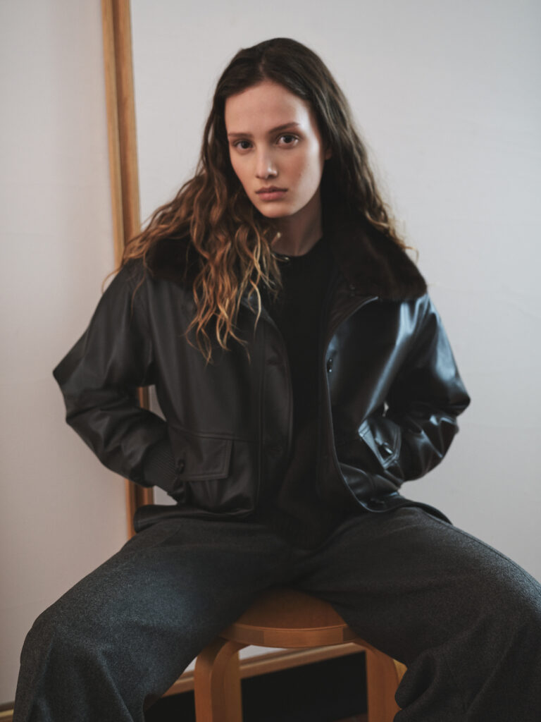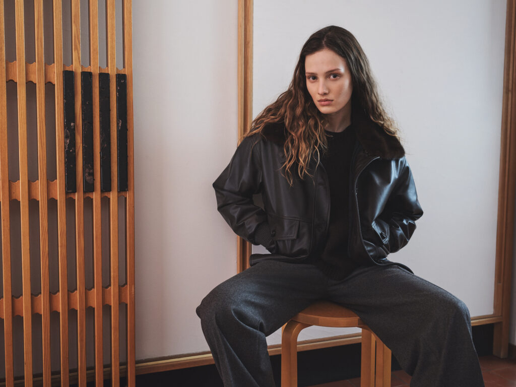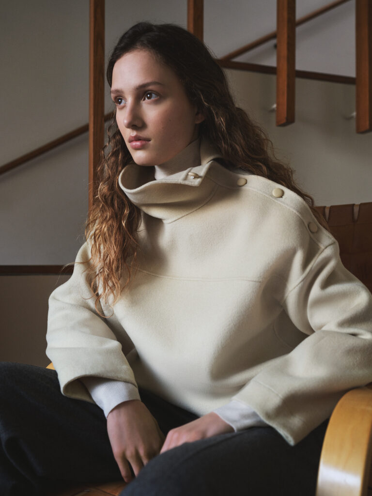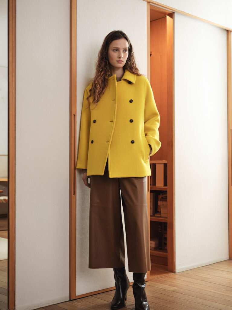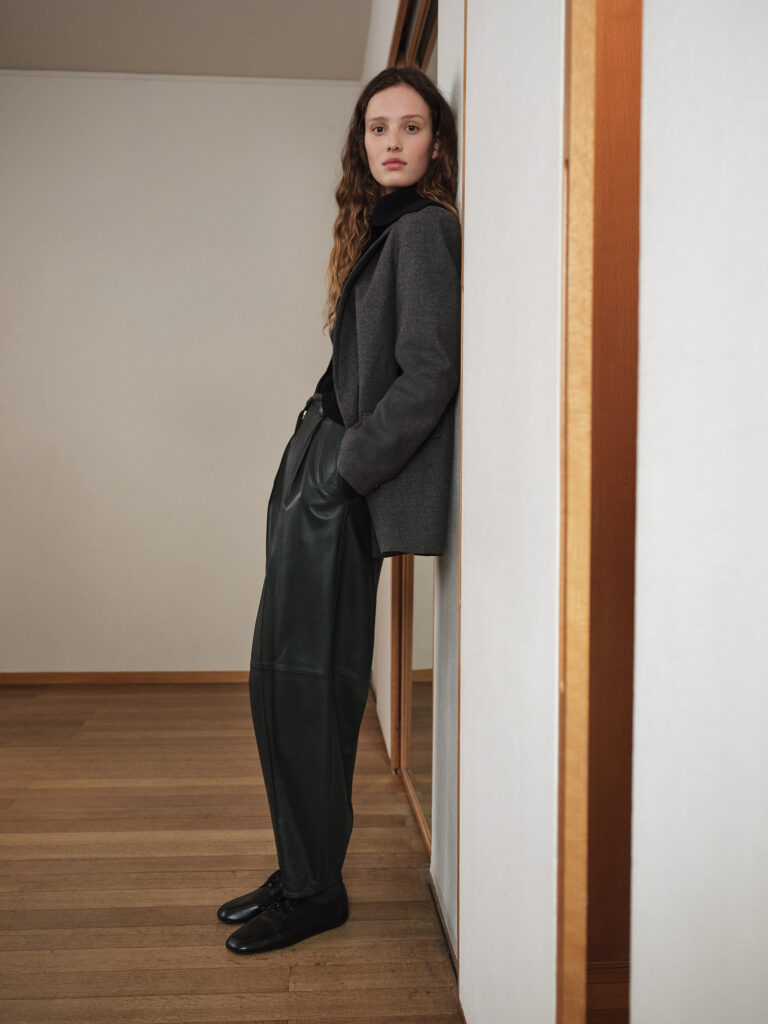 La silhouette de référence, elle, est cinématographique. Angelica Huston dans les années 70 : longiligne, légèrement androgyne, portant le vêtement avec une indifférence qui n’exclut pas l’autorité. Caban aux volumes affirmés, costumes en flanelle, pull vareuse en côte anglaise. Des pièces dont la coupe structure avant que la matière ne décore.