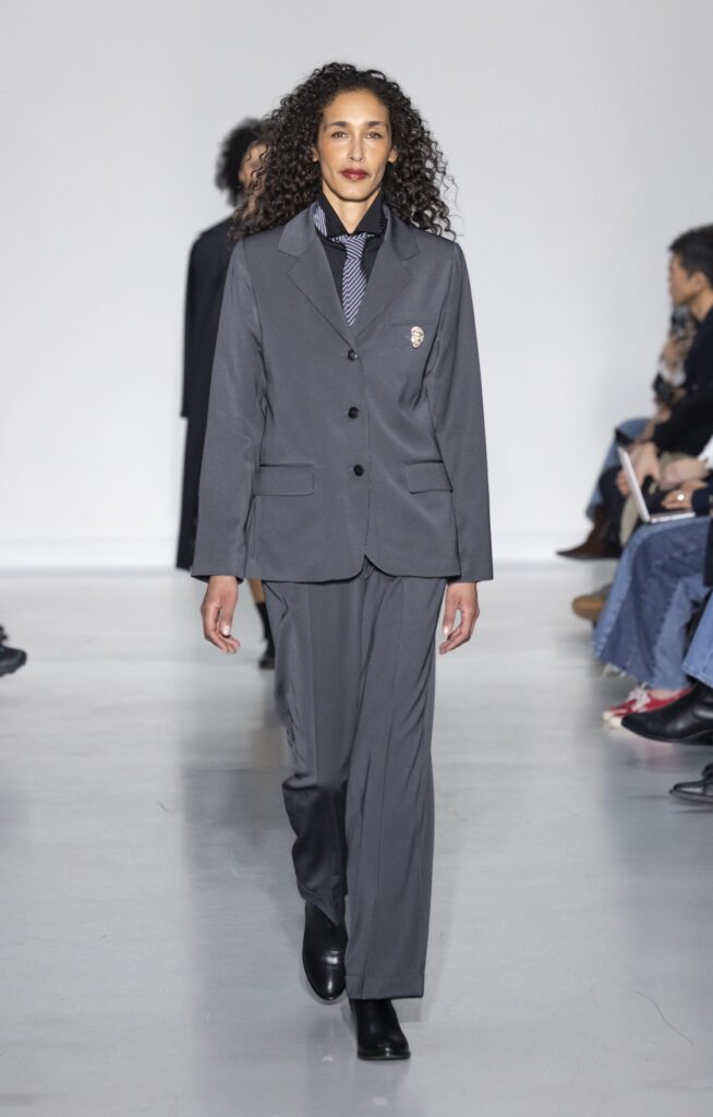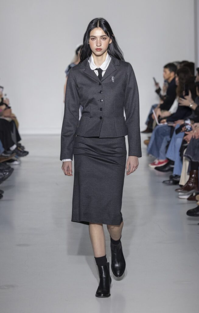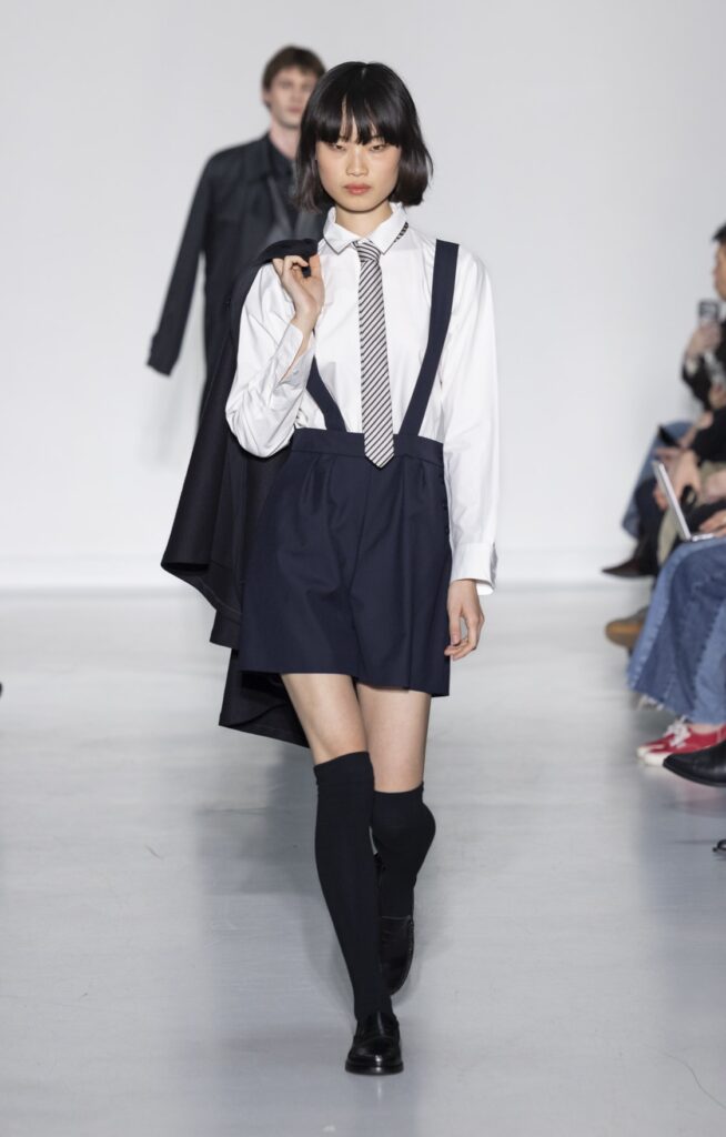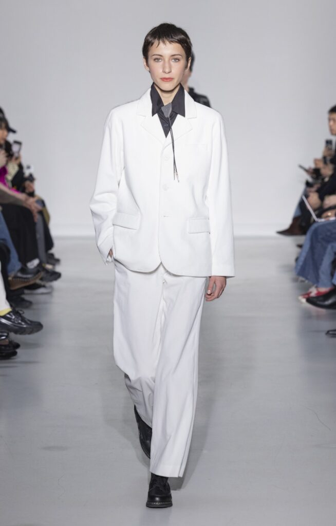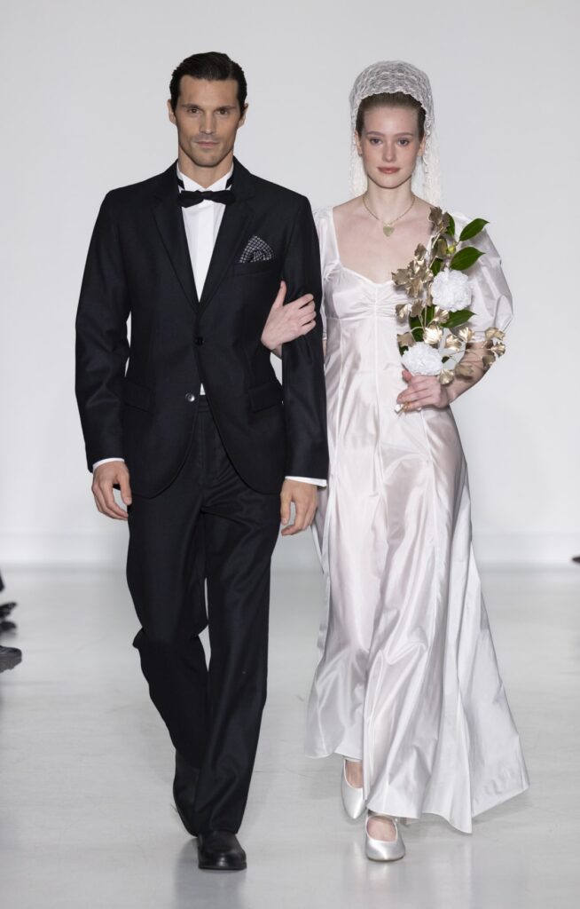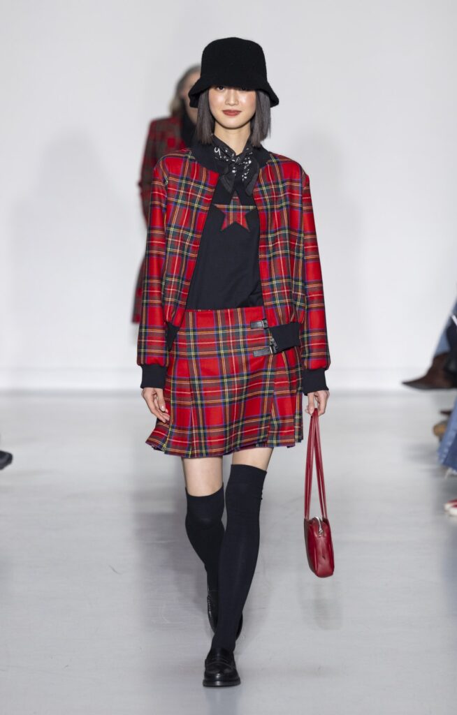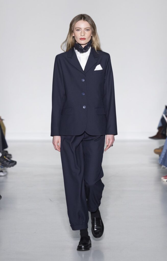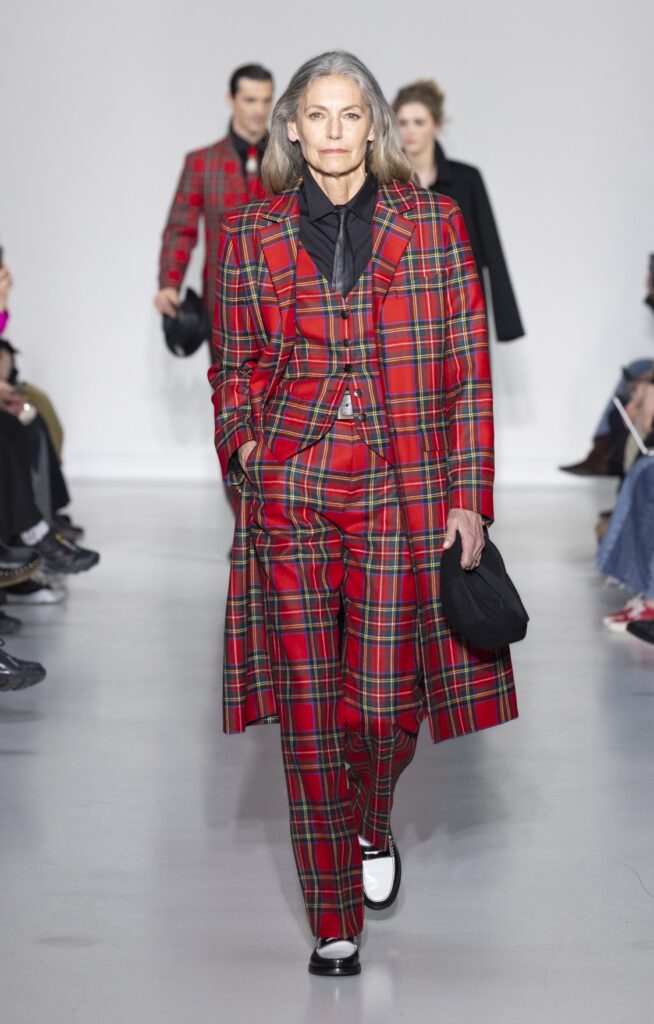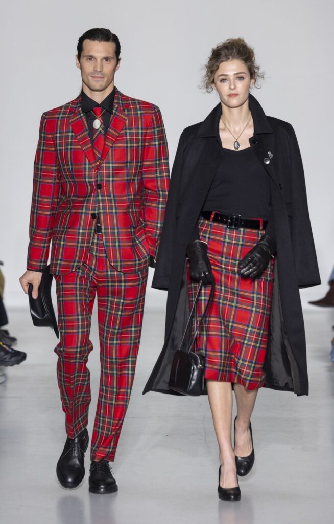 La collection s’ouvre sur du denim brut — veste de travail, pantalon large, coupe non ajustée — et se referme sur un smoking noir et une robe de mariée en satin ivoire avec coiffe en dentelle. Entre ces deux pôles, le vestiaire se déploie sans hiérarchie de genre : hommes et femmes portent les mêmes coupes de tailleur, les mêmes combinaisons utilitaires bleu canard (look 9), les mêmes manteaux à épaules larges. Le tartan Royal Stewart rouge apparaît en tailleur trois pièces long (look 23), en jupe courte (look 22), en complet masculin strict (look 24) — même tissu, trois constructions distinctes, zéro concession à un usage genré.