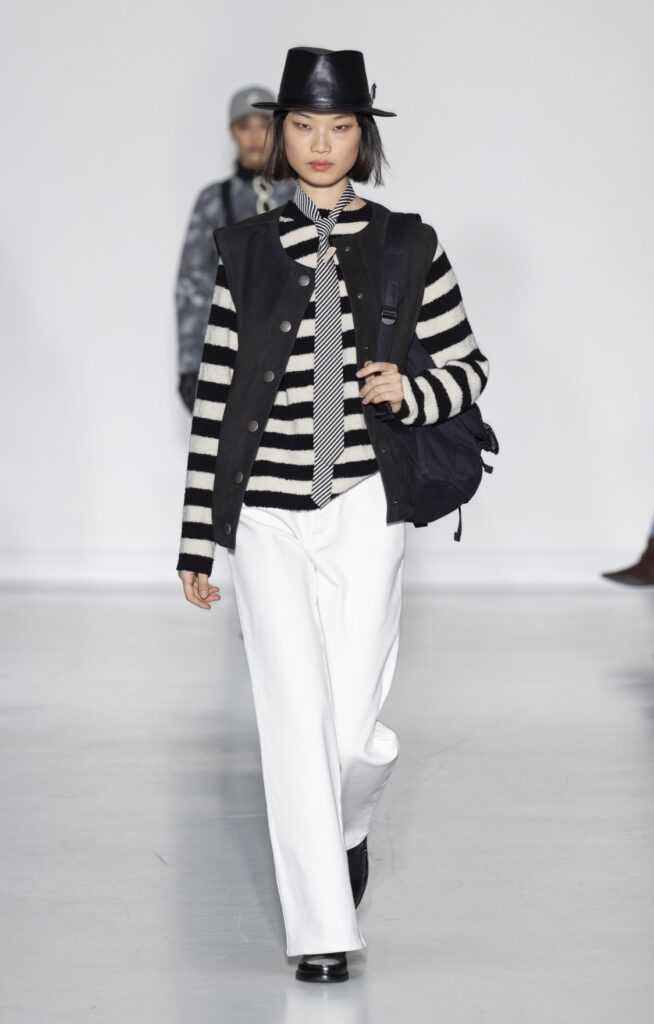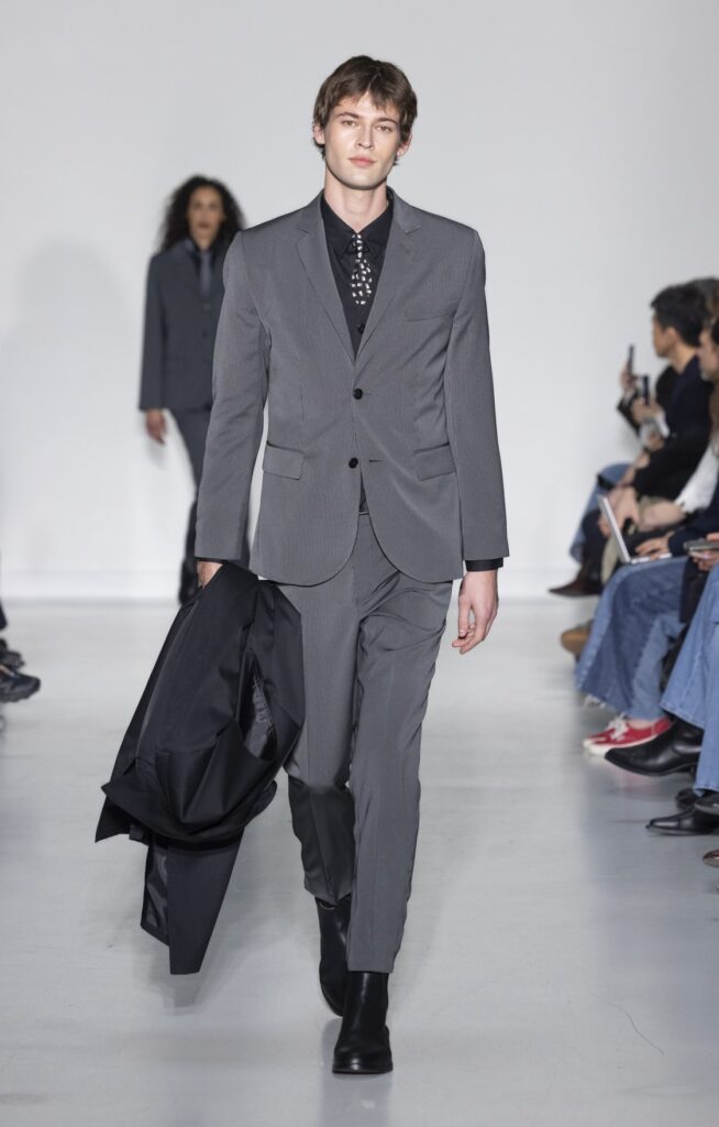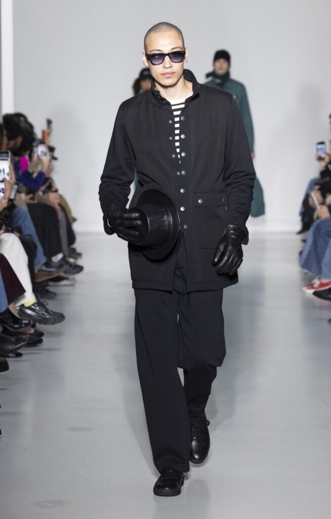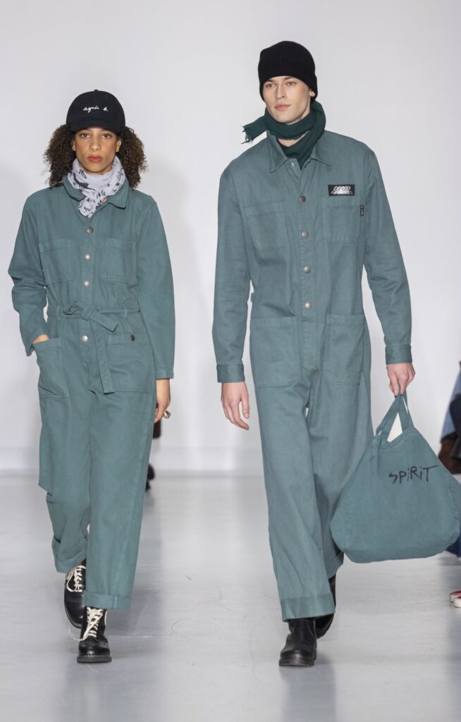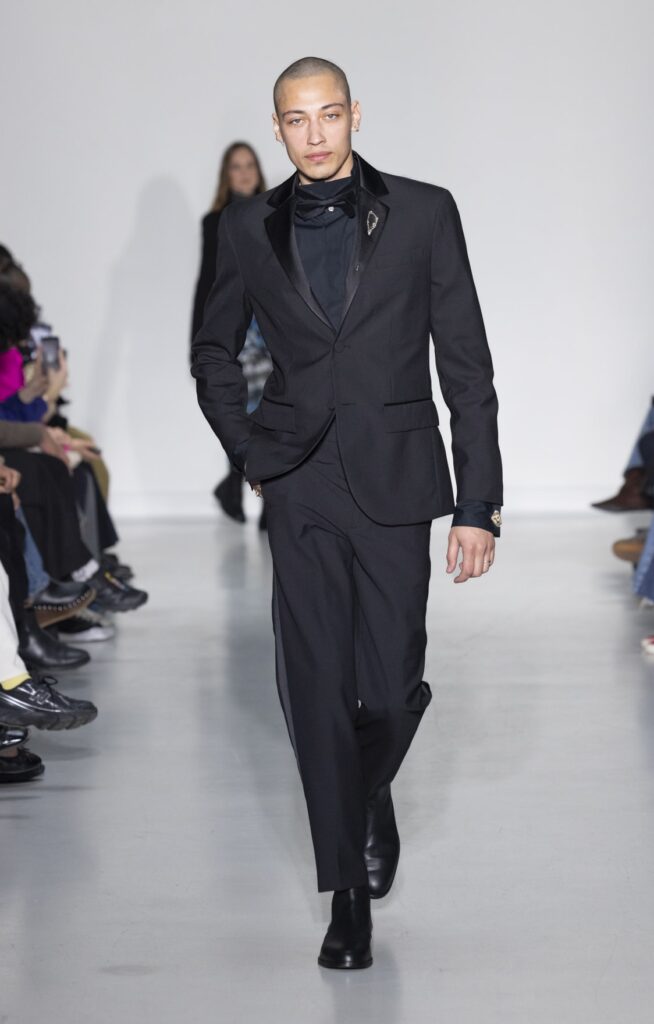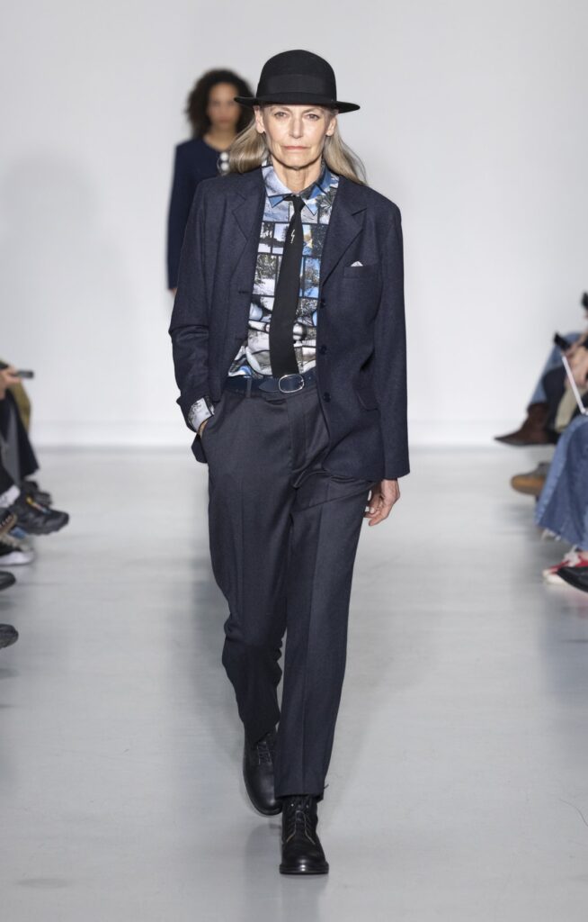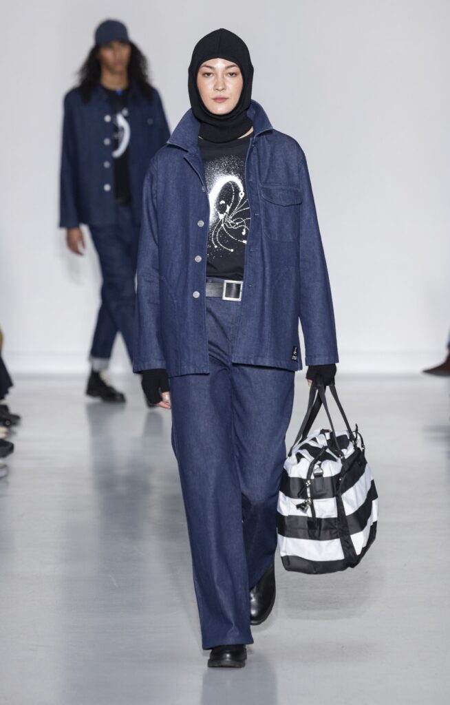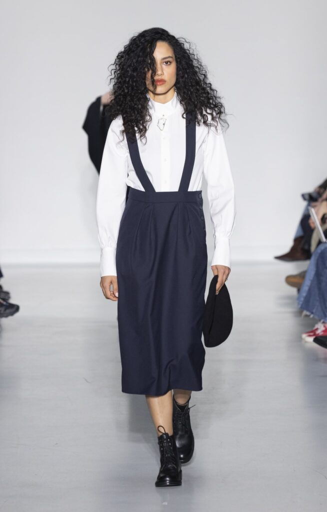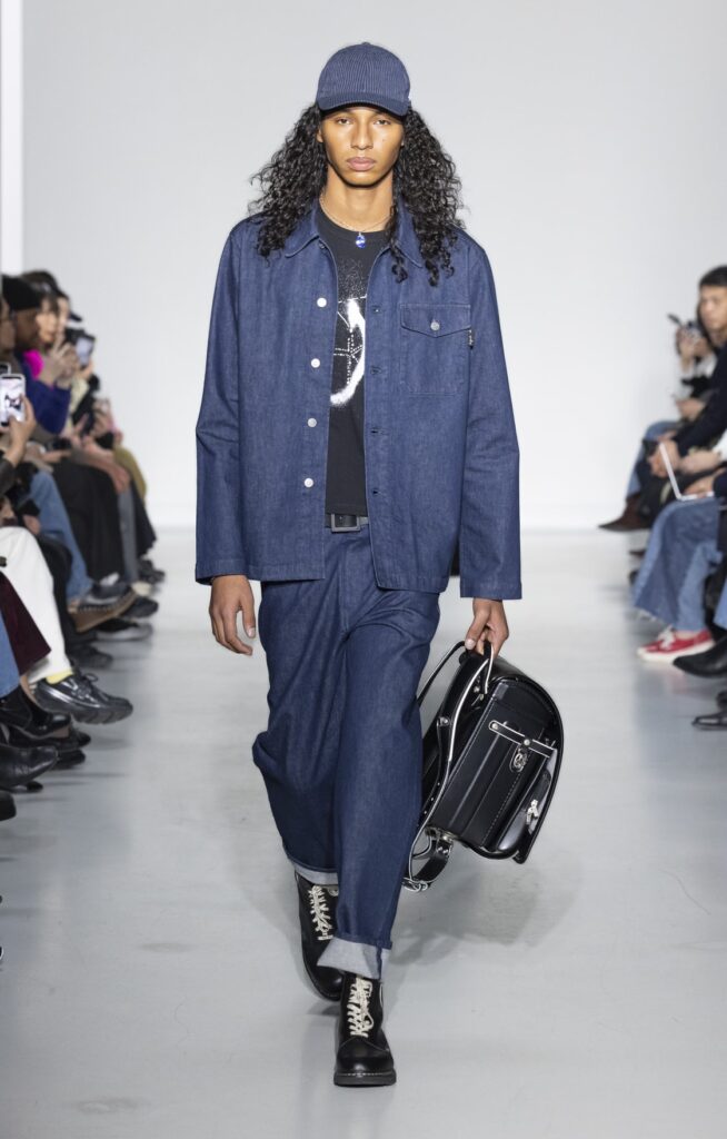 La collection s’ouvre sur du denim brut — veste de travail, pantalon large, coupe non ajustée — et se referme sur un smoking noir et une robe de mariée en satin ivoire avec coiffe en dentelle. Entre ces deux pôles, le vestiaire se déploie sans hiérarchie de genre : hommes et femmes portent les mêmes coupes de tailleur, les mêmes combinaisons utilitaires bleu canard (look 9), les mêmes manteaux à épaules larges. Le tartan Royal Stewart rouge apparaît en tailleur trois pièces long (look 23), en jupe courte (look 22), en complet masculin strict (look 24) — même tissu, trois constructions distinctes, zéro concession à un usage genré.