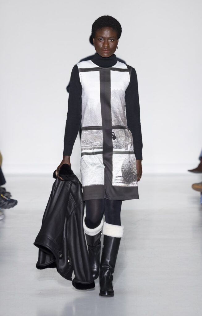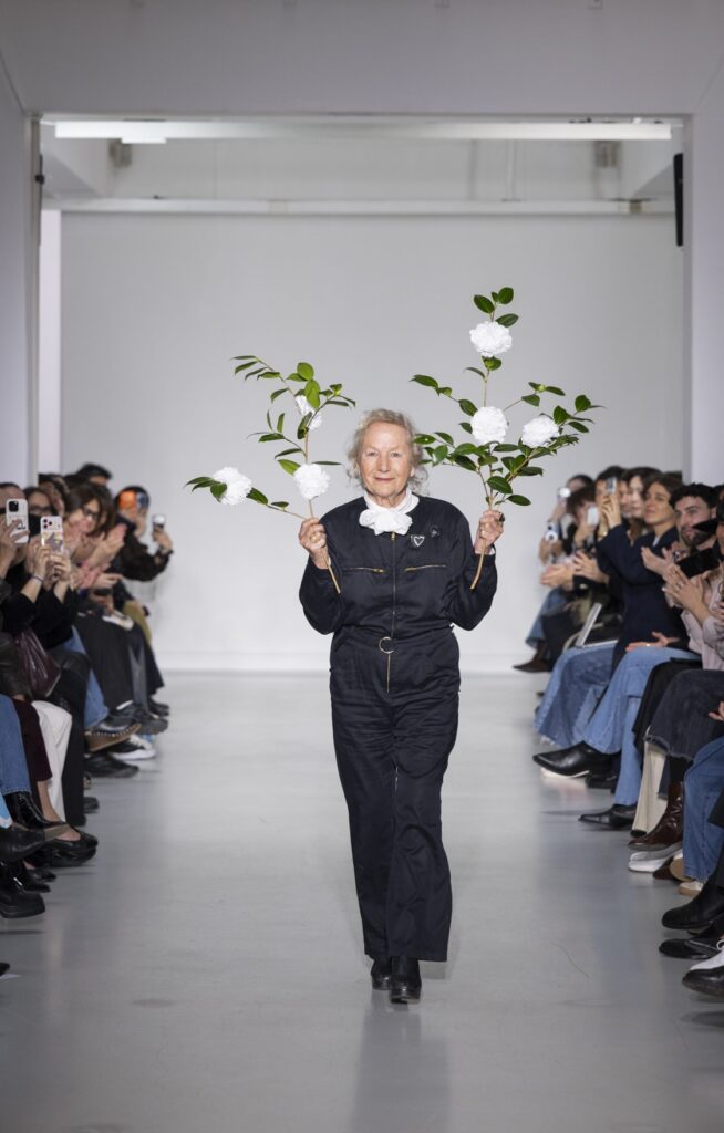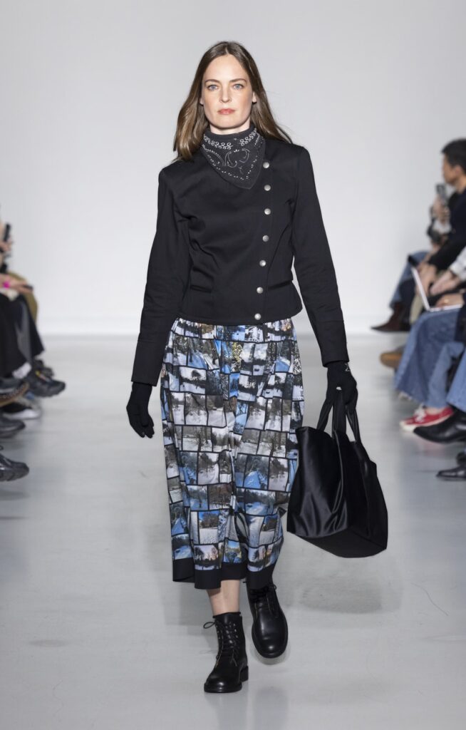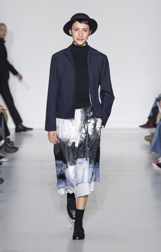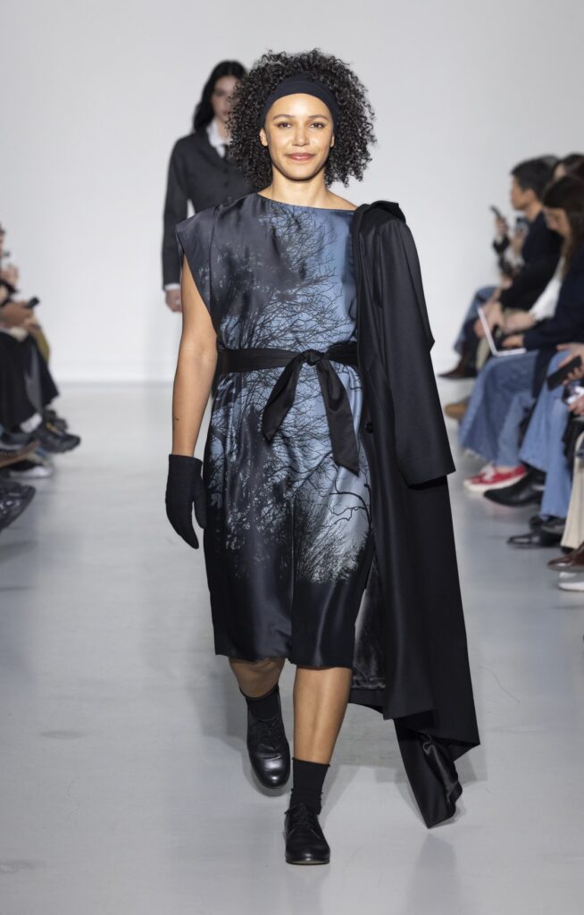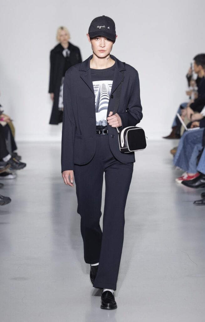 La rue du Jour a une histoire que peu de rues de Paris peuvent revendiquer : depuis 1975, elle abrite une maison qui a exposé des photographes avant de les mettre sur des vêtements. Ce détail n’est pas anecdotique. Chez agnès b., le passage de la galerie au tissu n’a jamais été une opération marketing — c’était une cohérence. La collection Automne-Hiver 2026-2027 présentée le 9 mars à Paris reconduit cette logique sur au moins une douzaine de pièces : impressions d’arbres hivernaux sur satin, couchers de soleil reportés sur des vestes structurées, planches contacts transposées en pantalons larges, grilles haussmanniennes sur des robes droites.