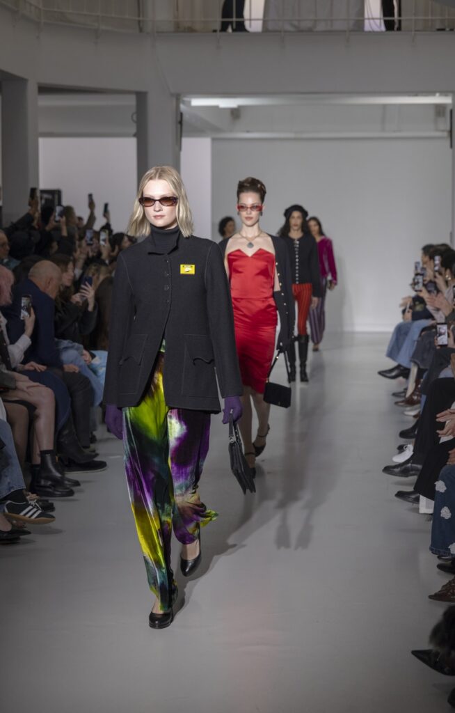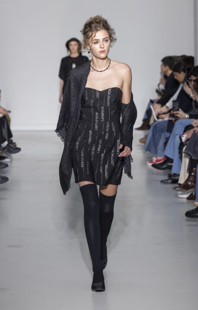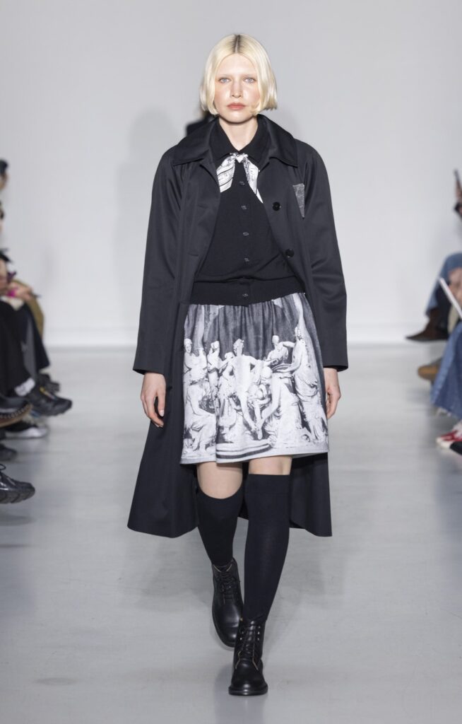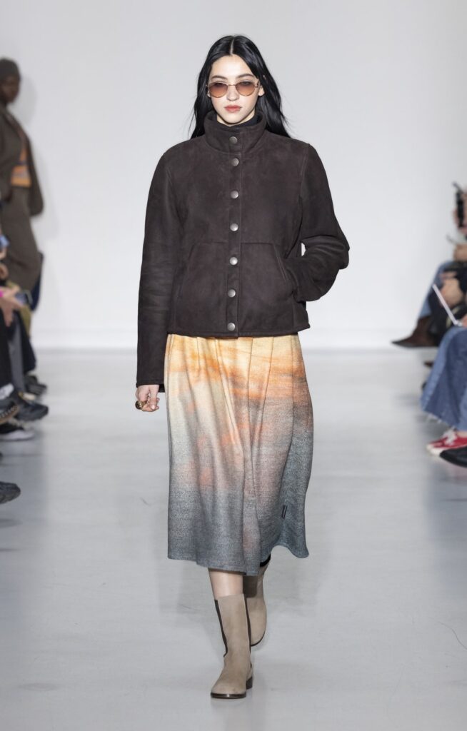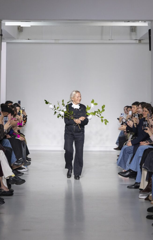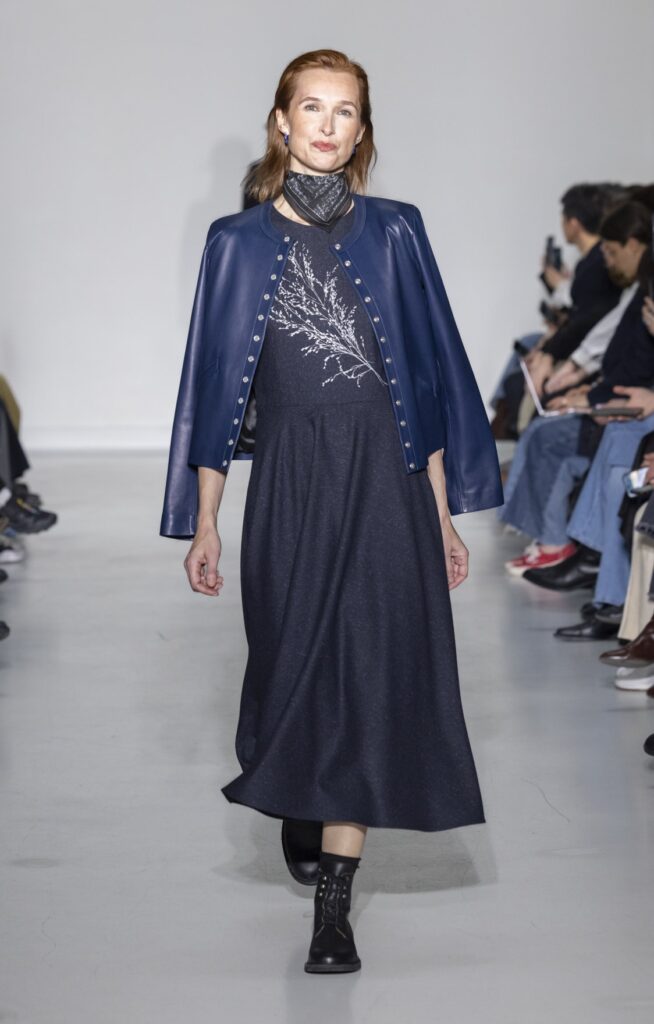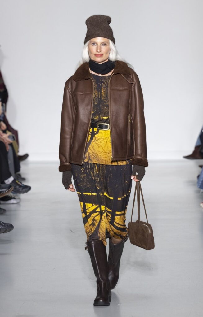 La rue du Jour a une histoire que peu de rues de Paris peuvent revendiquer : depuis 1975, elle abrite une maison qui a exposé des photographes avant de les mettre sur des vêtements. Ce détail n’est pas anecdotique. Chez agnès b., le passage de la galerie au tissu n’a jamais été une opération marketing — c’était une cohérence. La collection Automne-Hiver 2026-2027 présentée le 9 mars à Paris reconduit cette logique sur au moins une douzaine de pièces : impressions d’arbres hivernaux sur satin, couchers de soleil reportés sur des vestes structurées, planches contacts transposées en pantalons larges, grilles haussmanniennes sur des robes droites.