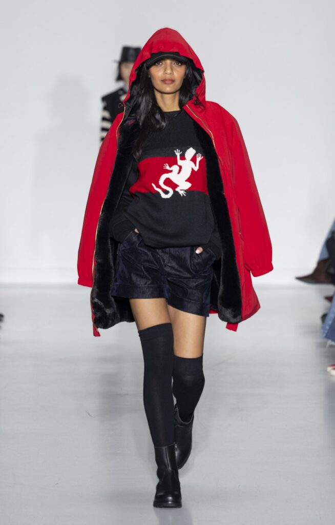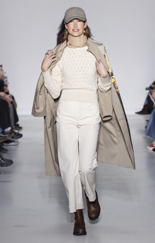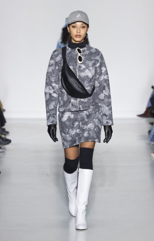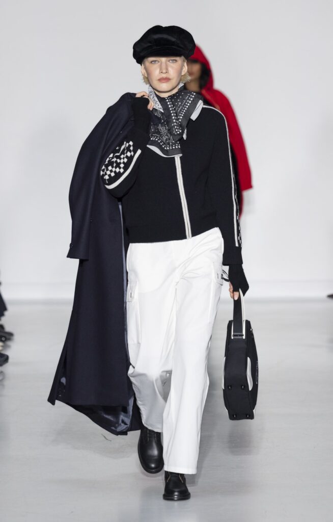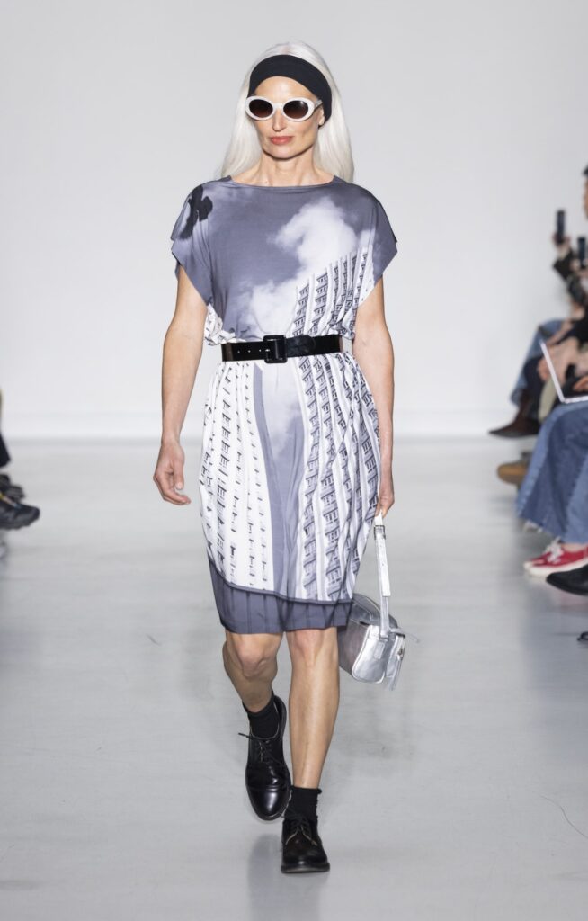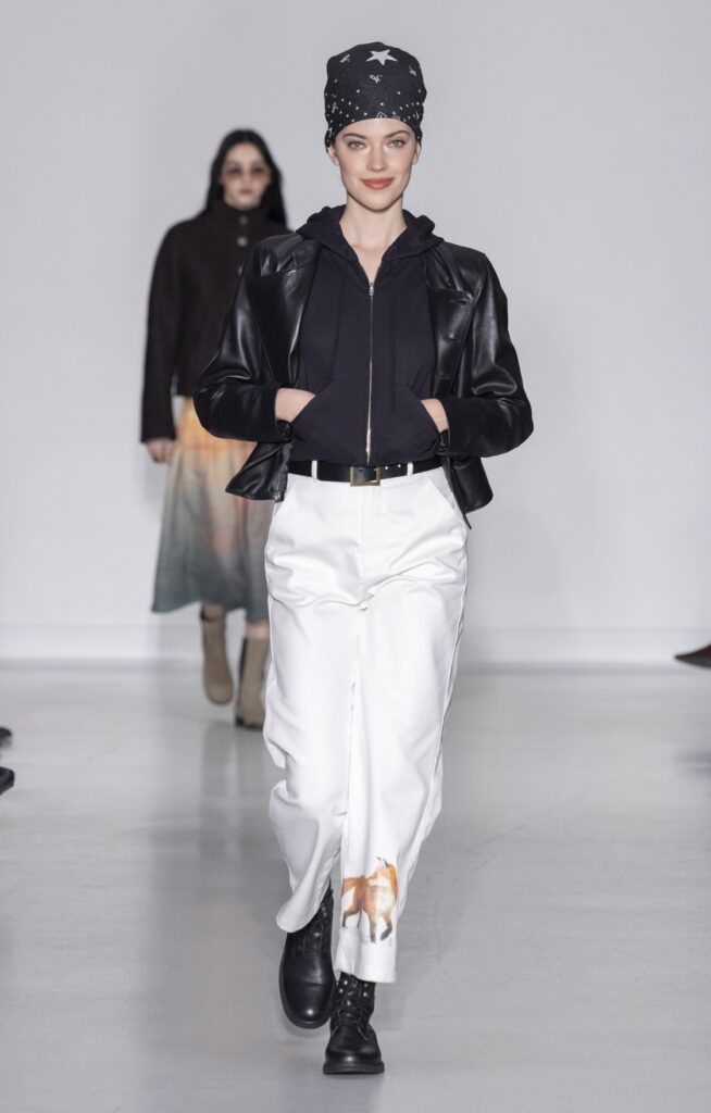 La rue du Jour a une histoire que peu de rues de Paris peuvent revendiquer : depuis 1975, elle abrite une maison qui a exposé des photographes avant de les mettre sur des vêtements. Ce détail n’est pas anecdotique. Chez agnès b., le passage de la galerie au tissu n’a jamais été une opération marketing — c’était une cohérence. La collection Automne-Hiver 2026-2027 présentée le 9 mars à Paris reconduit cette logique sur au moins une douzaine de pièces : impressions d’arbres hivernaux sur satin, couchers de soleil reportés sur des vestes structurées, planches contacts transposées en pantalons larges, grilles haussmanniennes sur des robes droites.