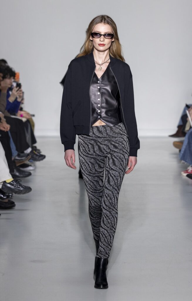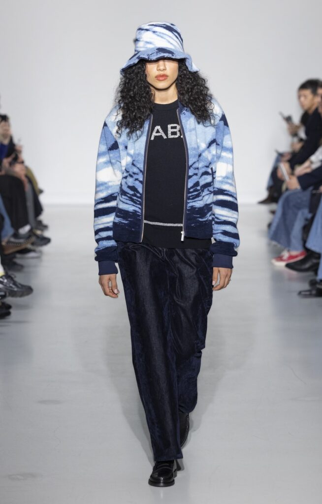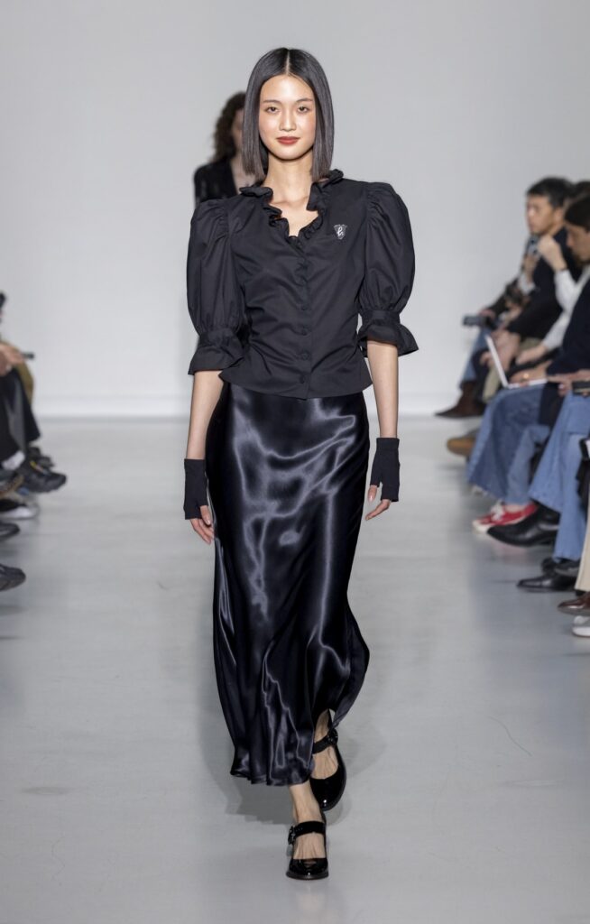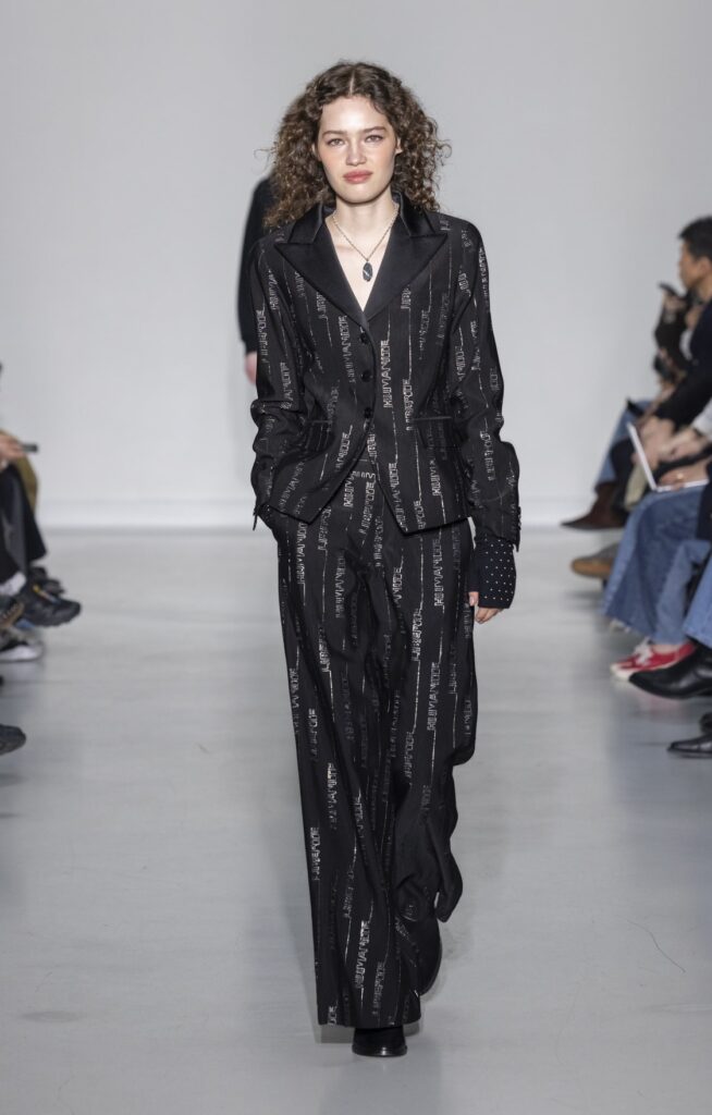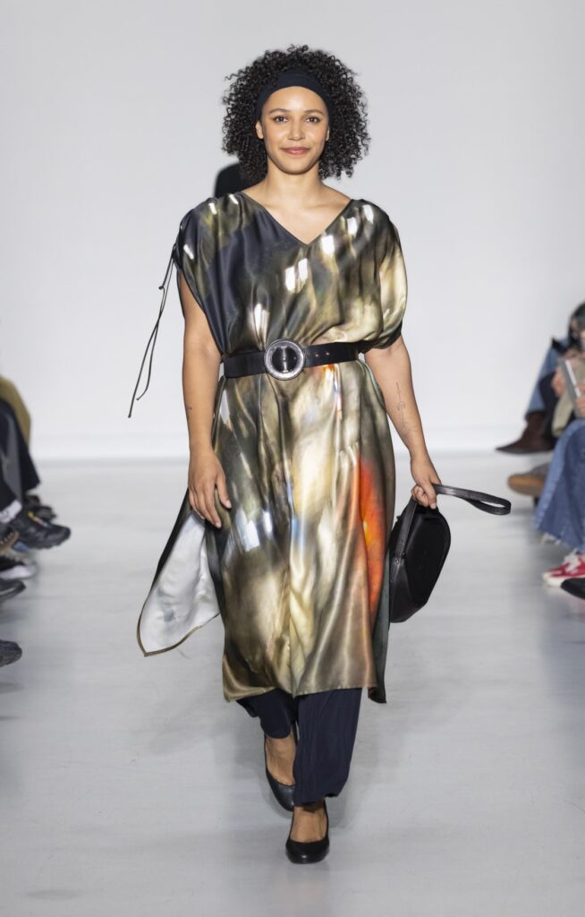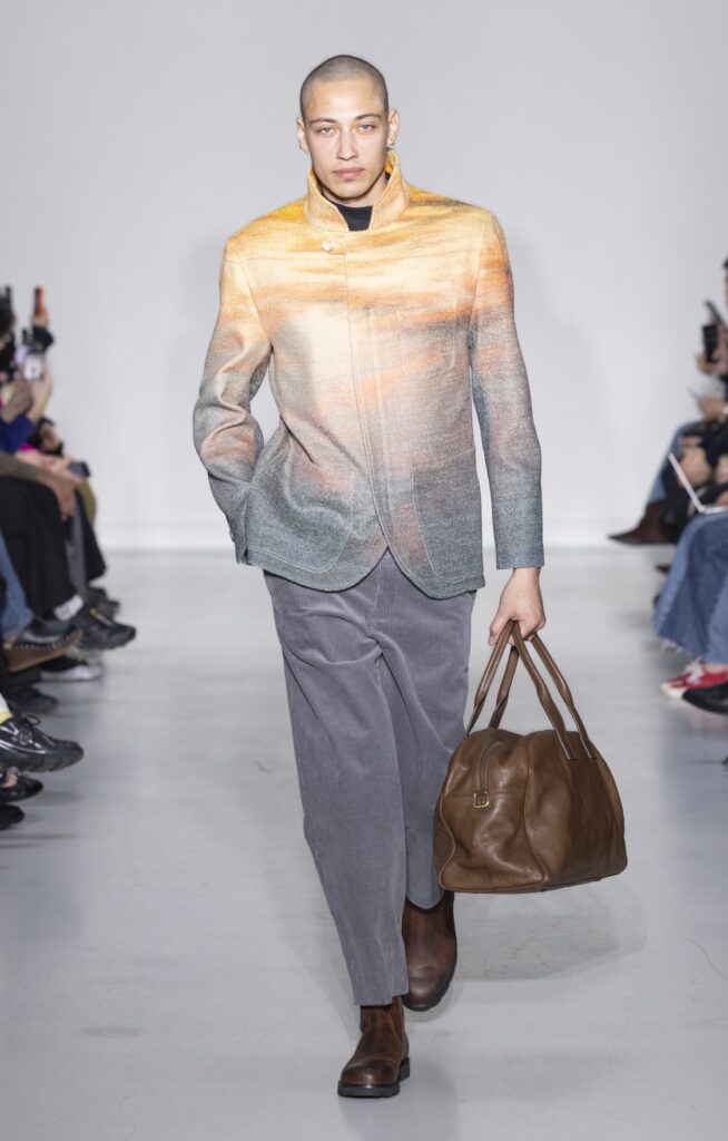 La technique du transfert photographique sur tissu pose des contraintes que l’impression numérique standard ne résout pas entièrement. La main du tissu doit accepter l’encre sans perdre son tombé ; les zones de transition entre le fond du vêtement et le motif imprimé révèlent la qualité de la préparation de surface. Sur les looks en satin (notamment look 32, look 48), le rendu lumineux de la matière amplifie les dégradés photographiques — l’image ne recouvre pas le tissu, elle l’habite. Sur les pantalons en velours de coton (look 38), la trame absorbe l’encre différemment et produit un effet plus mat, plus proche du tirage papier.