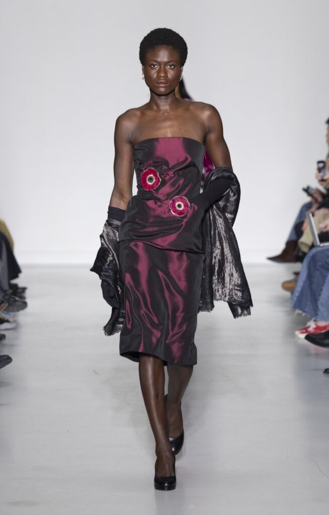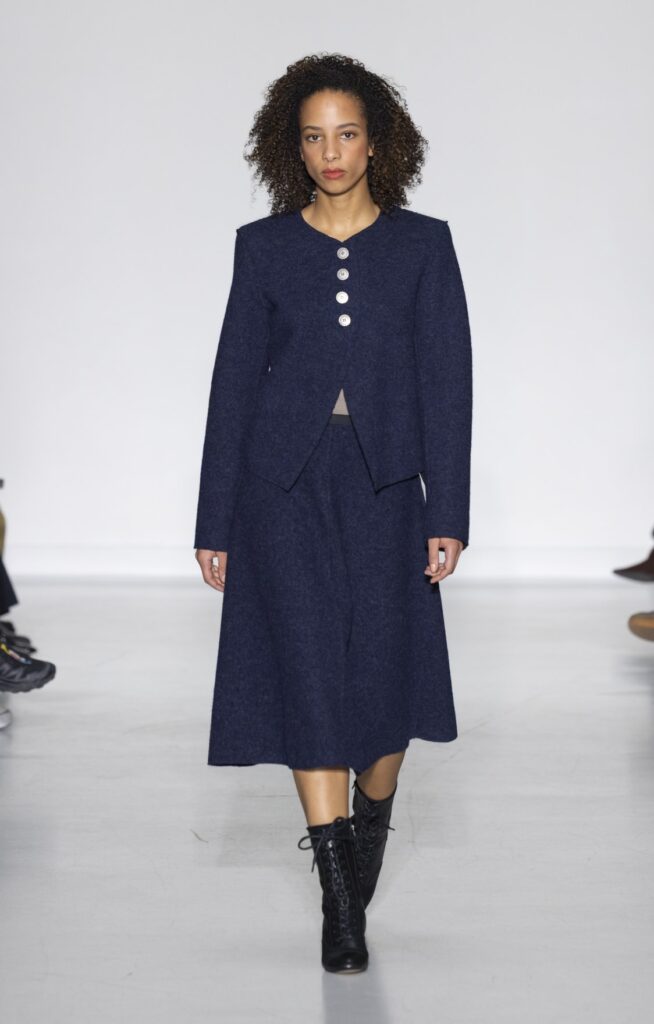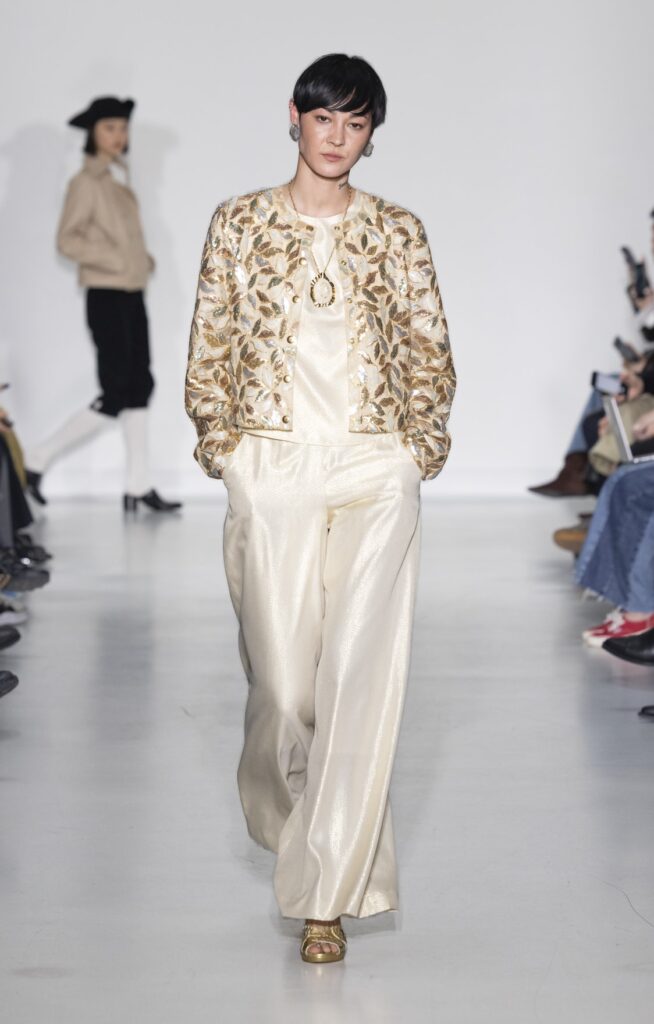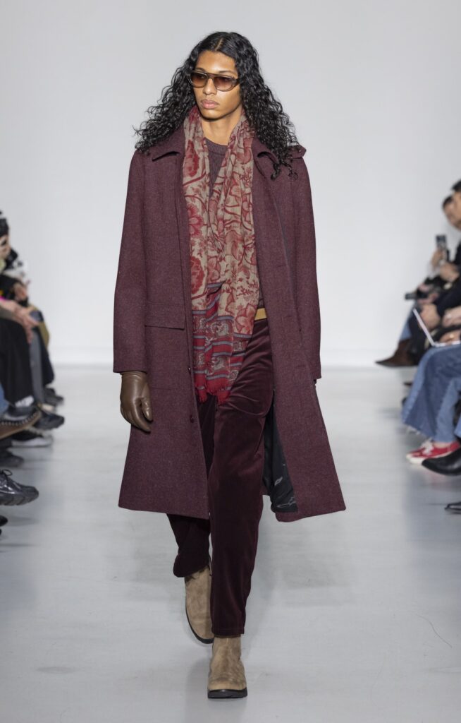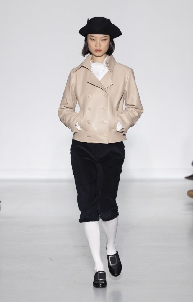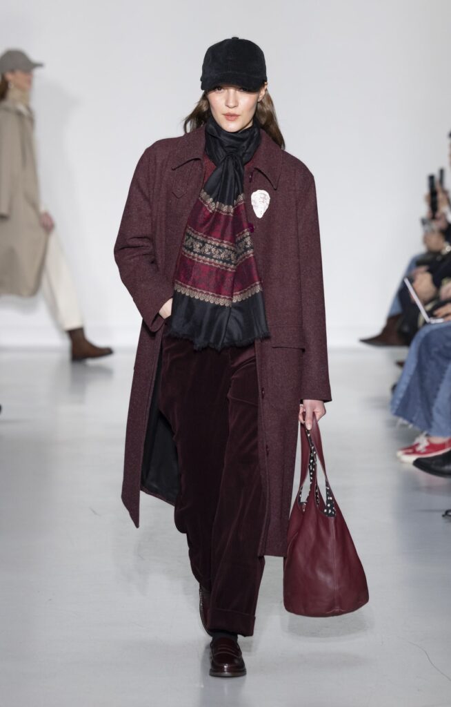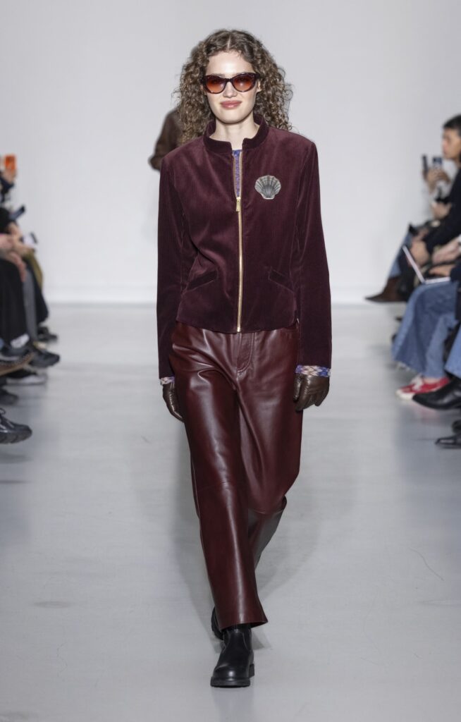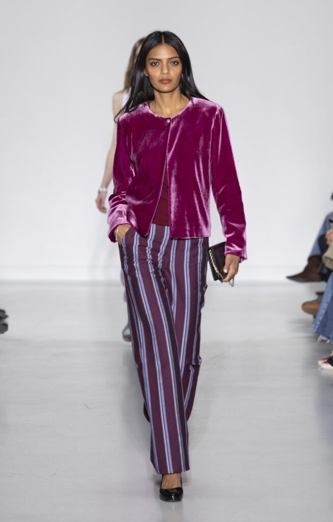 Le velours traverse la collection dans plusieurs registres chromatiques : prune profond (look 10), bordeaux (look 53), marine nuit (look 41). Sur chacun, la coupe reste simple — blazer court, veste sans col, jupe droite — comme si la matière suffisait à porter la saison sans avoir besoin d’une silhouette complexe.