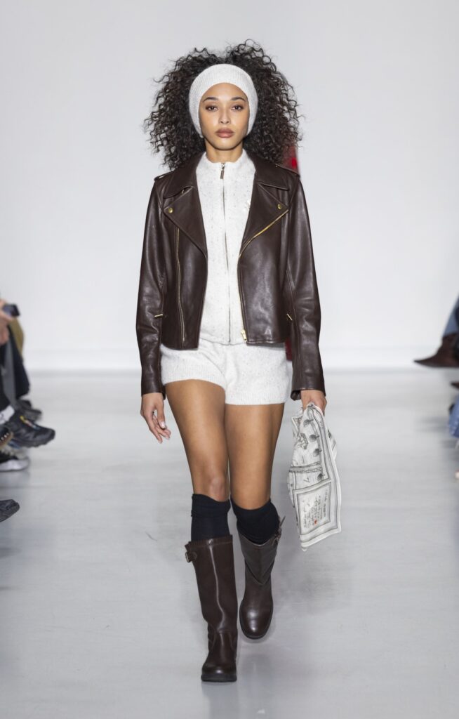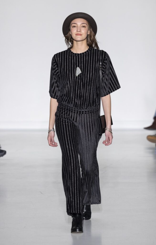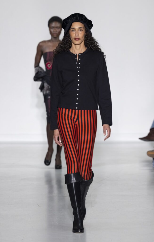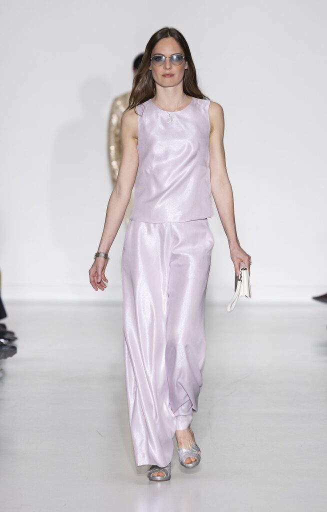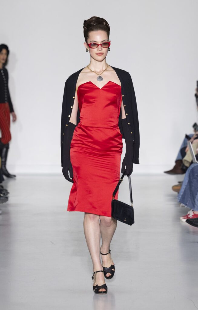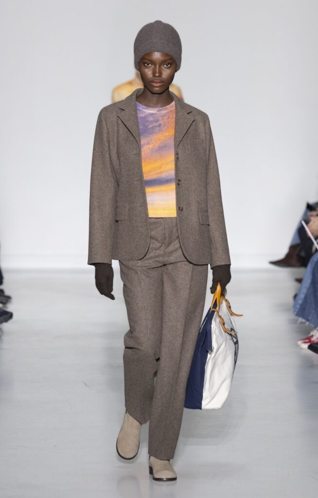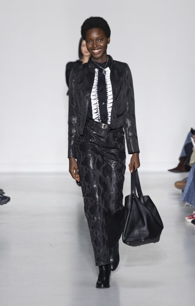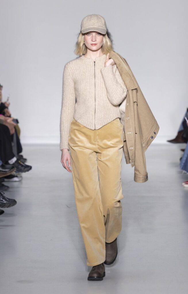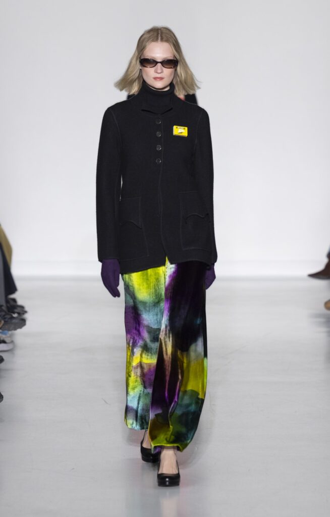Le velours traverse la collection dans plusieurs registres chromatiques : prune profond (look 10), bordeaux (look 53), marine nuit (look 41). Sur chacun, la coupe reste simple — blazer court, veste sans col, jupe droite — comme si la matière suffisait à porter la saison sans avoir besoin d’une silhouette complexe.
