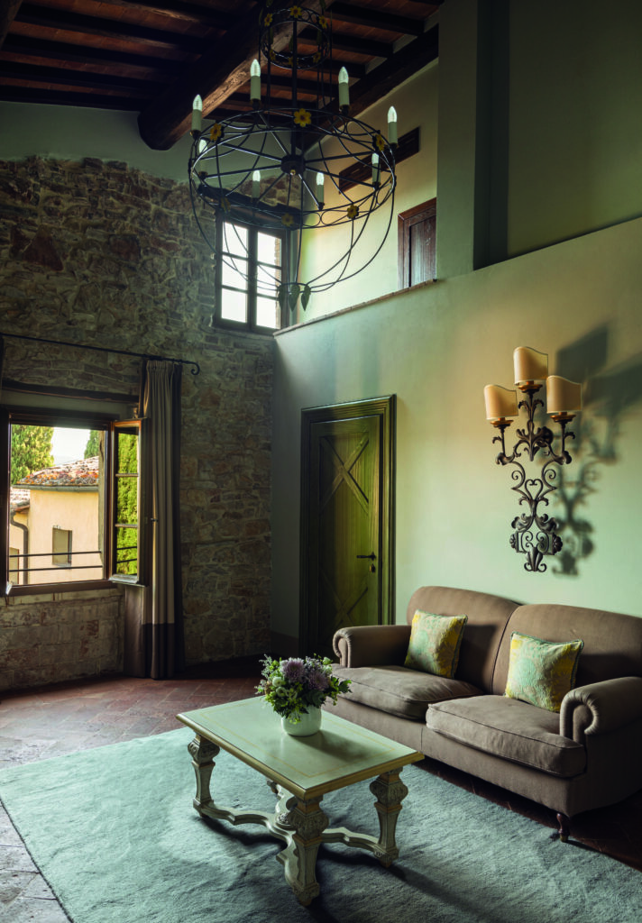 La véritable intervention contemporaine se lit dans l’espace d’accueil, rebaptisé Secret Garden. Plutôt que de recourir à des matériaux d’importation, la direction artistique a confié la curation murale à l’artiste peintre Elena Carozzi. Ses fresques, exécutées à la main directement sur l’enduit, exigent une temporalité de création lente et relient le geste artisanal contemporain à la tradition des botteghe (ateliers) florentins.