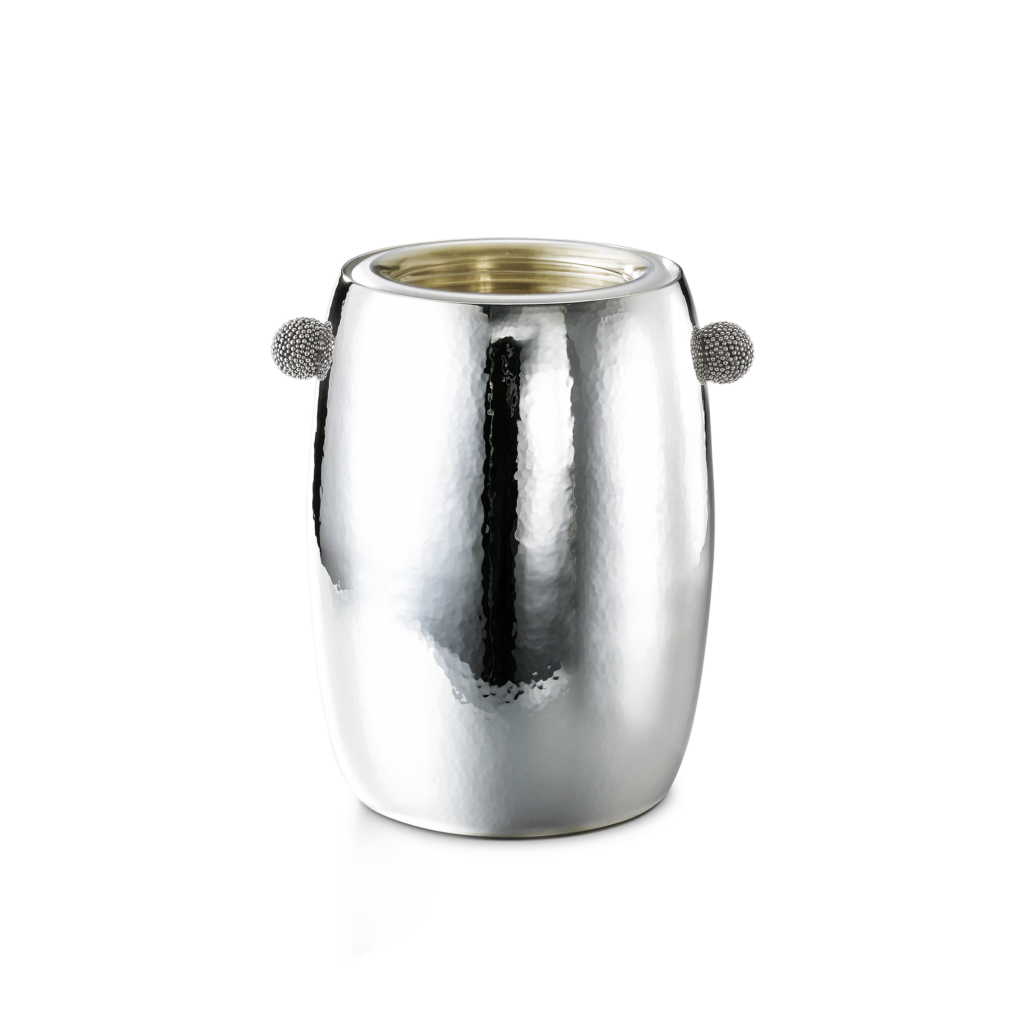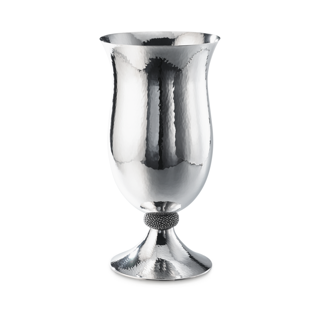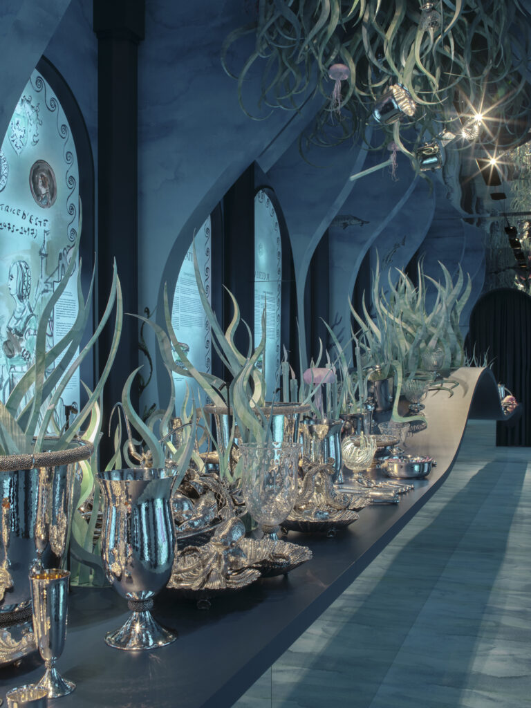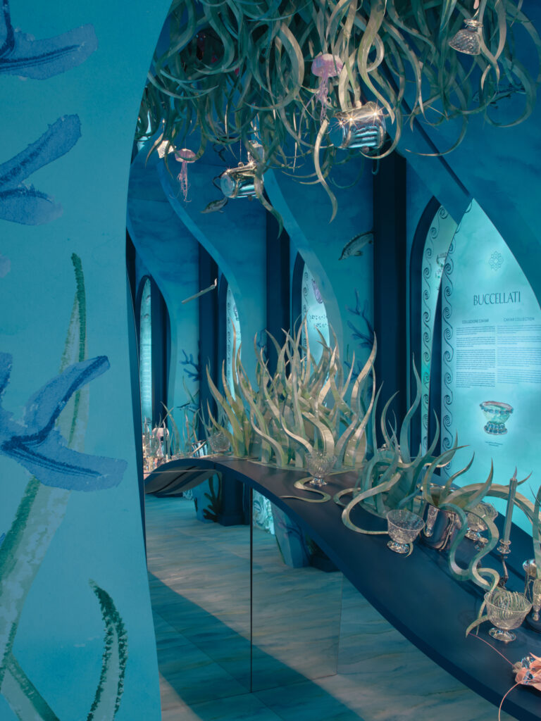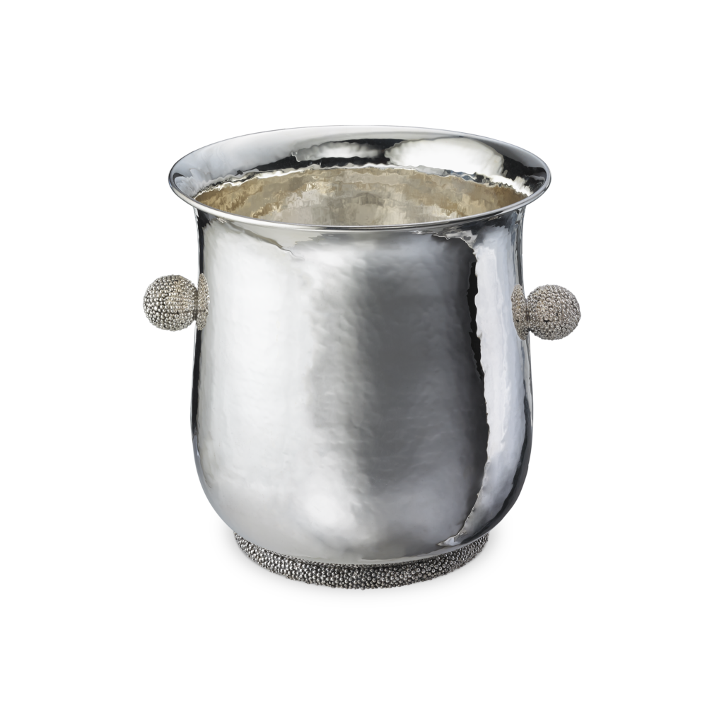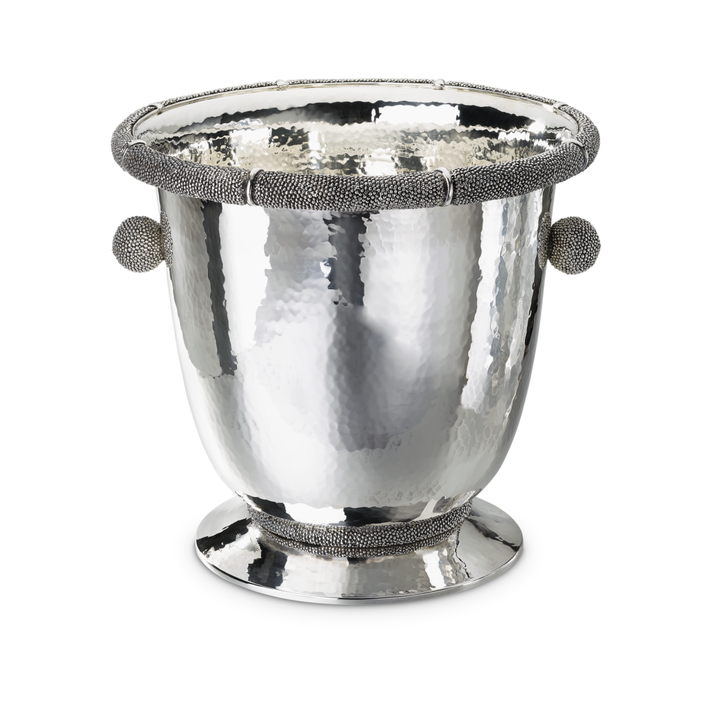 Ce motif n’est pas nouveau. Il appartient au vocabulaire formel de la Maison, identifiable sans signature, et s’inscrit dans une continuité qui traverse à la fois la joaillerie et l’orfèvrerie. Ici, il se déploie sur des objets de table — cuillères à caviar, plateaux, assiettes, seaux à glace, verres de Murano, flûtes — auxquels viennent désormais s’ajouter un service complet de couverts, deux bols à caviar et une assiette à pain.