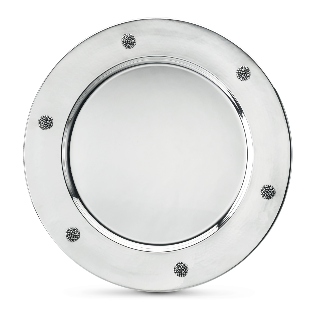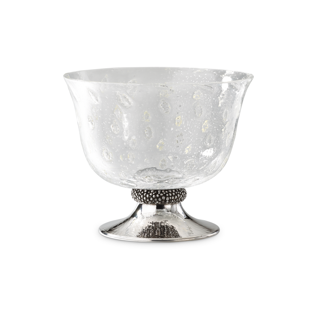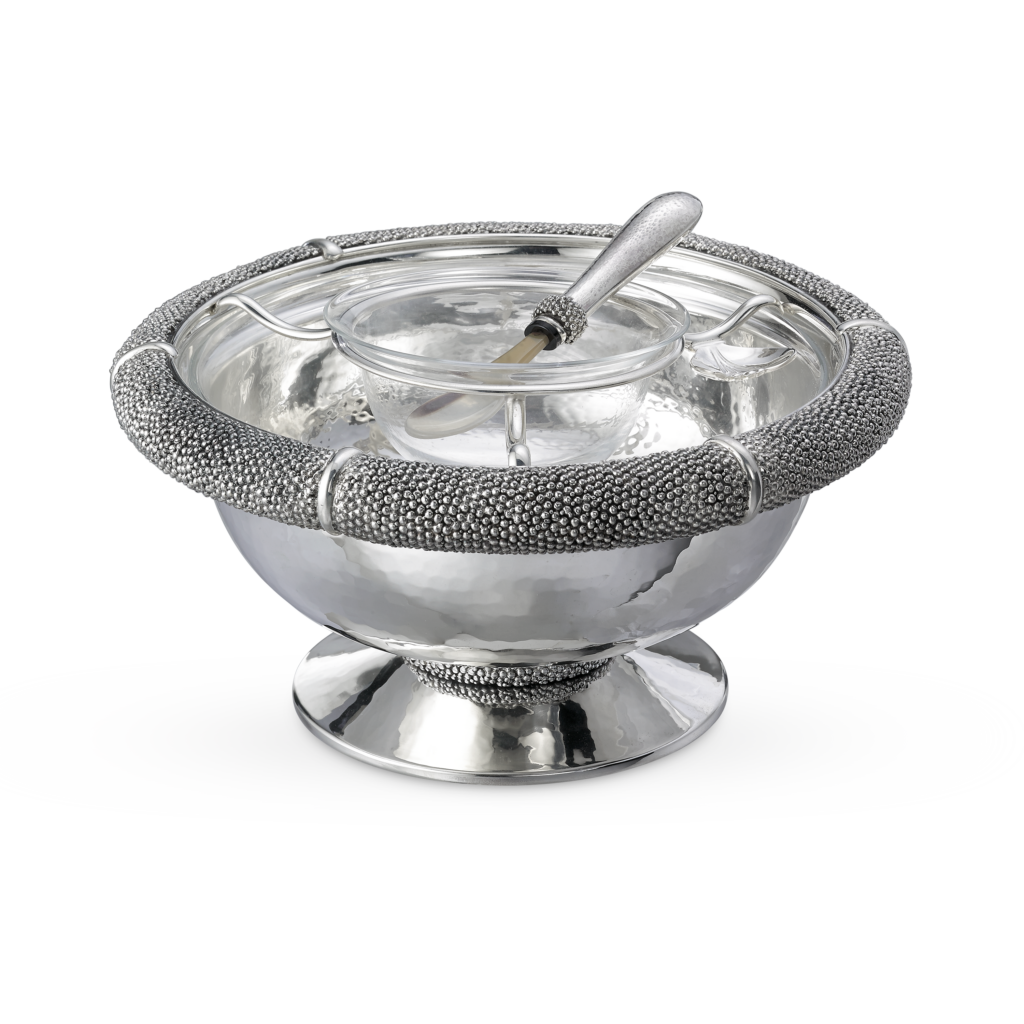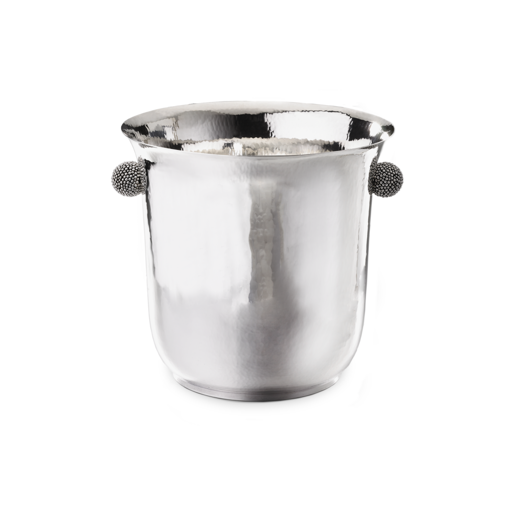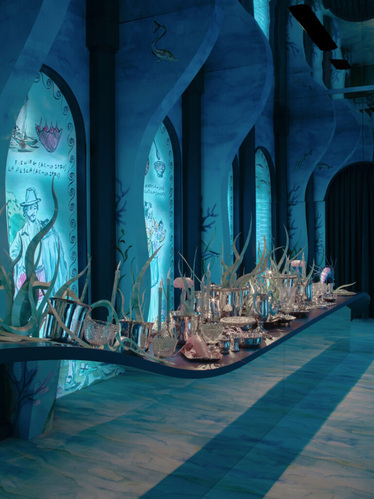 Ce motif n’est pas nouveau. Il appartient au vocabulaire formel de la Maison, identifiable sans signature, et s’inscrit dans une continuité qui traverse à la fois la joaillerie et l’orfèvrerie. Ici, il se déploie sur des objets de table — cuillères à caviar, plateaux, assiettes, seaux à glace, verres de Murano, flûtes — auxquels viennent désormais s’ajouter un service complet de couverts, deux bols à caviar et une assiette à pain.