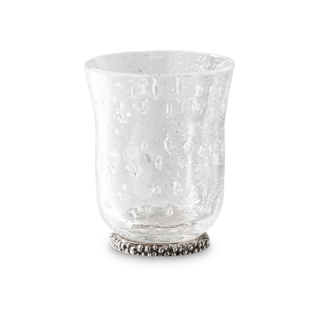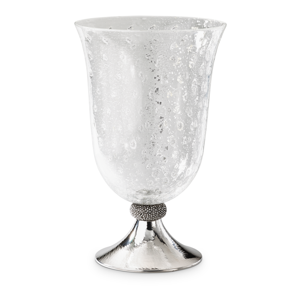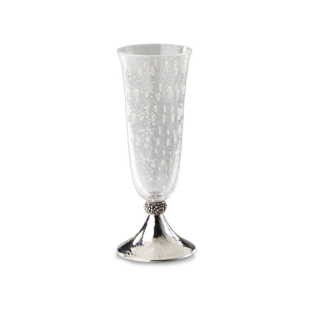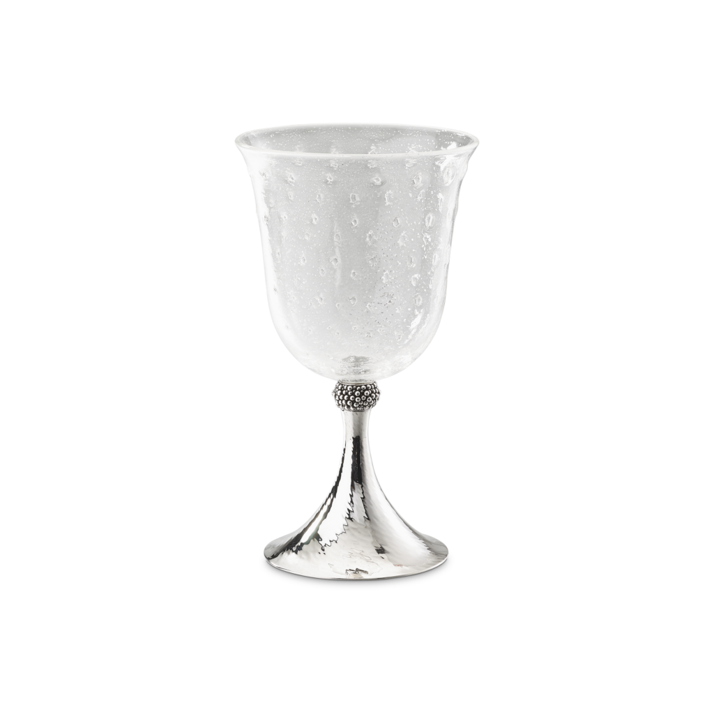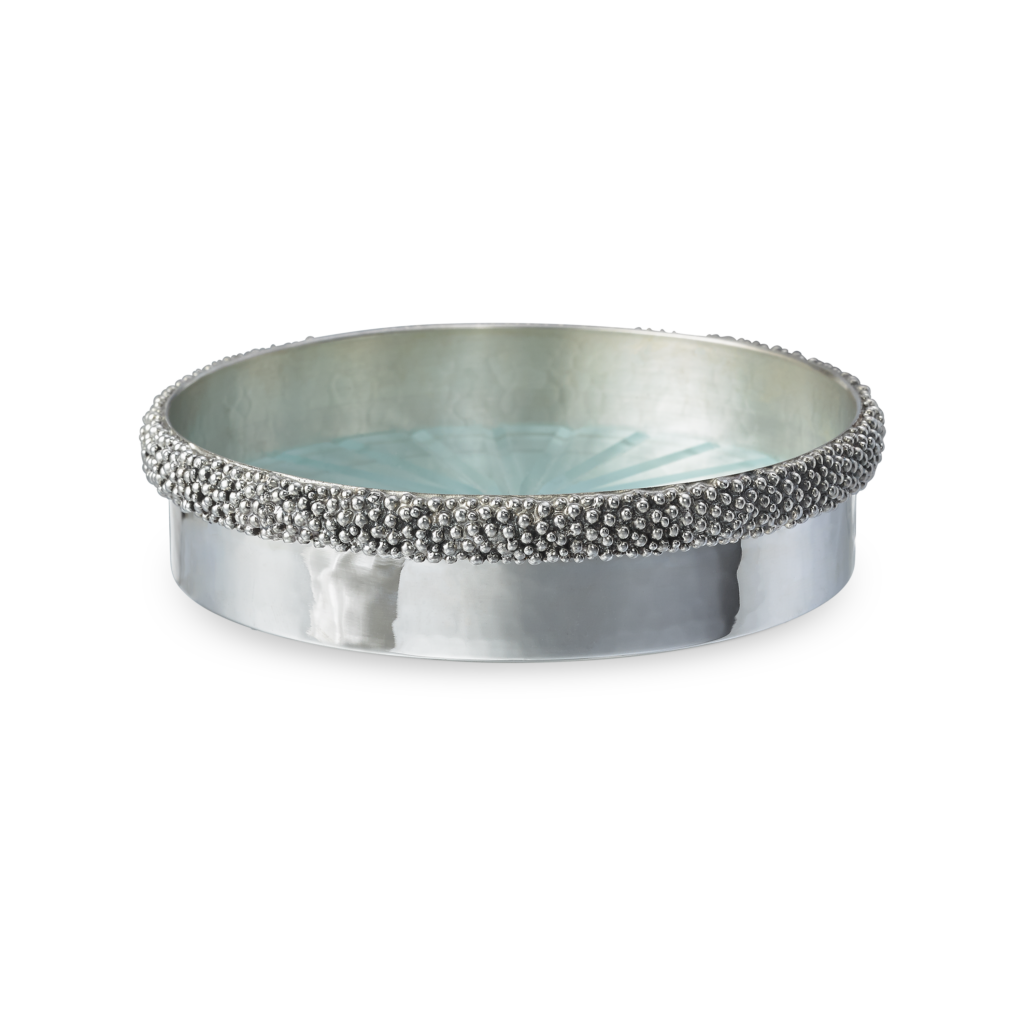 Ce motif n’est pas nouveau. Il appartient au vocabulaire formel de la Maison, identifiable sans signature, et s’inscrit dans une continuité qui traverse à la fois la joaillerie et l’orfèvrerie. Ici, il se déploie sur des objets de table — cuillères à caviar, plateaux, assiettes, seaux à glace, verres de Murano, flûtes — auxquels viennent désormais s’ajouter un service complet de couverts, deux bols à caviar et une assiette à pain.