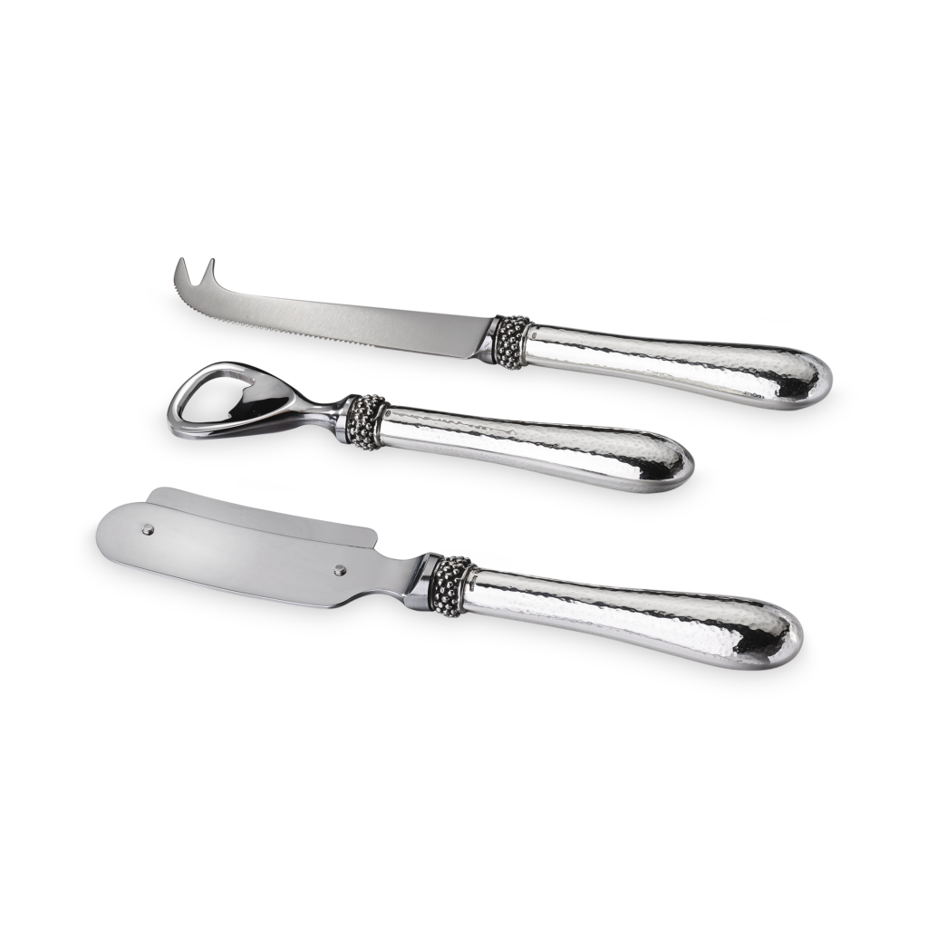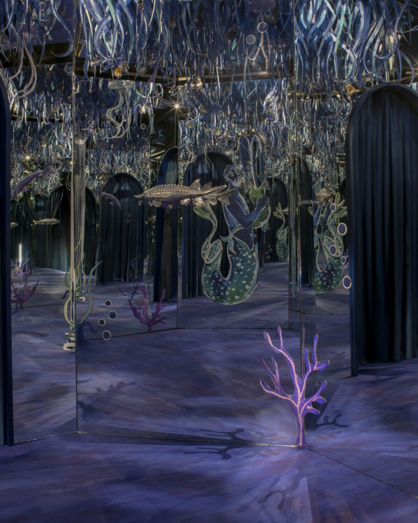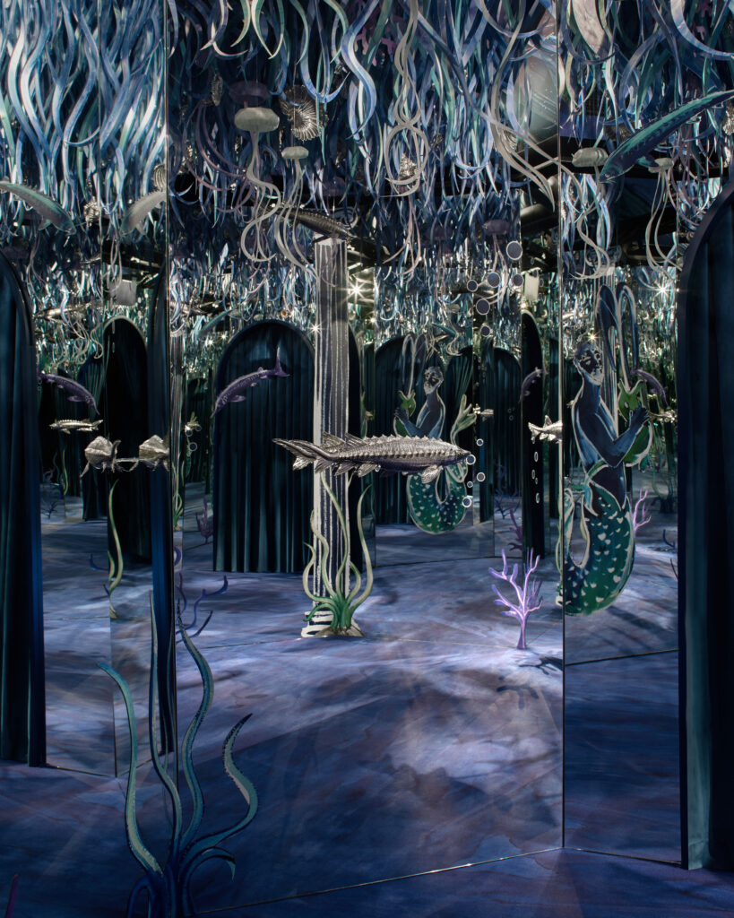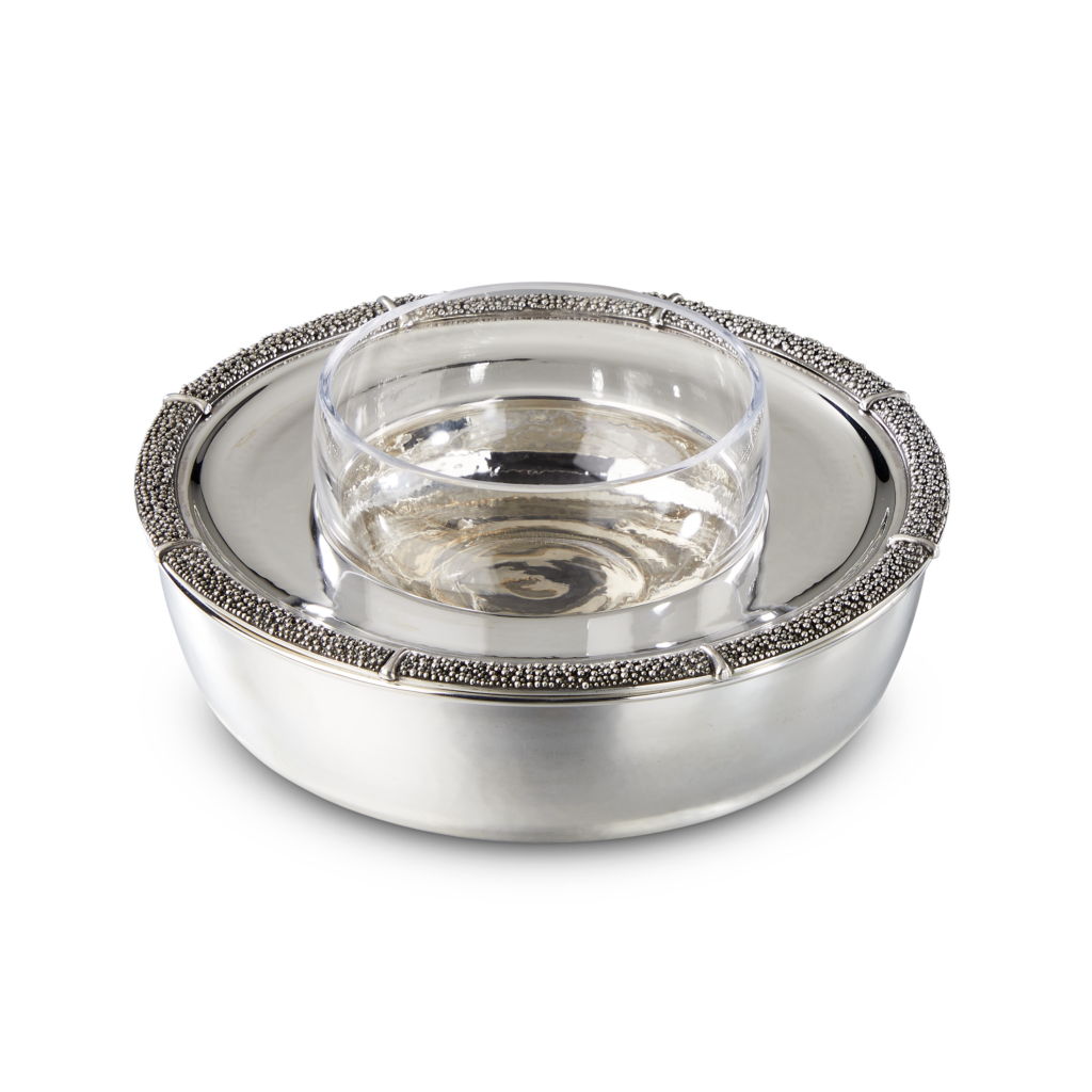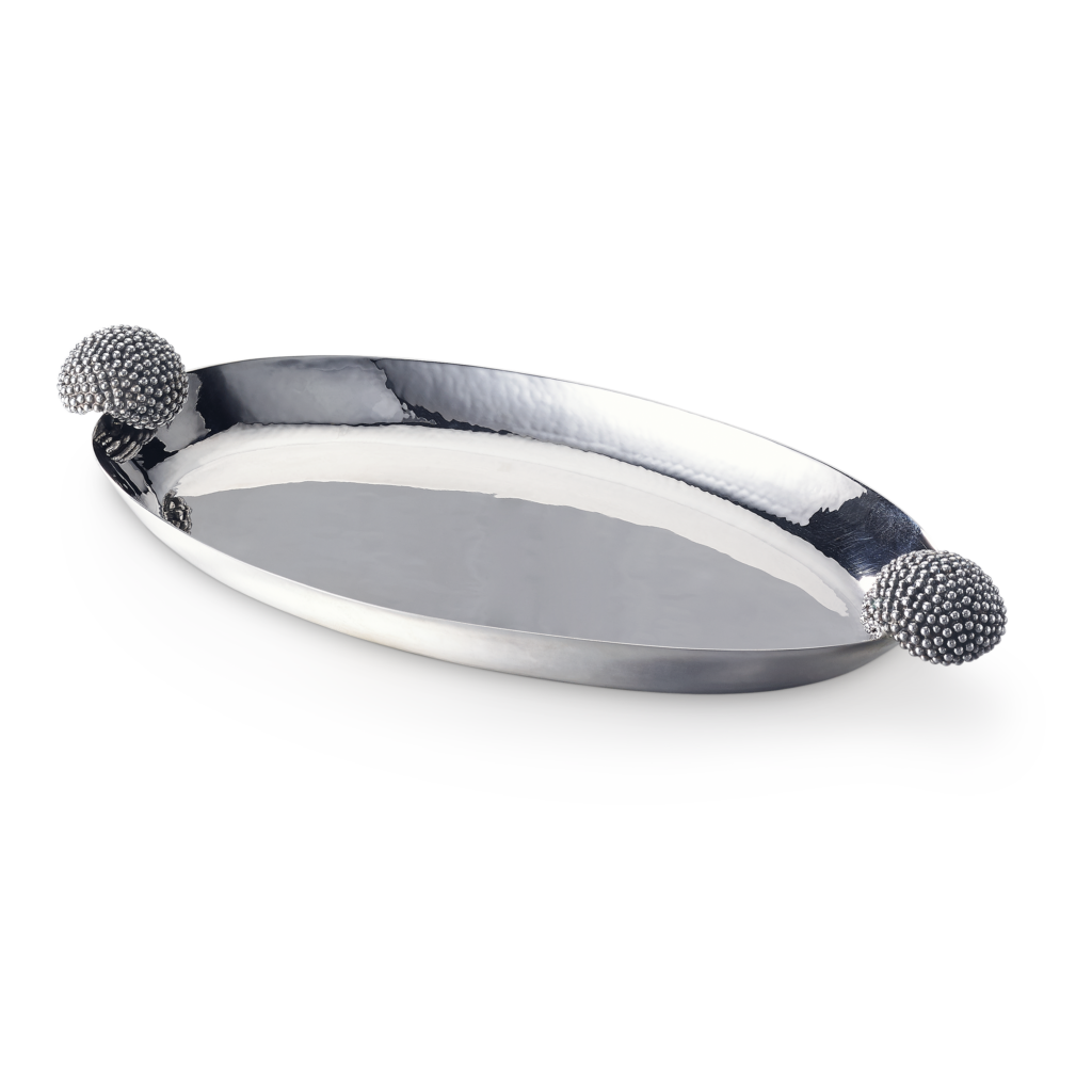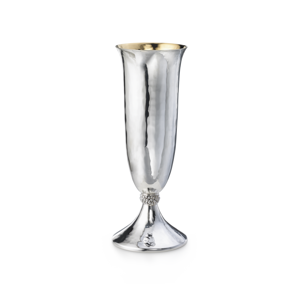 Ce motif n’est pas nouveau. Il appartient au vocabulaire formel de la Maison, identifiable sans signature, et s’inscrit dans une continuité qui traverse à la fois la joaillerie et l’orfèvrerie. Ici, il se déploie sur des objets de table — cuillères à caviar, plateaux, assiettes, seaux à glace, verres de Murano, flûtes — auxquels viennent désormais s’ajouter un service complet de couverts, deux bols à caviar et une assiette à pain.