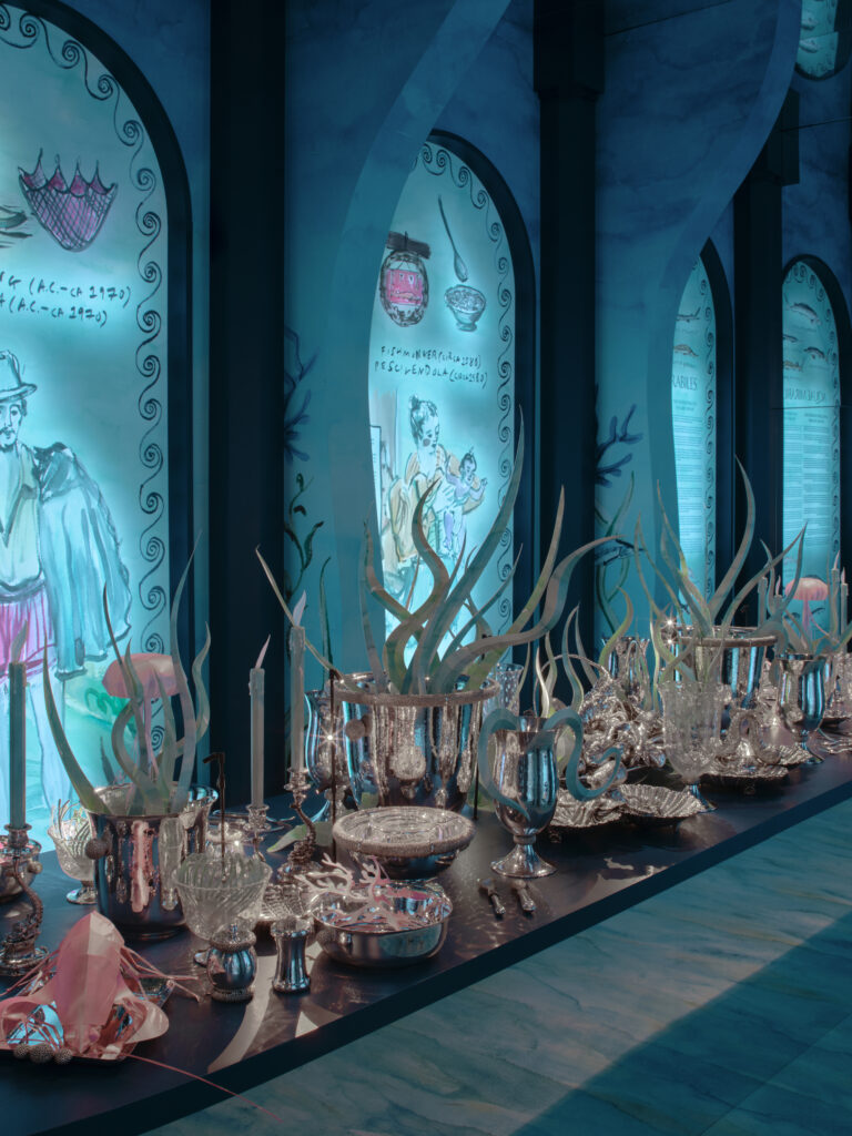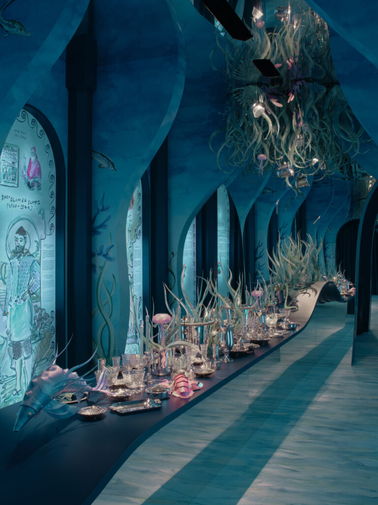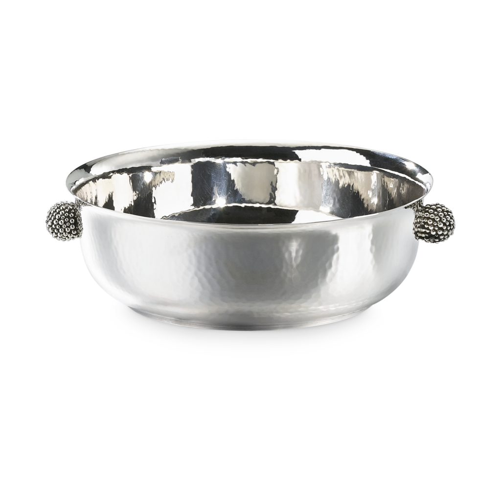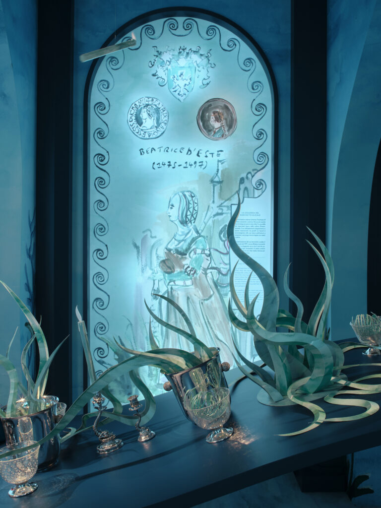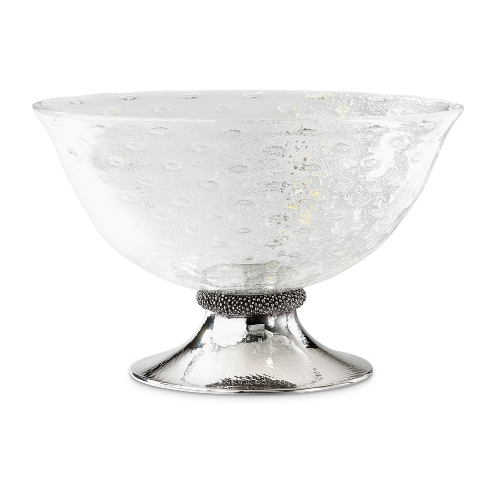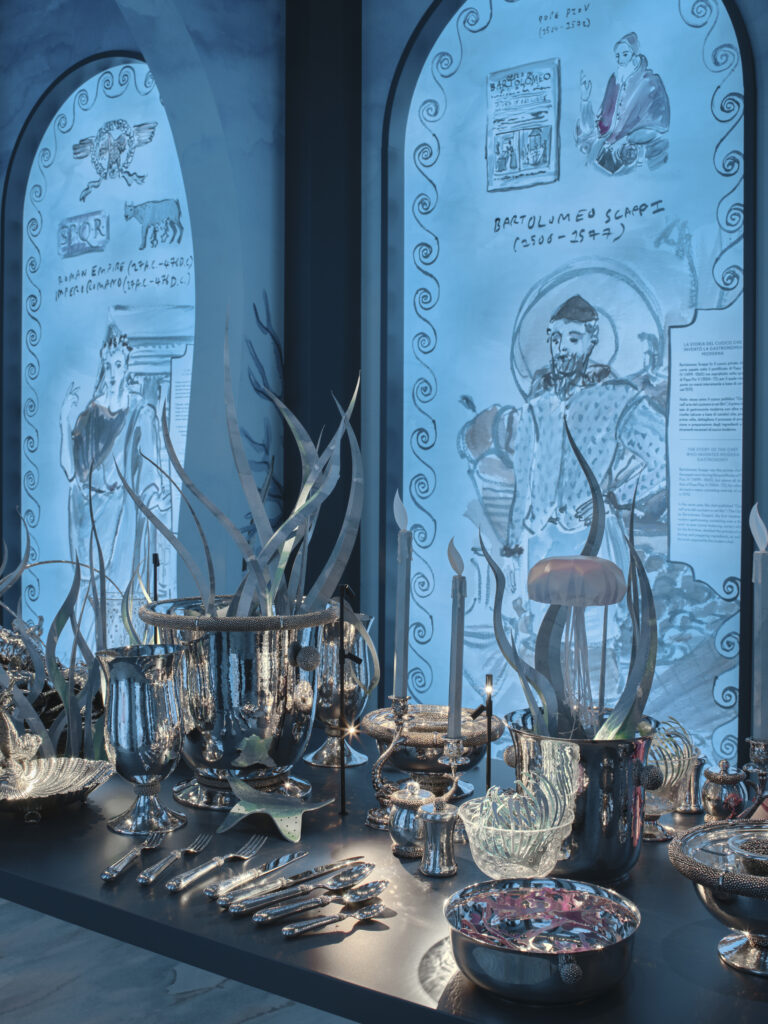 L’intervention d’Andrea Buccellati consiste moins à inventer qu’à réinterpréter. Le motif sphérique, déjà présent dans les archives de la Maison, est repris, ajusté, redéployé à l’échelle de la table. Cette continuité est revendiquée à travers une référence précise : le Cratere delle Muse, réalisé en 1981 par Gianmaria Buccellati, pièce unique en argent, or, jade et saphirs, aujourd’hui conservée par la Fondazione Gianmaria Buccellati.