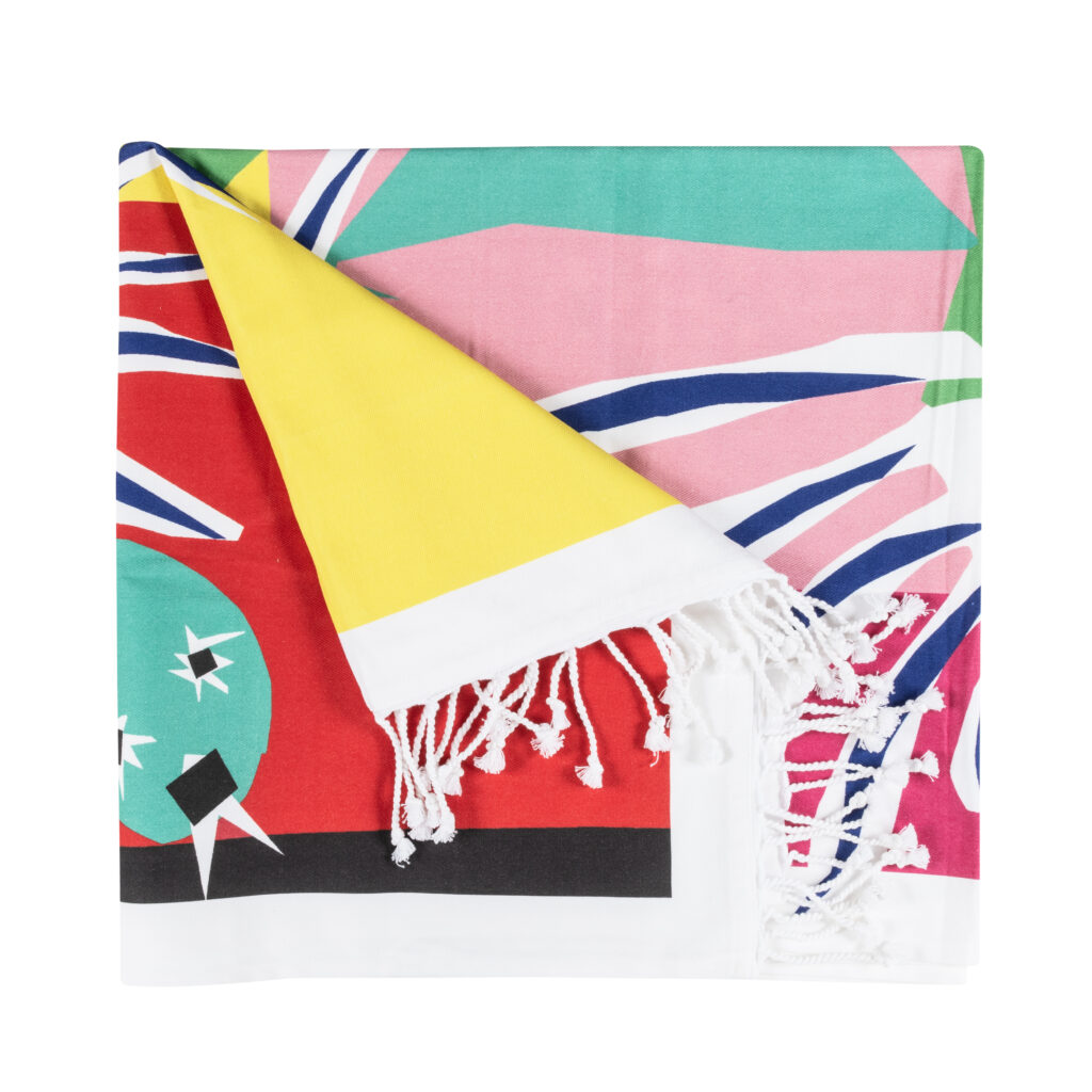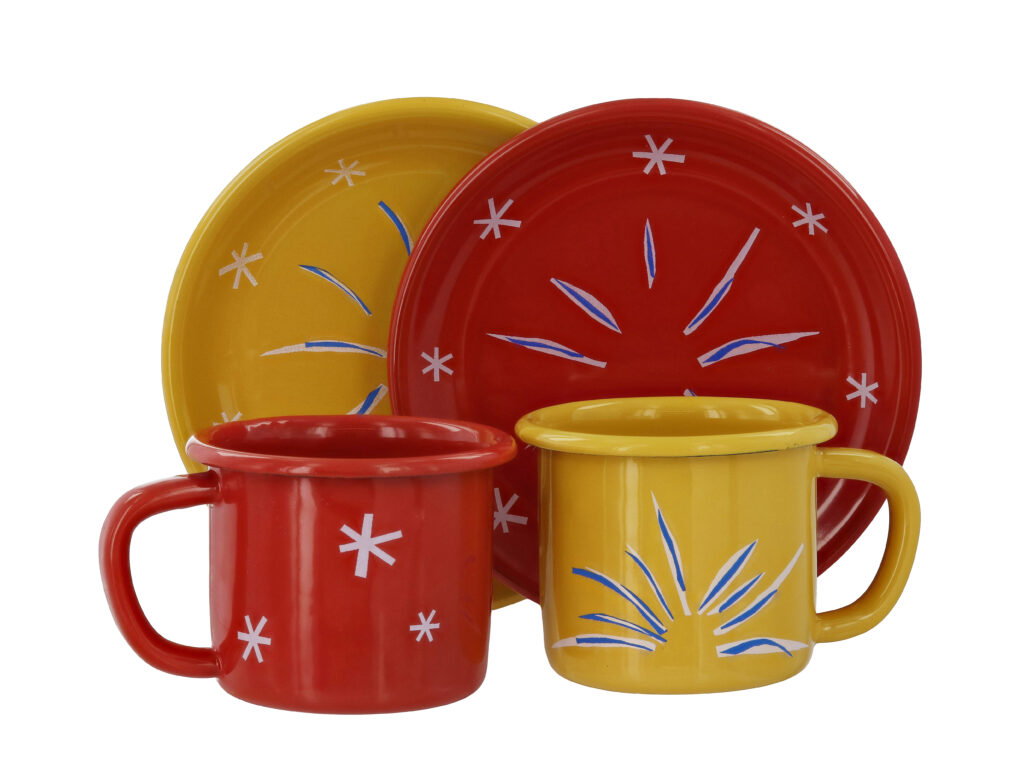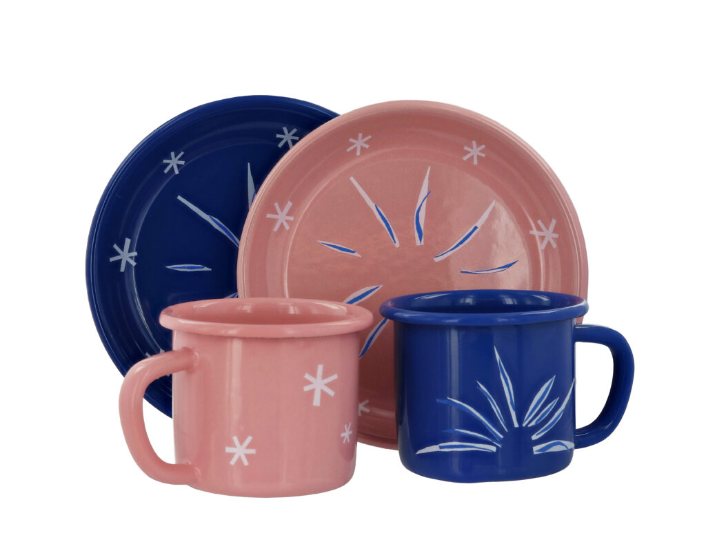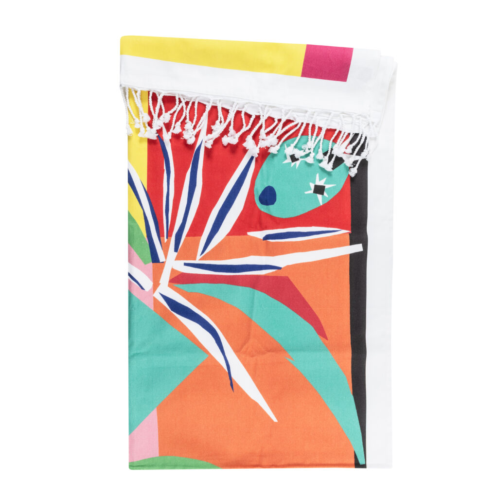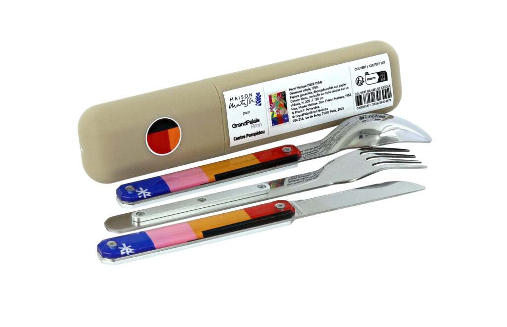 La collaboration avec la Maison Matisse introduit une dimension différente. Inspirée de La Danseuse créole, la collection Nomade s’inscrit dans un registre d’usage : assiettes émaillées, couverts aimantés, fouta, éventail.