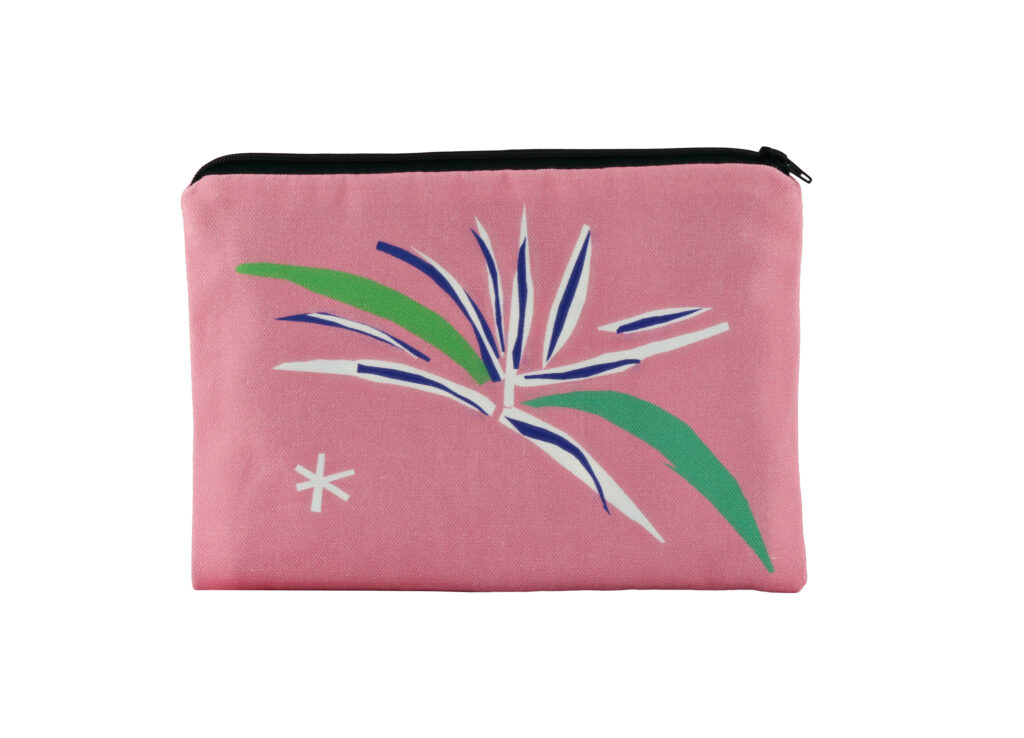Avec La Gerbe, le passage à l’objet se fait par saturation chromatique. Tote-bag, gourde ou textile deviennent des surfaces d’accueil pour une composition initialement murale.