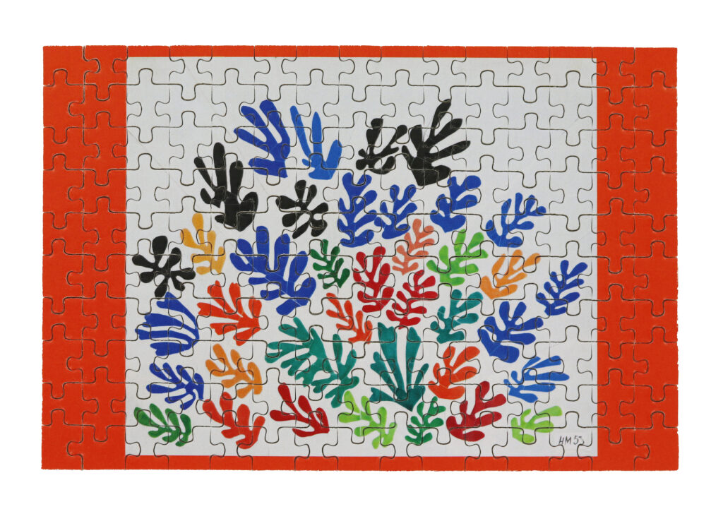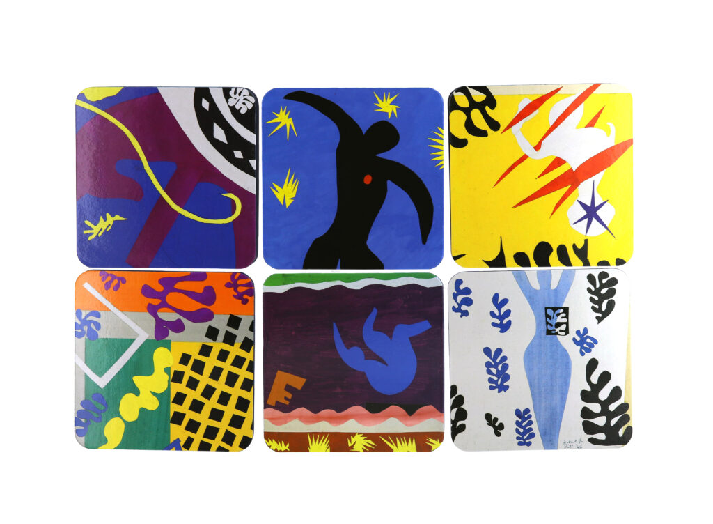 Cinq collections distinctes ; motifs issus des gouaches découpées et de l’album Jazz ; déclinaisons sur textile, papeterie, objets de table et accessoires ; collaboration avec la Maison Matisse pour la ligne Nomade ; exposition réunissant près de trois cents œuvres de 1941 à 1954.