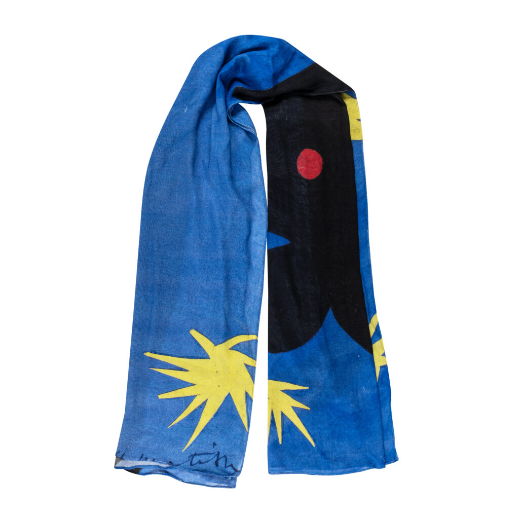 Ce qui change, c’est le contexte. Le motif quitte le mur pour accompagner des gestes — manger, transporter, se couvrir. L’œuvre devient environnement.