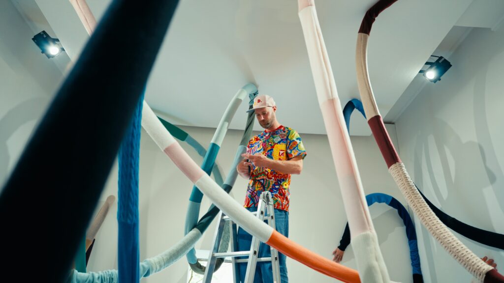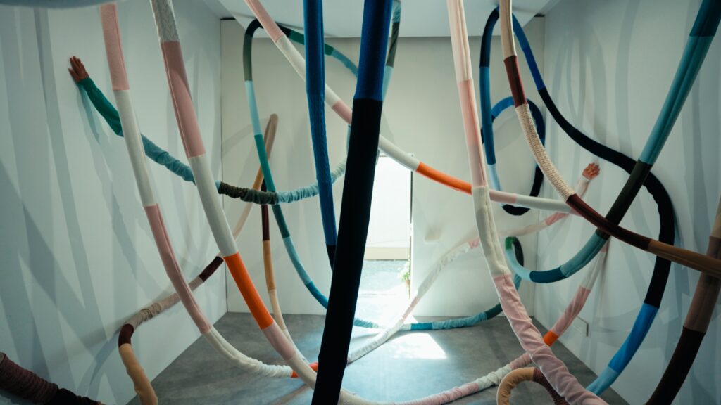 Ce point est central. Là où certaines installations textiles cherchent l’effet, Act of Embrace s’appuie sur une rigueur de construction. Le fil n’est pas décoratif. Il est structurel. La maille devient un système porteur, capable de définir des espaces sans recourir à des éléments extérieurs.